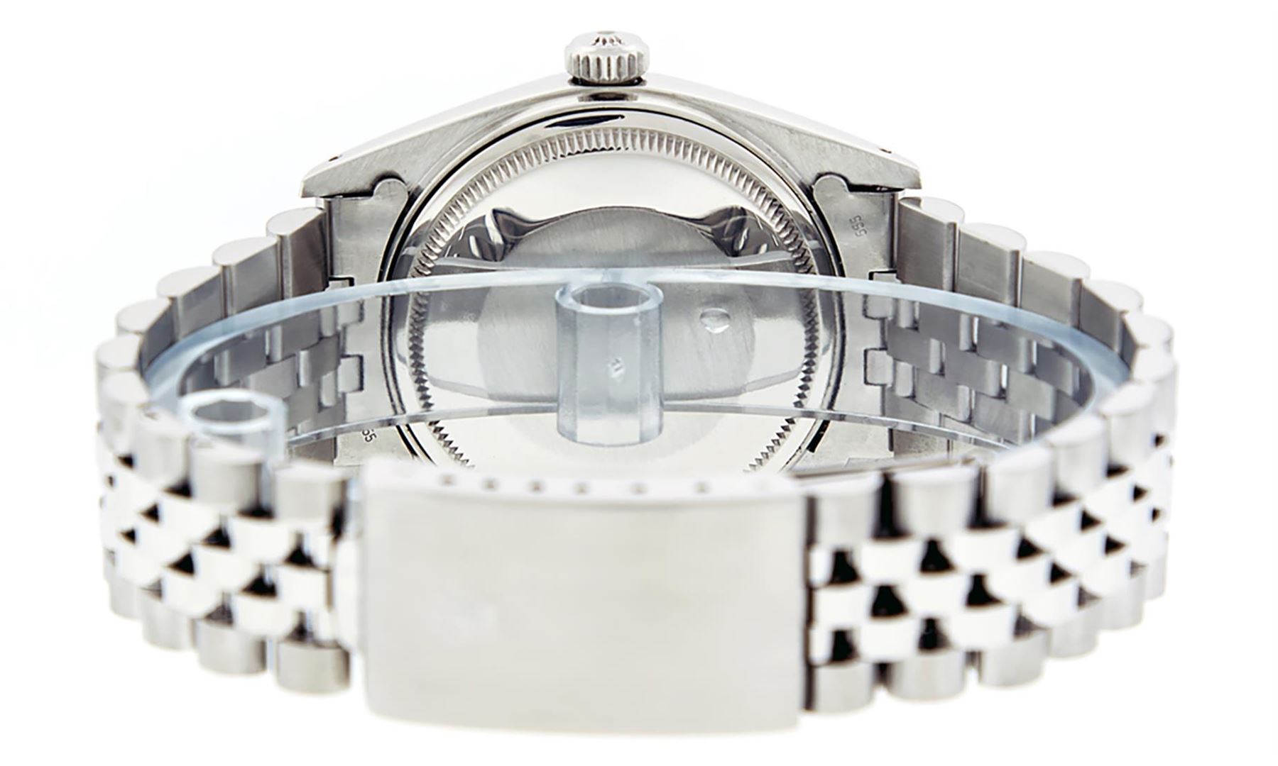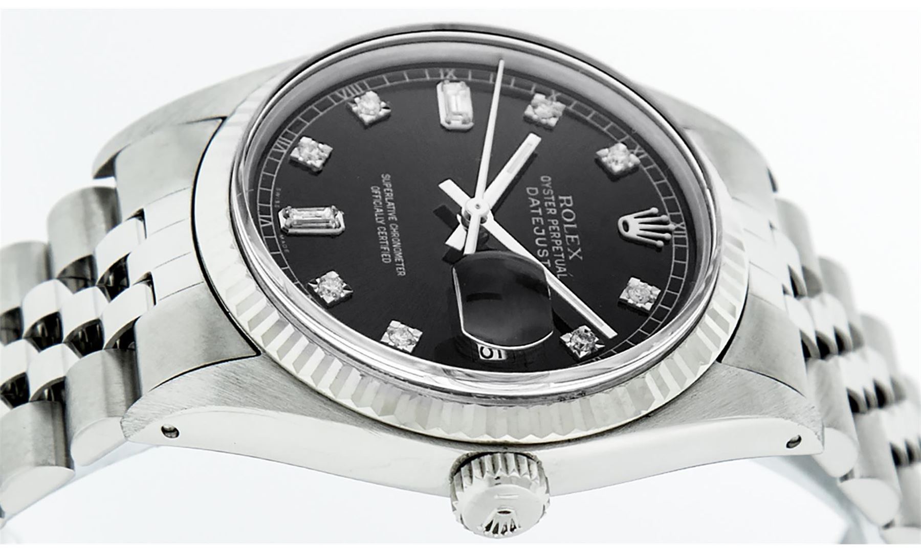One Mens Stainless Steel Rolex Datejust Polished Bright with Satin Finish, This Watch Has Been Serviced & Electronically Tested, Stainless Steel Case: 36mm, Stainless Steel Crown, Bezel: 14K White Gold Fluted Bezel. Custom Crystal: New Acrylic Cyclops Lens. Custom Hands: New Luminescent Hands. Movement: Automatic Winding Movement Caliber 3035. Custom Dial: Black Diamond 8 + 2 Dial With Roman Track, Diamond Count: 8 Diamonds + 2 Baguettes in Dial G To H In Color, SI-VS Clarity. Date Window: 3 O'Clock Position Date Display, Quickset, Model: Datejust, Condition: G-6 Extra Fine. Bracelet: Stainless Steel Jubilee Band. Bright Polish & Satin Finish. 7.0 Inch Length, Adjustable. Standard Clasp, With Rolex Logo. This Watch Has Been Serviced Time Tested And Is In Excellent Condition It Is Free Of All Scratches And Dents.