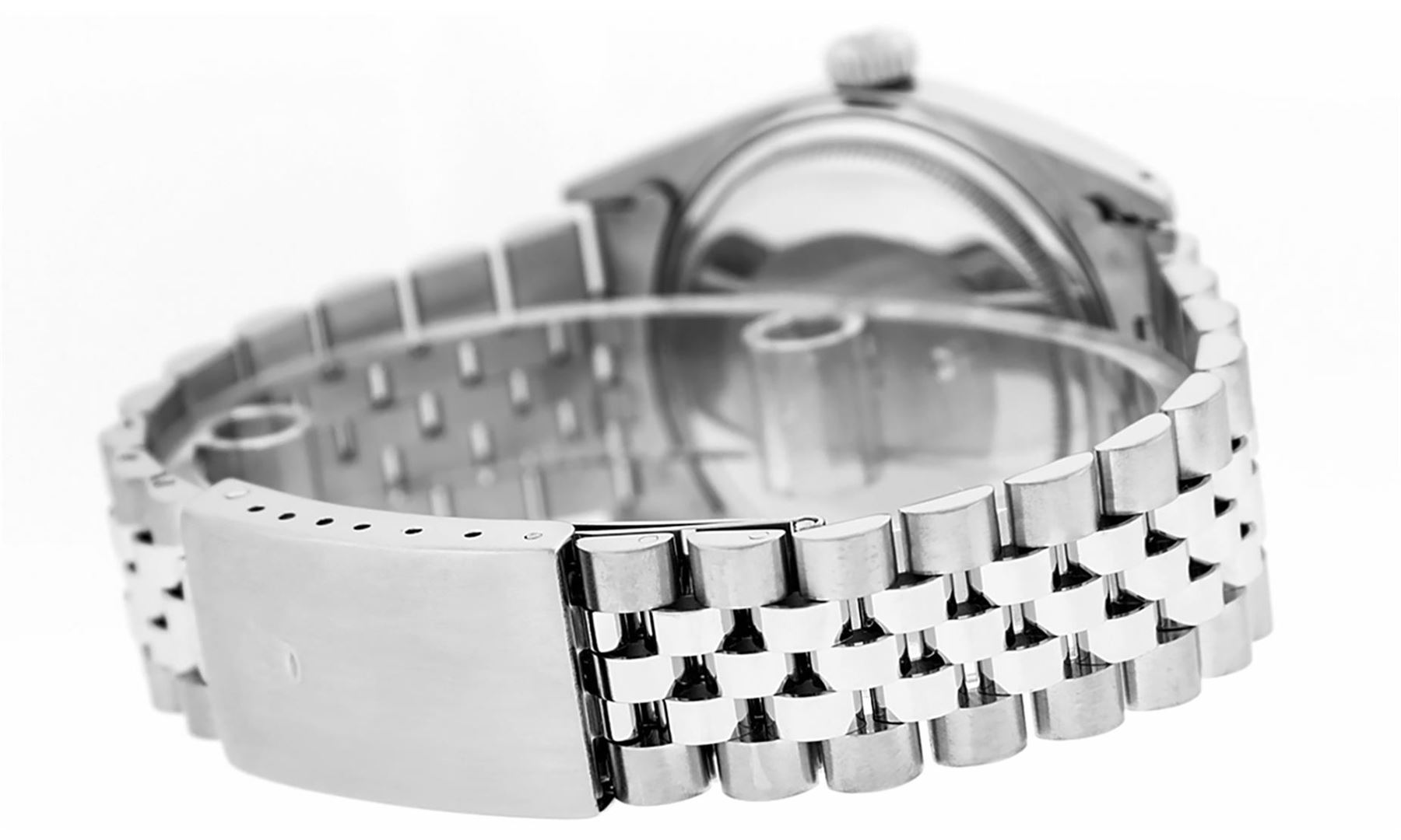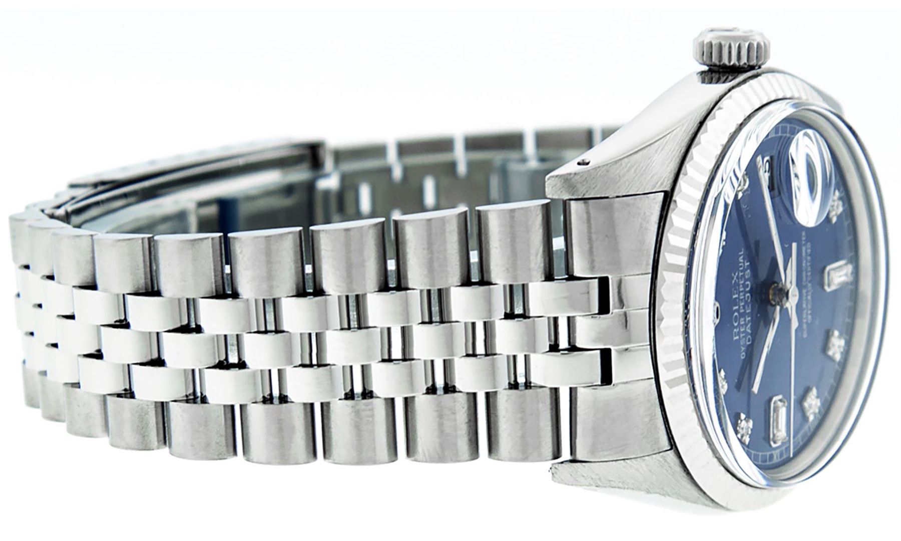 One Mens Stainless Steel Rolex Datejust Polished Bright with Satin Finish, This Watch Has Been Serviced & Electronically Tested, Stainless Steel Case: 36mm, Stainless Steel Crown, Bezel: 14K White Gold Fluted Bezel. Custom Crystal: New Acrylic Cyclops Lens. Custom Hands: New Luminescent Hands. Movement: Automatic Winding Movement Caliber 3035. Custom Dial: Blue Diamond Dial With Diamond Hour Markers, Diamond Count: 8 Diamonds + 2 Diamond Baguettes in Dial, G To H In Color, SI-VS Clarity. Date Window: 3 O'Clock Position Date Display, Quickset, Model: Datejust, Condition: G-6 Extra Fine. Bracelet: Stainless Steel Jubilee. Bright Polish & Satin Finish. 7.0 Inch Length, Adjustable. Standard Clasp, With Rolex Logo. This Watch Has Been Serviced Time Tested And Is In Excellent Condition It Is Free Of All Scratches And Dents