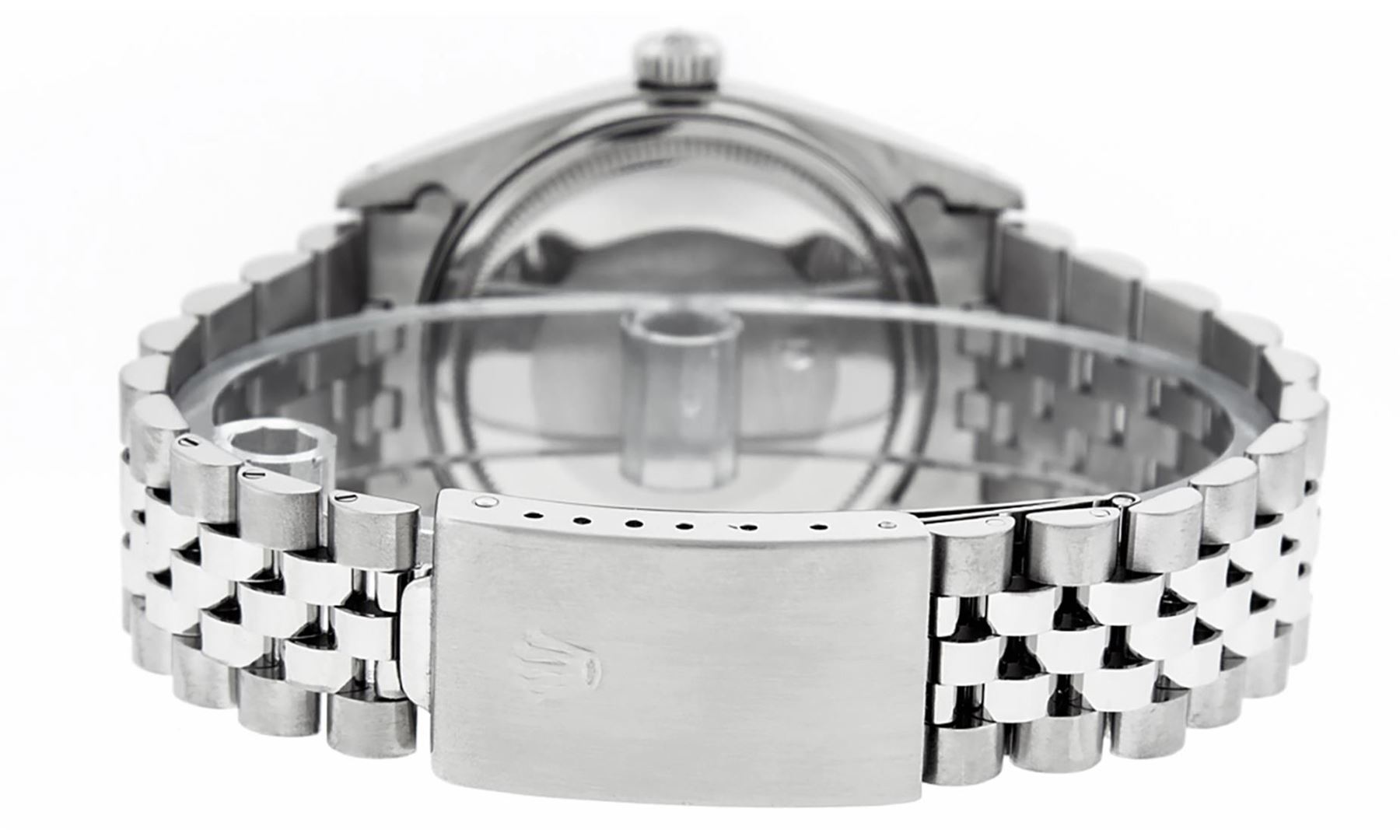 One Mens Pre Owned Stainless Steel Rolex Datejust Polished Bright with Satin Finish, This Watch Has Been Serviced And Electronically Tested, Rolex Stainless Steel Case: 36mm, Rolex Stainless Steel Crown, Rolex Bezel: 14K White Gold Fluted Bezel. Custom Crystal: New Acrylic With Magnified Date Window. Custom Hands: New Luminescent Hands. Rolex Movement: Automatic Winding Movement 3035. Custom Dial: Custom Blue Dial With Added Diamonds, Diamond Count: 8 Diamonds + 2 Diamond Baguettes in Dial. Date Window: 3 O'Clock Position Date Display, Quickset, Model: Datejust, Condition: G-6 Extra Fine. Rolex Bracelet: Stainless Steel Jubilee Band. Bright Polish And Satin Finish. 7.0 Inch Length, Adjustable. Standard Clasp, With Rolex Logo. This Watch Has Been Serviced Time Tested And Is In Excellent Condition It Is Free Of All Scratches And Dents.