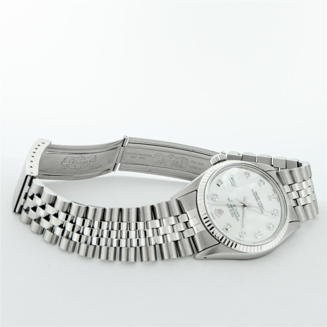 One Mens Pre Owned Stainless Steel Rolex Datejust Polished Bright with Satin Finish, This Watch Has Been Serviced & Electronically Tested, Rolex Stainless Steel Case: 36mm, Rolex Stainless Steel Crown, Rolex Bezel: 14K White Gold Fluted Bezel. Custom Crystal: New Acrylic Cyclops Lens. Custom Hands: New Luminescent Hands. Rolex Movement: Automatic Winding Movement. Custom Dial: Refinished Mother Of Pearl Diamond Dial With Added Diamond Hour Markers, Diamond Count: 10 Diamonds in Dial G To H In Color, SI-VS Clarity. Date Window: 3 O'Clock Position Date Display, Quickset, Model: Datejust, Condition: G-6 Extra Fine. Rolex Bracelet: Stainless Steel Jubilee Band. Bright Polish & Satin Finish. 7.0 Inch Length, Adjustable. Standard Clasp, With Rolex Logo. This Watch Has Been Serviced Time Tested And Is In Excellent Condition It Is Free Of All Scratches And Dents.