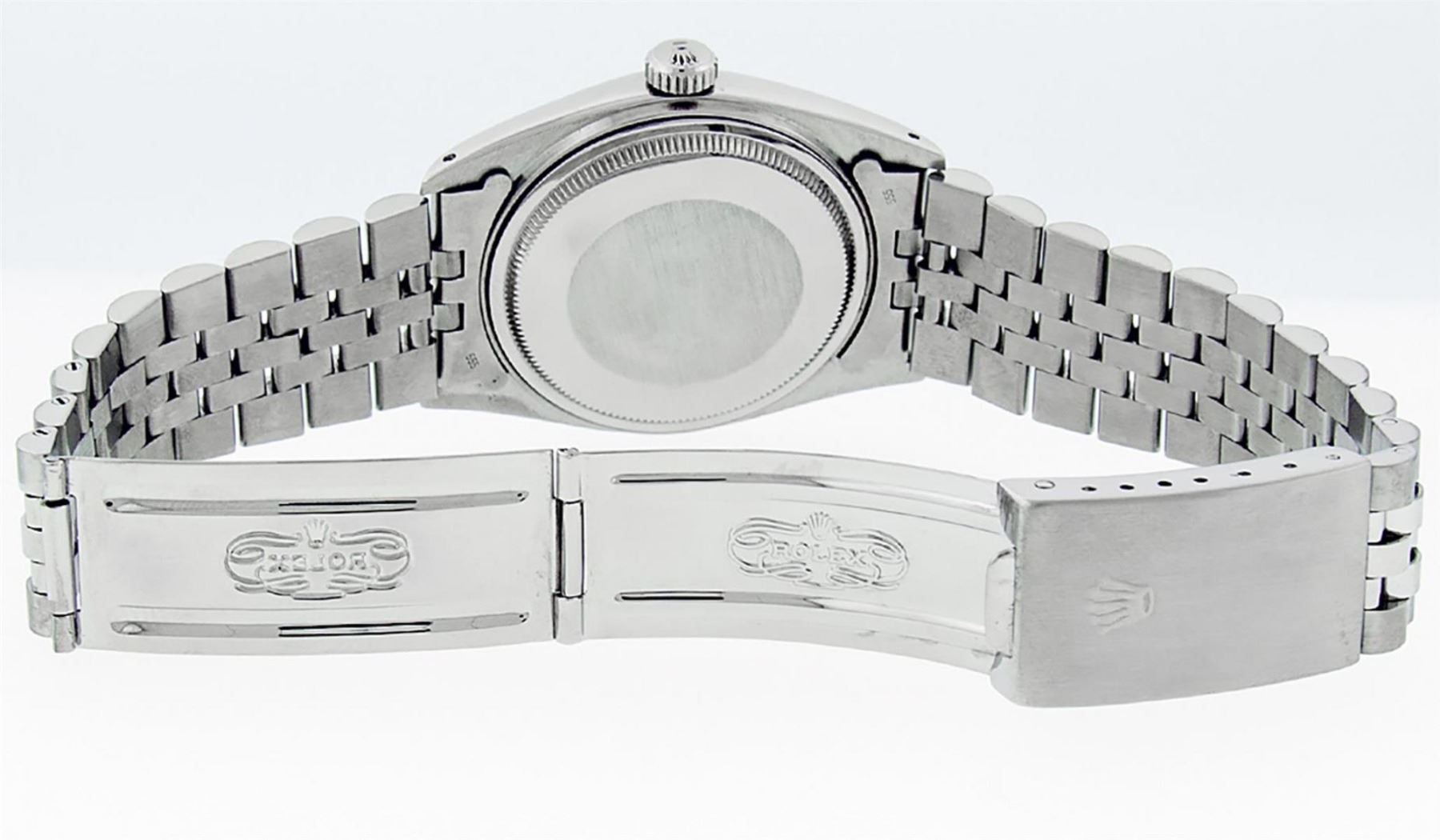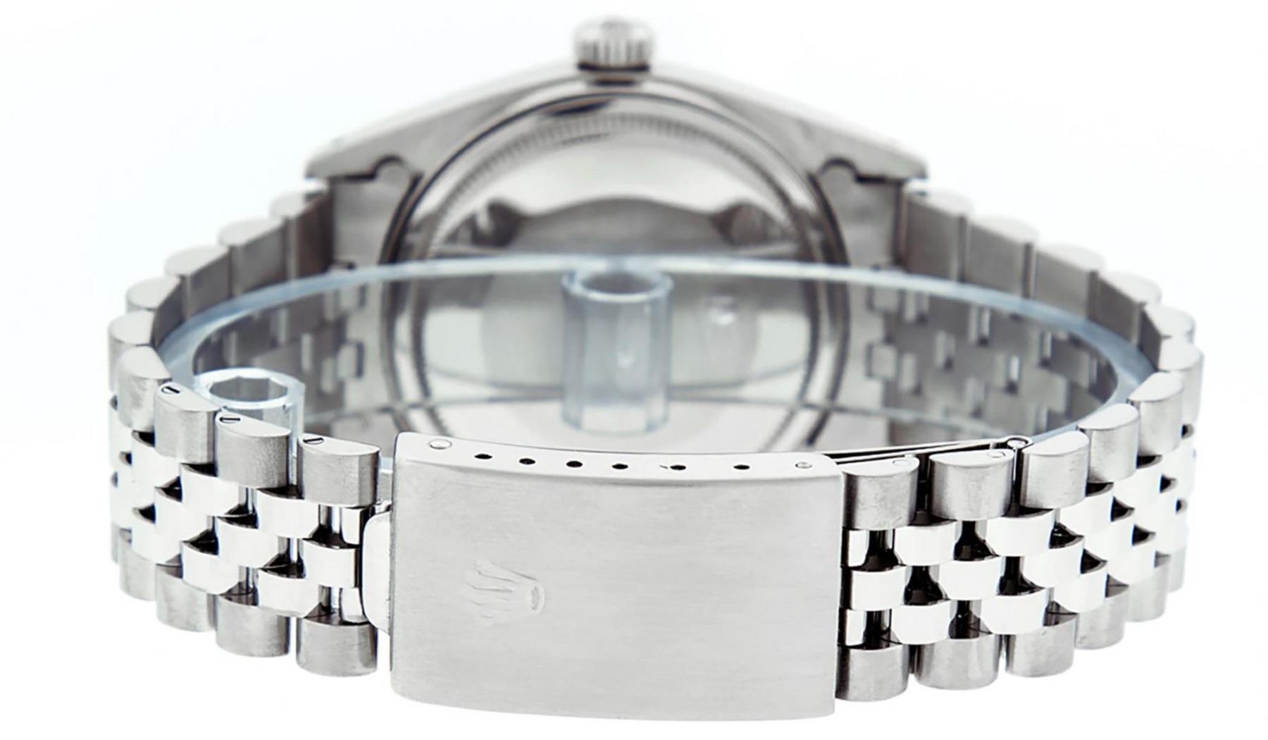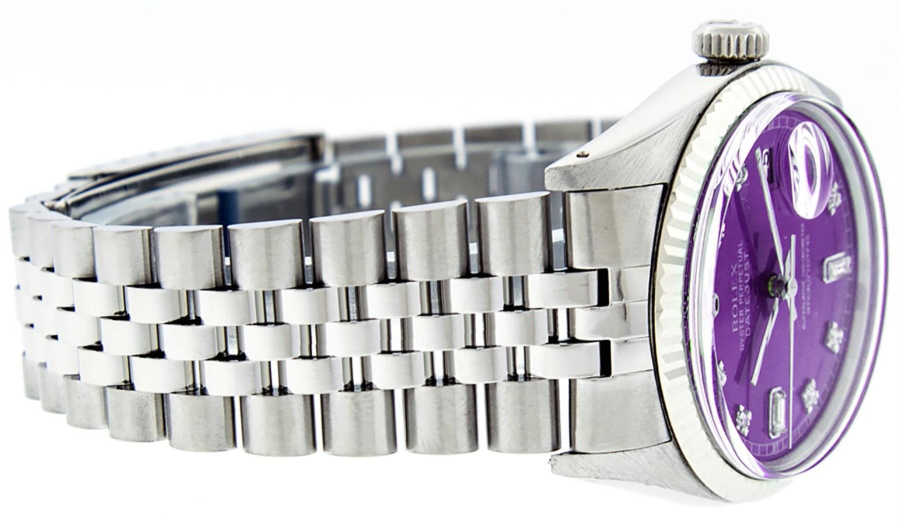 One Mens Stainless Steel Rolex Datejust Polished Bright with Satin Finish, This Watch Has Been Serviced & Electronically Tested, Stainless Steel Case: 36mm, Stainless Steel Crown, Bezel: 14K White Gold Fluted Bezel. Custom Crystal: New Acrylic Cyclops Lens. Custom Hands: New Luminescent Hands. Movement: Automatic Winding Movement. Custom Dial: Purple Diamond 8 + 2 Dial With Roman Track, Diamond Count: 8 Diamonds + 2 Baguettes in Dial G To H In Color, SI-VS Clarity. Date Window: 3 O'Clock Position Date Display, Quickset, Model: Datejust, Condition: G-6 Extra Fine. Bracelet: Stainless Steel Jubilee Band. Bright Polish & Satin Finish. 7.0 Inch Length, Adjustable. Standard Clasp, With Rolex Logo. This Watch Has Been Serviced Time Tested And Is In Excellent Condition It Is Free Of All Scratches And Dents.
