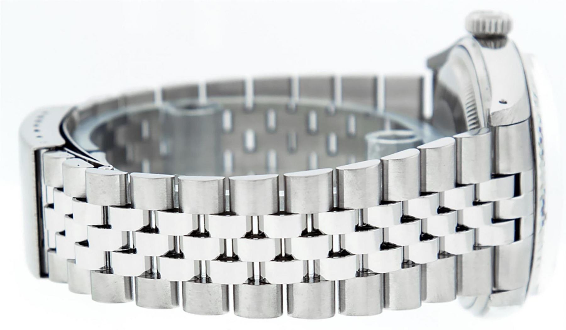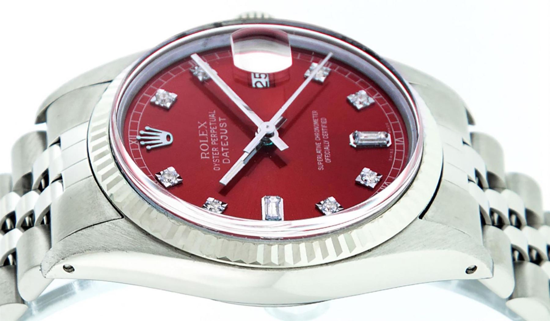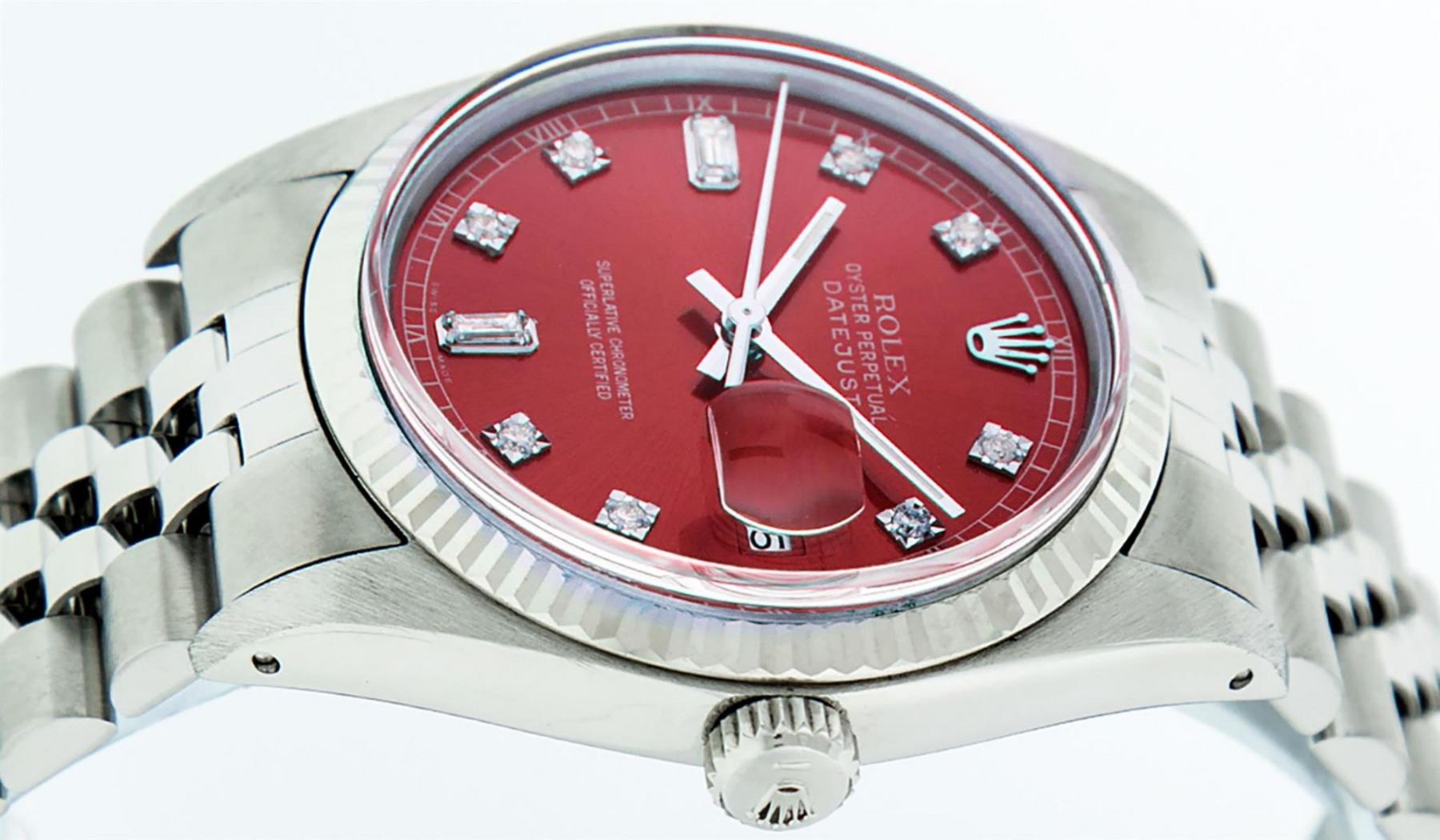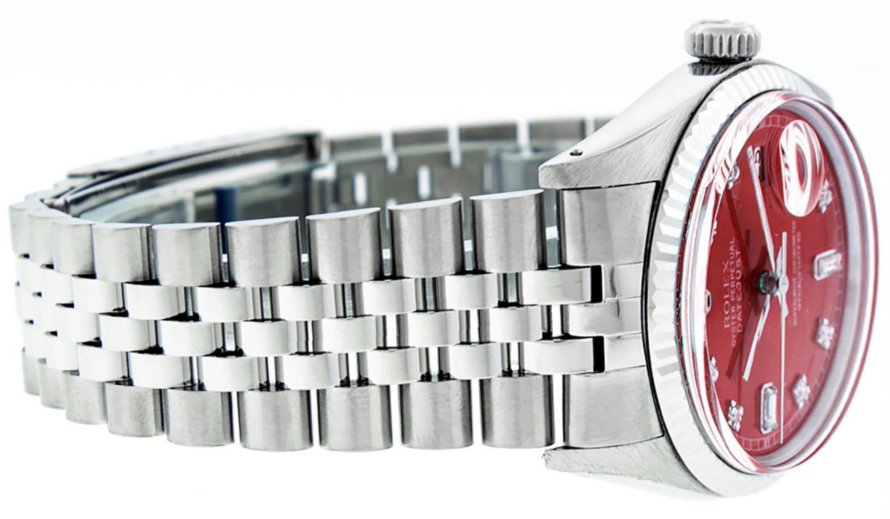 One Mens Stainless Steel Rolex Datejust Polished Bright with Satin Finish, This Watch Has Been Serviced & Electronically Tested, Stainless Steel Case: 36mm, Stainless Steel Crown, Bezel: 14K White Gold Fluted Bezel. Custom Crystal: New Acrylic Cyclops Lens. Custom Hands: New Luminescent Hands. Movement: Automatic Winding Movement Caliber 3035. Custom Dial: Red Diamond 8 + 2 Dial With Roman Track, Diamond Count: 8 Diamonds + 2 Baguettes in Dial G To H In Color, SI-VS Clarity. Date Window: 3 O'Clock Position Date Display, Quickset, Model: Datejust, Condition: G-6 Extra Fine. Bracelet: Stainless Steel Jubilee Band. Bright Polish & Satin Finish.�7.0 Inch Length, Adjustable. Standard Clasp, With Rolex Logo. This Watch Has Been Serviced Time Tested And Is In Excellent Condition It Is Free Of All Scratches And Dents.