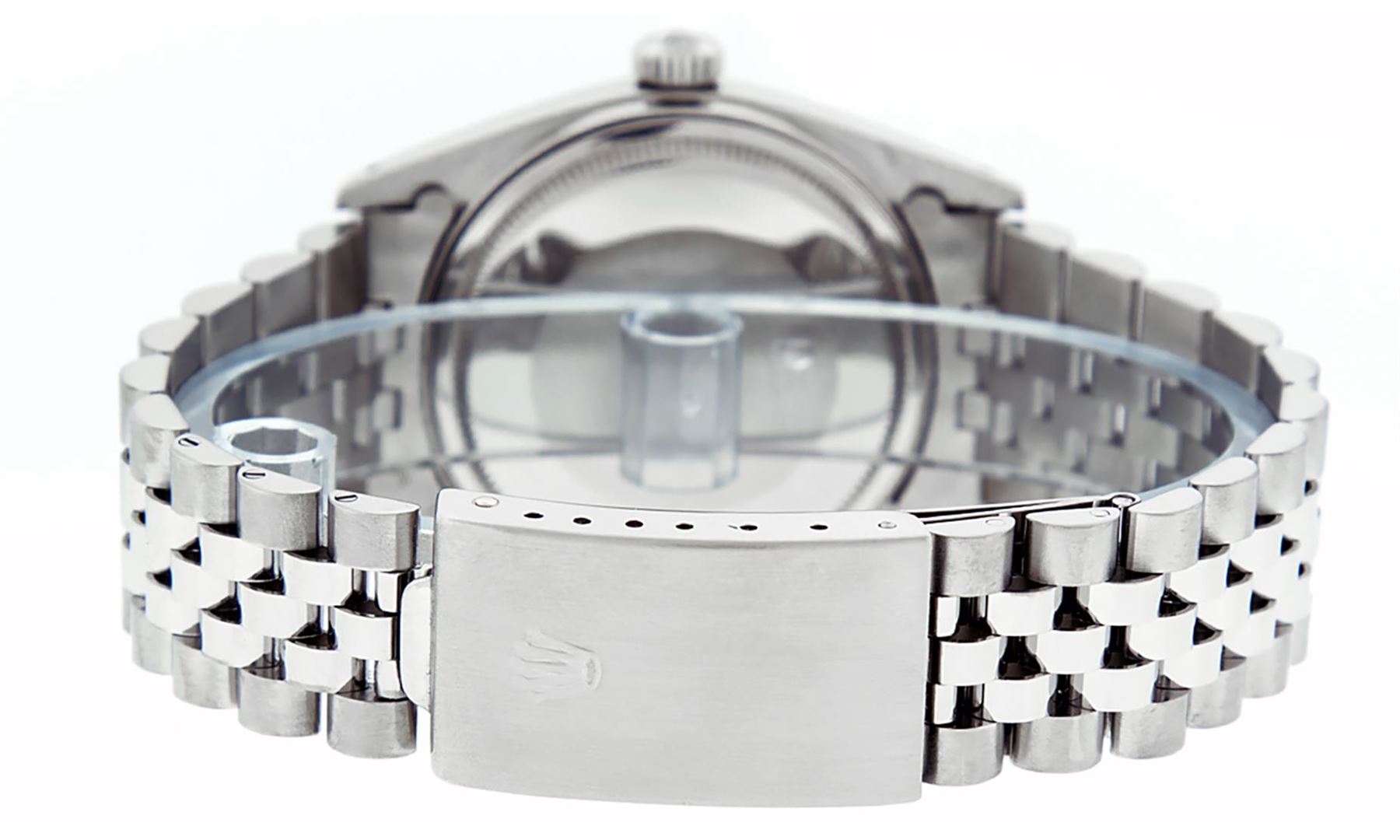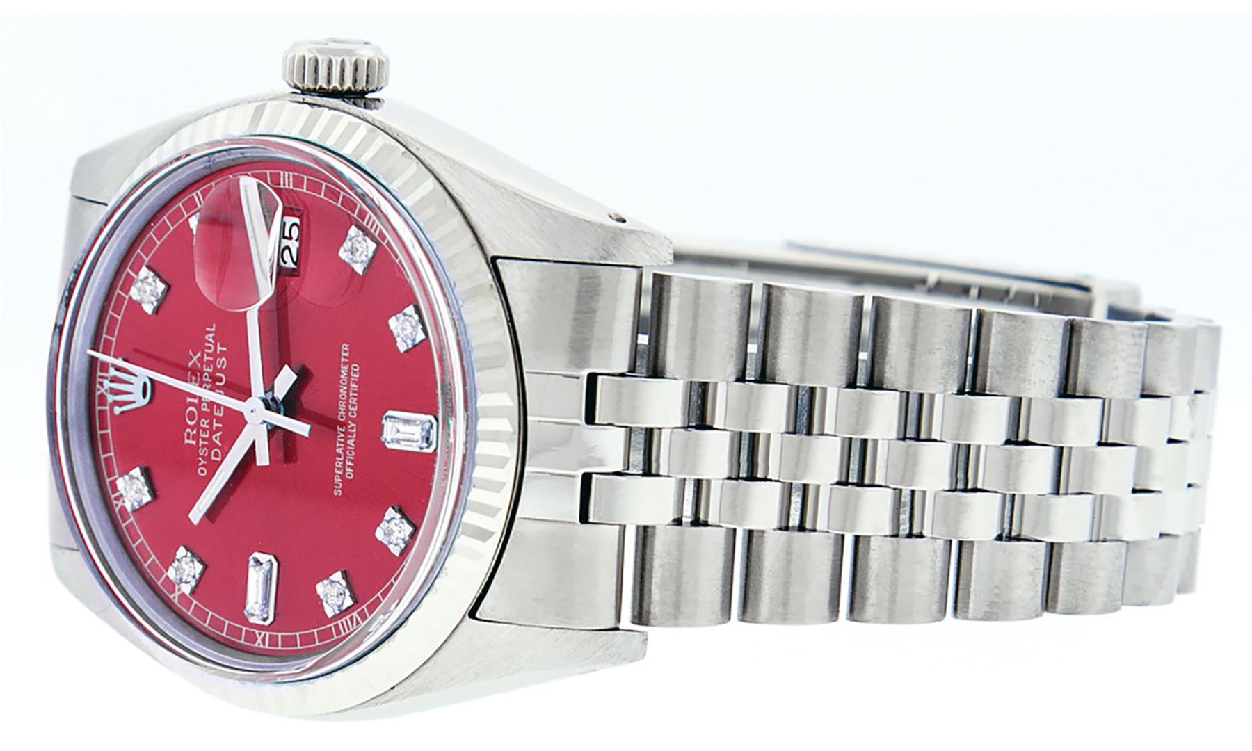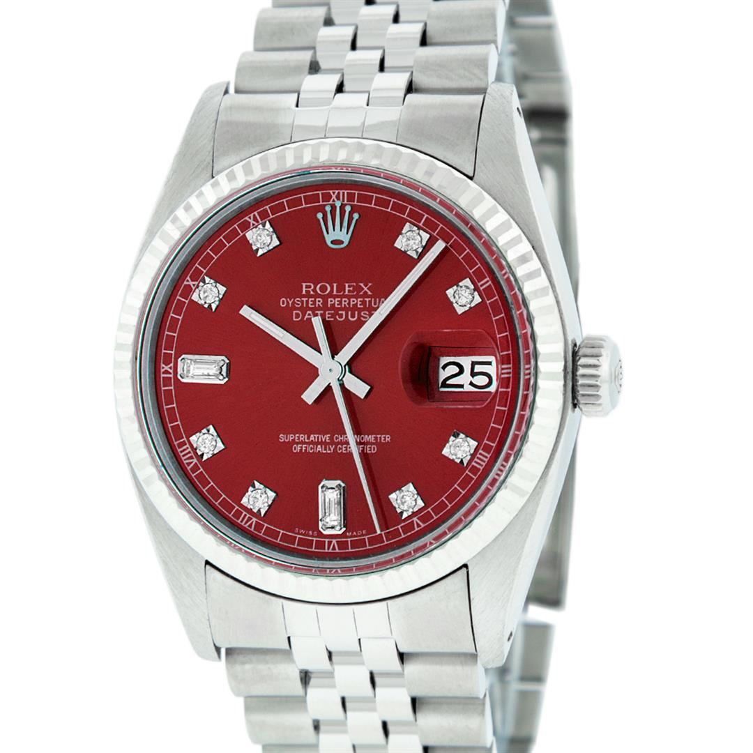 One Mens Stainless Steel Rolex Datejust Polished Bright with Satin Finish, This Watch Has Been Serviced & Electronically Tested, Stainless Steel Case: 36mm, Stainless Steel Crown, Bezel: 14K White Gold Fluted Bezel. Custom Crystal: New Acrylic Cyclops Lens. Custom Hands: New Luminescent Hands. Movement: Automatic Winding Movement Caliber 3035. Custom Dial: Red Diamond 8 + 2 Dial With Roman Track, Diamond Count: 8 Diamonds + 2 Baguettes in Dial G To H In Color, SI-VS Clarity. Date Window: 3 O'Clock Position Date Display, Quickset, Model: Datejust, Condition: G-6 Extra Fine. Bracelet: Stainless Steel Jubilee Band. Bright Polish & Satin Finish. 7.0 Inch Length, Adjustable. Standard Clasp, With Rolex Logo. This Watch Has Been Serviced Time Tested And Is In Excellent Condition It Is Free Of All Scratches And Dents.