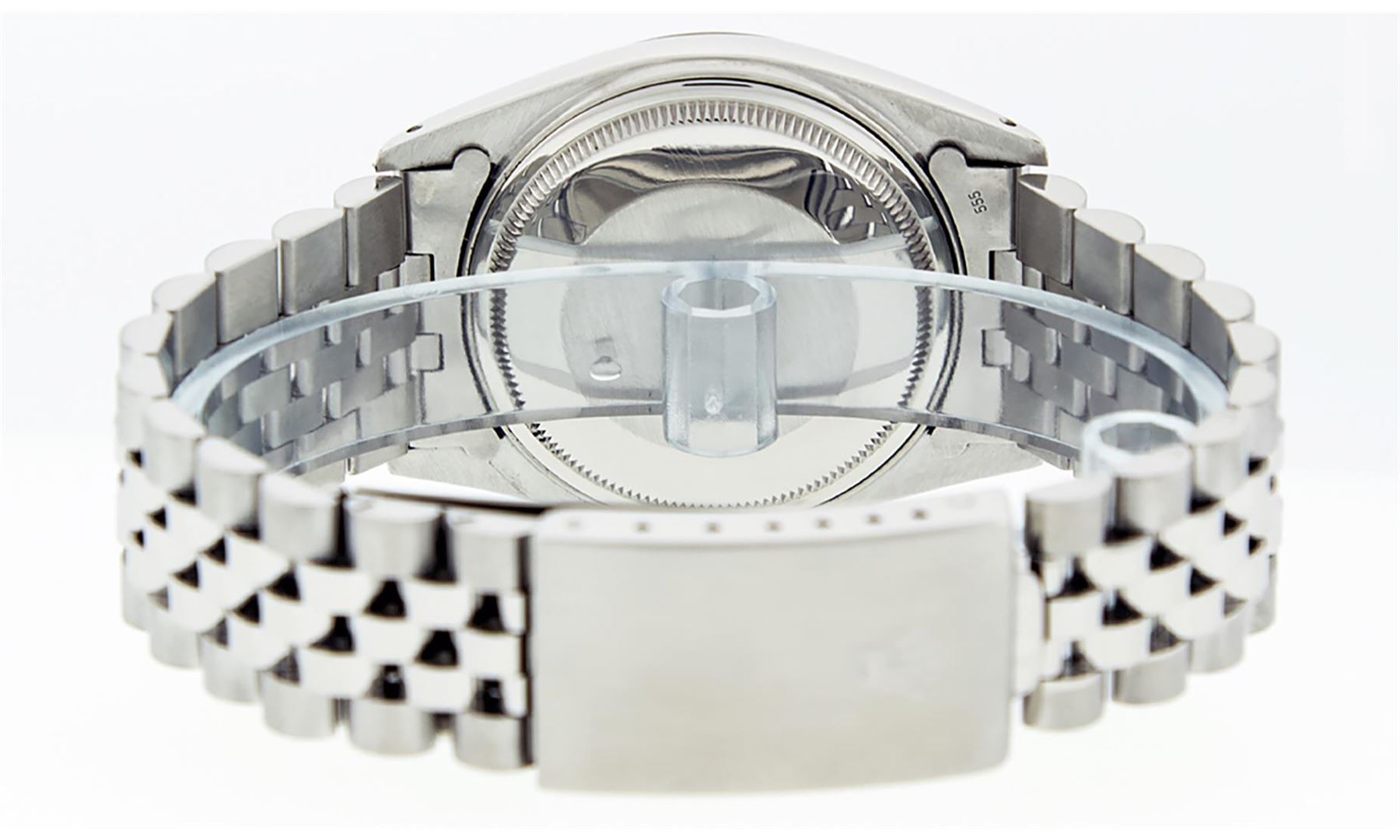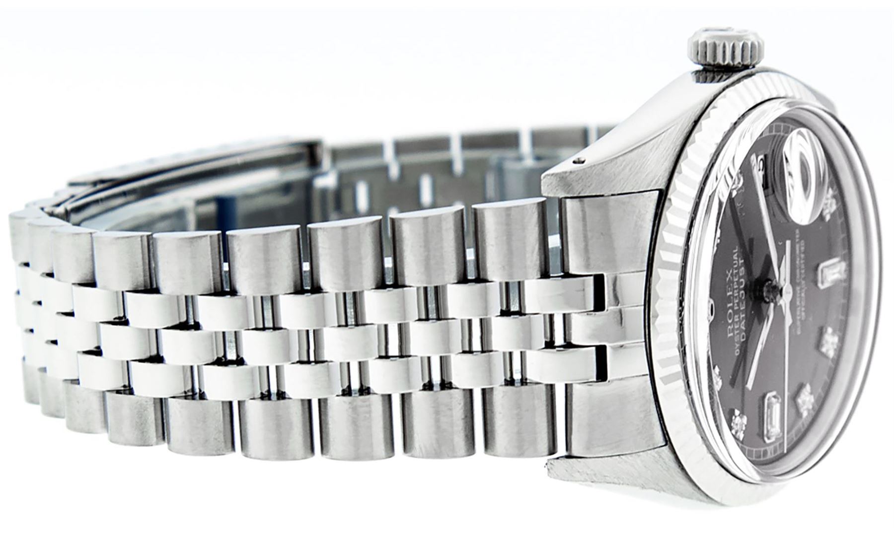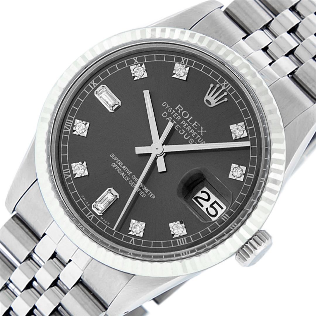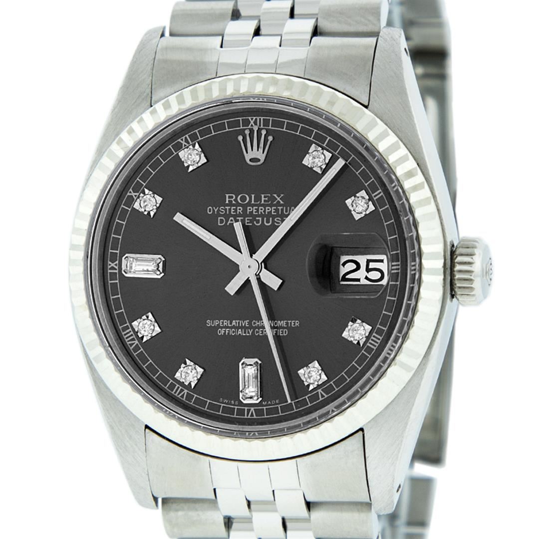 One Mens Stainless Steel Pre Owned Rolex Datejust Polished Bright with Satin Finish, This Watch Has Been Serviced & Electronically Tested, Rolex Stainless Steel Case: 36mm, Rolex Stainless Steel Crown, Rolex Bezel: 14K White Gold Fluted Bezel. Custom Crystal: New Acrylic Cyclops Lens. Custom Hands: New Luminescent Hands. Rolex Movement: Automatic Winding Movement. Custom Dial: Refinished To Gray With Custom Added Genuine Diamonds, Diamond Count: 8 Diamonds + 2 Baguettes in Dial G To H In Color, SI-VS Clarity. Date Window: 3 O'Clock Position Date Display, Quickset, Model: Datejust, Condition: G-6 Extra Fine. Rolex Bracelet: Stainless Steel Jubilee Band. Bright Polish & Satin Finish. 7.0 Inch Length, Adjustable. Standard Clasp, With Rolex Logo. This Watch Has Been Serviced Time Tested And Is In Excellent Condition It Is Free Of All Scratches And Dents.