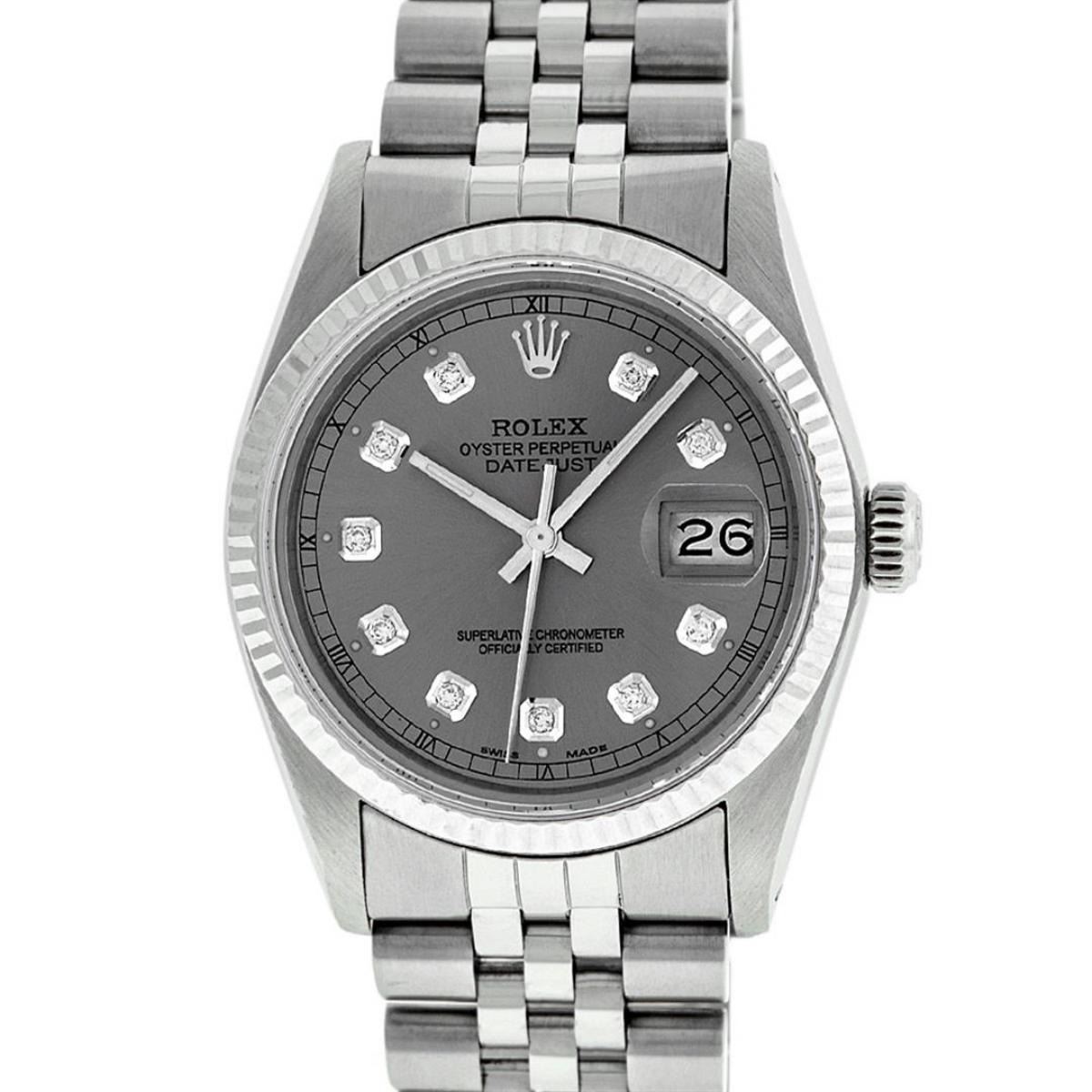 One Mens Stainless Steel Rolex Datejust Polished Bright with Satin Finish, This Watch Has Been Serviced & Electronically Tested, Stainless Steel Case: 36mm, Stainless Steel Crown, Bezel: 14K White Gold Fluted Bezel. Custom Crystal: New Acrylic Cyclops Lens. Custom Hands: New Luminescent Hands. Movement: Automatic Winding Movement Caliber 3035. Custom Dial: Slate Grey Diamond Dial With Diamond Hour Markers And Roman Track, Diamond Count: 10 Diamonds in Dial G To H In Color, SI-VS Clarity. Date Window: 3 O'Clock Position Date Display, Quickset, Model: Datejust, Condition: G-6 Extra Fine. Bracelet: Stainless Steel Jubilee. Bright Polish & Satin Finish. 7.0 Inch Length, Adjustable. Standard Clasp, With Rolex Logo. This Watch Has Been Serviced Time Tested And Is In Excellent Condition It Is Free Of All Scratches And Dents