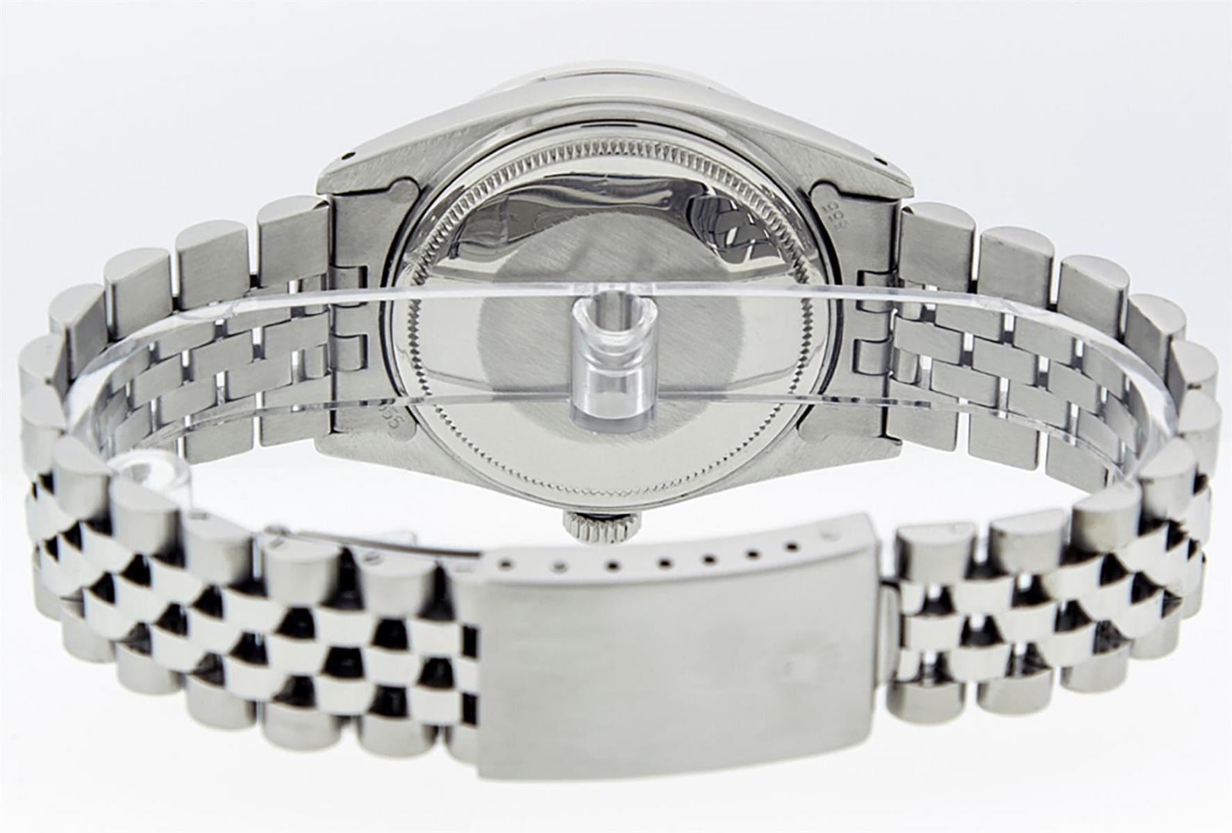 One Mens Stainless Steel Rolex Datejust Polished Bright with Satin Finish, This Watch Has Been Serviced & Electronically Tested, Stainless Steel Case: 36mm, Stainless Steel Crown, Bezel: 14K White Gold Fluted Bezel. Custom Crystal: New Acrylic Cyclops Lens. Custom Hands: New Luminescent Hands. Movement: Automatic Winding Movement Caliber 3035. Custom Dial: Slate Grey Diamond Dial With Diamond Hour Markers And Roman Track, Diamond Count: 10 Diamonds in Dial G To H In Color, SI-VS Clarity. Date Window: 3 O'Clock Position Date Display, Quickset, Model: Datejust, Condition: G-6 Extra Fine. Bracelet: Stainless Steel Jubilee. Bright Polish & Satin Finish. 7.0 Inch Length, Adjustable. Standard Clasp, With Rolex Logo. This Watch Has Been Serviced Time Tested And Is In Excellent Condition It Is Free Of All Scratches And Dents