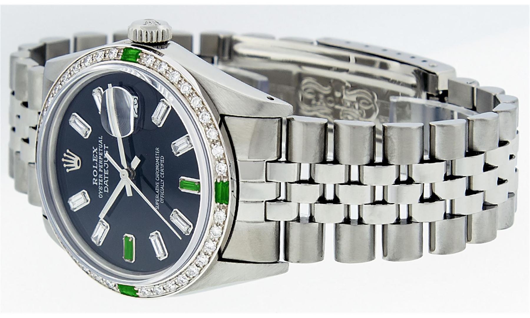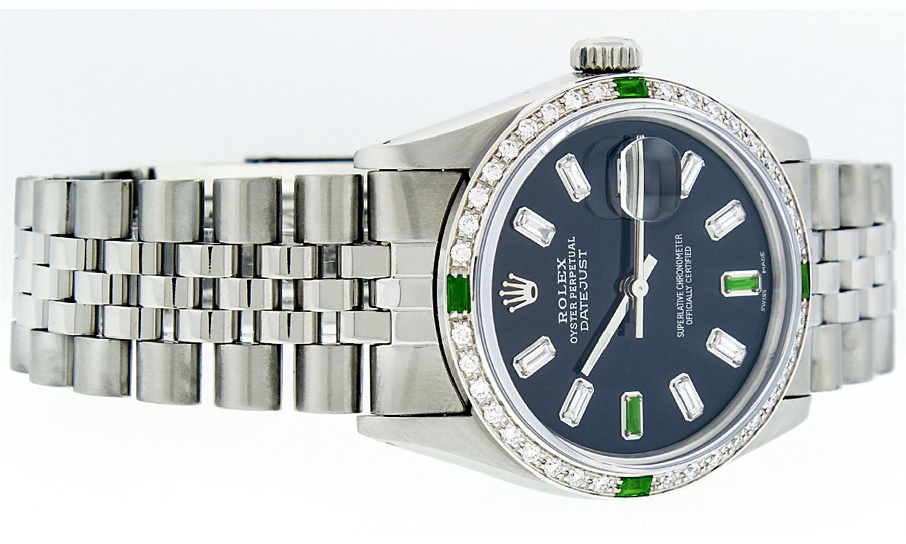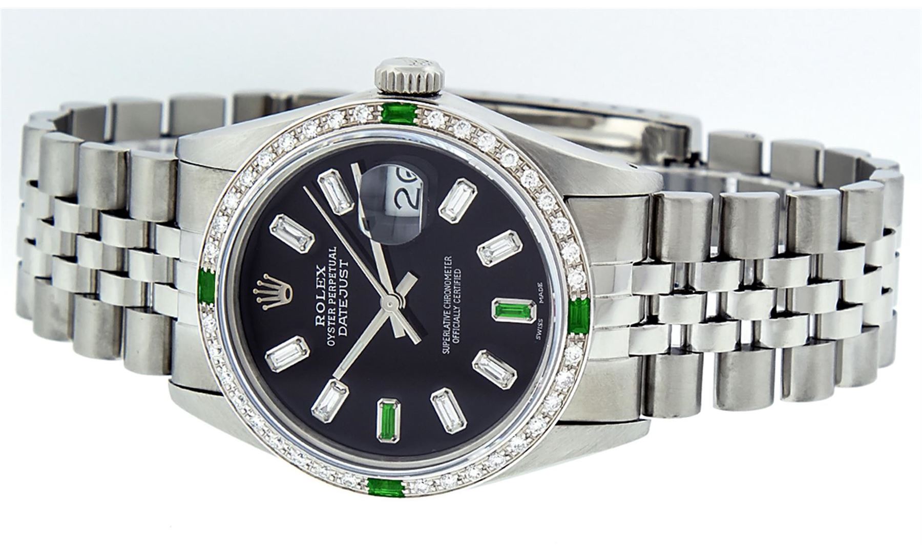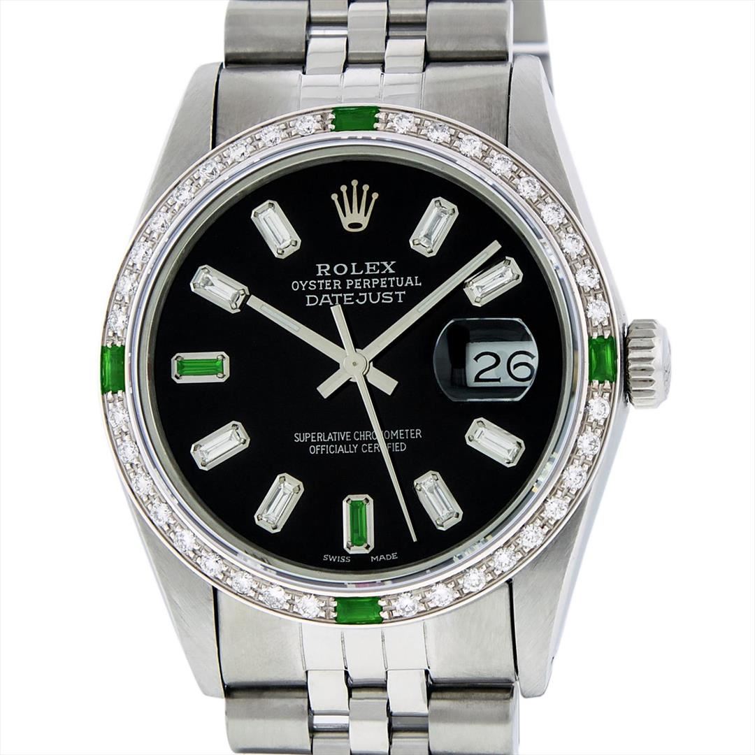 One Gents Rolex Datejust Polished, Serviced & Electronically Tested, Stainless Steel Case:36mm, Stainless Steel Crown, Custom Bezel: 18K White Gold Emerald Beadset Diamond Bezel, Diamond + Gem Count: 36 Diamonds + 4 Emeralds, Total Weight 1.00 Carat, Clarity: SI-VS, Color: G to H. Custom Crystal: Synthetic Sapphire Cyclops Lens. Movement: Automatic Winding Movement Caliber 3035. Custom Dial: Black Baguette + 2 Emerald Baguette Diamond Hour Markers, Stone Count: 8 Diamonds + 2 Emerald Baguette. G To H In Color, Clarity: SI-VS. Date Window: 3 O'Clock Position Date Display, Quickset, Model: Datejust. Condition: G-6 Extra Fine. Bracelet: Stainless Steel Jubilee Band. Bright Polish & Satin Finish. 6.5 Inch Length, Adjustable. Standard Clasp, With Rolex Logo