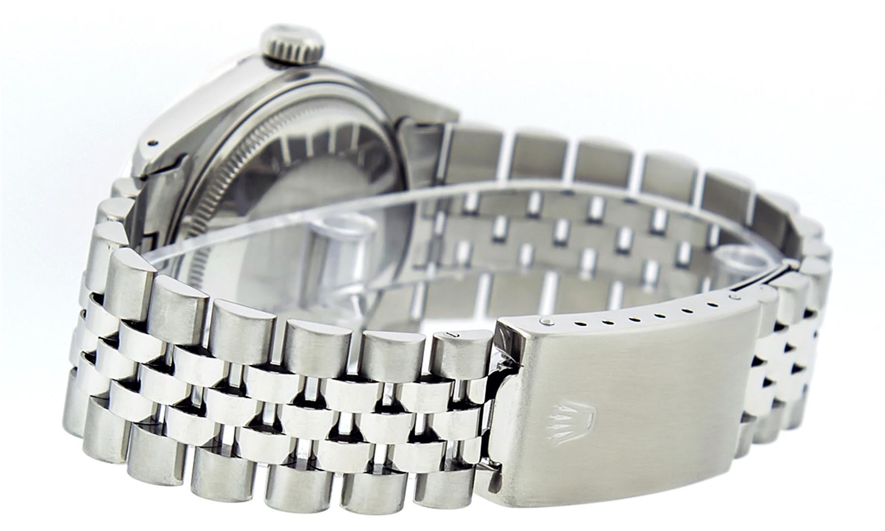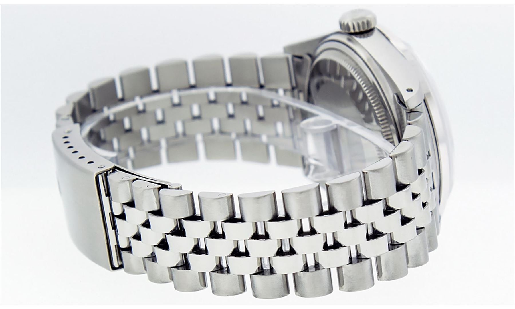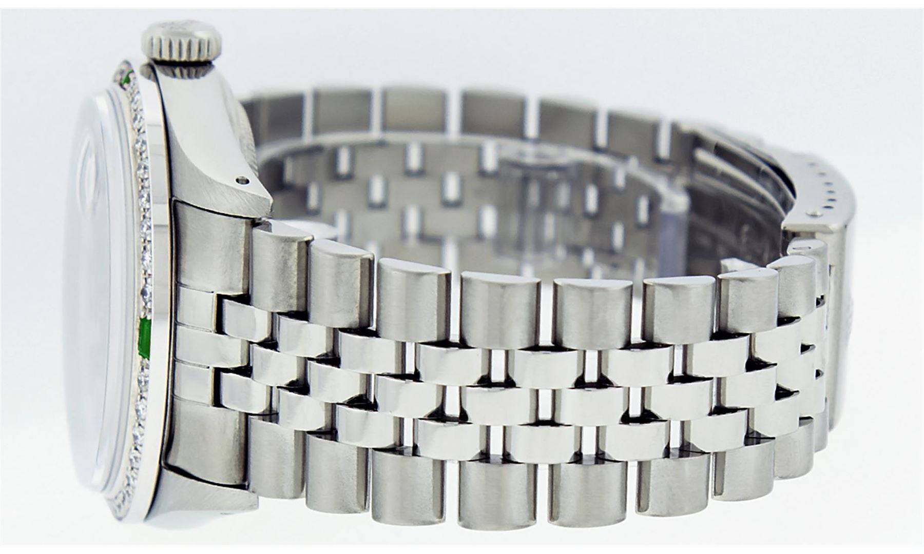 One Gents Rolex Datejust Polished, Serviced & Electronically Tested, Stainless Steel Case:36mm, Stainless Steel Crown, Custom Bezel: 18K White Gold Emerald Beadset Diamond Bezel, Diamond + Gem Count: 36 Diamonds + 4 Emeralds, Total Weight 1.00 Carat, Clarity: SI-VS, Color: G to H. Custom Crystal: Synthetic Sapphire Cyclops Lens. Movement: Automatic Winding Movement Caliber 3035. Custom Dial: Black Baguette + 2 Emerald Baguette Diamond Hour Markers, Stone Count: 8 Diamonds + 2 Emerald Baguette. G To H In Color, Clarity: SI-VS. Date Window: 3 O'Clock Position Date Display, Quickset, Model: Datejust. Condition: G-6 Extra Fine. Bracelet: Stainless Steel Jubilee Band. Bright Polish & Satin Finish. 6.5 Inch Length, Adjustable. Standard Clasp, With Rolex Logo
