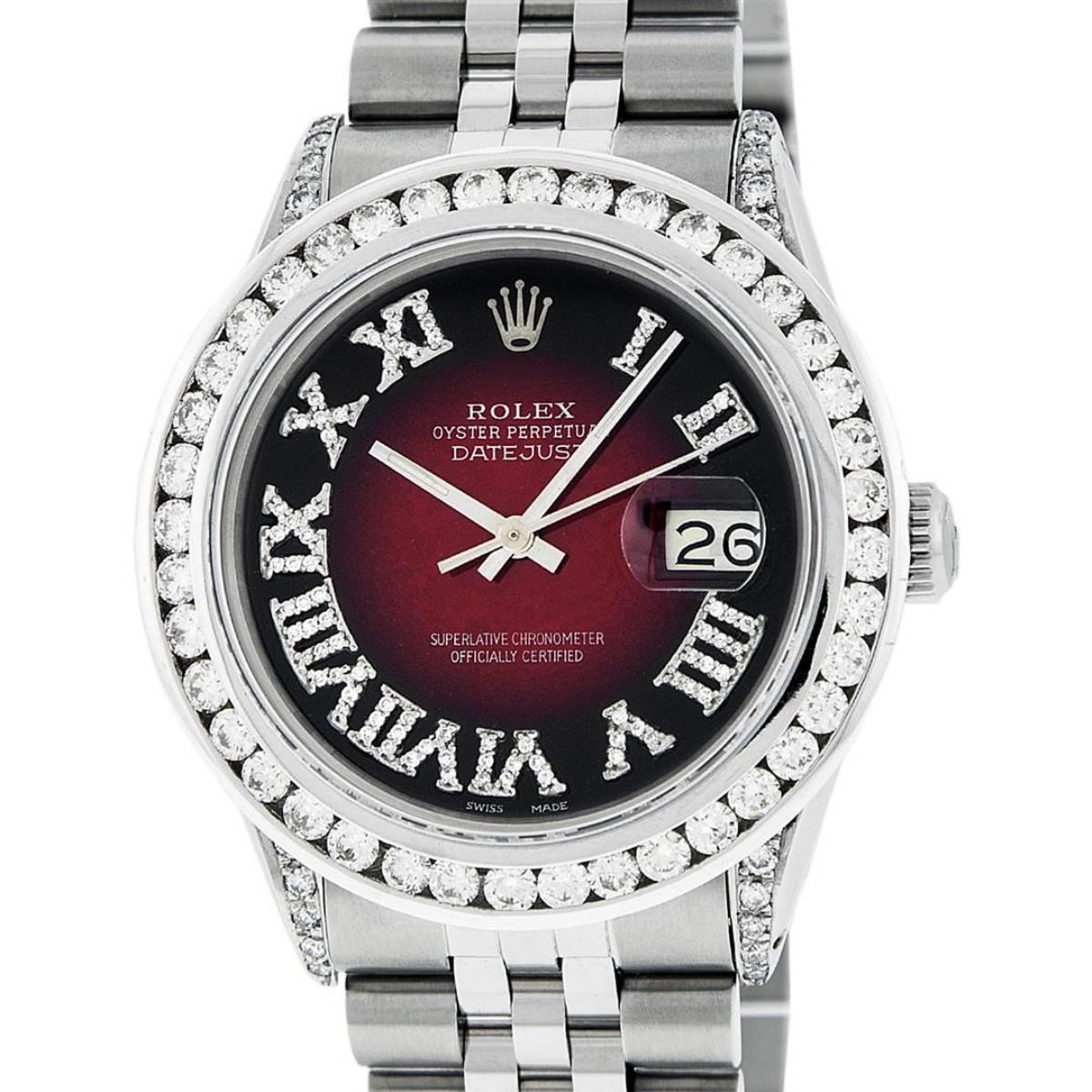One Mens Stainless Steel Rolex Datejust Polished Bright with Satin Finish, Serviced & Electronically Tested, Stainless Steel Case: 36mm, Diamond Lugs: 24 Diamonds On Lugs, Color: G to H, Clarity: SI-VS. Stainless Steel Crown, New Custom Bezel: 18K White Gold 3.00 Ctw Diamond Bezel, Diamond Count: 40 Diamonds, Total Weight 3.0 Carat, Clarity: SI-VS, Color: G to H. Custom Crystal: New Scratch Resistant Synthetic Sapphire Cyclops Lens. Movement: Automatic Winding Movement. Custom Dial: Red Vignette Roman Diamond Dial, Diamond Color: G To H In Color, Clarity: SI-VS. Date Window: 3 O'Clock Position Date Display, Quickset, Model: Quickset Datejust, Condition: G-6 Extra Fine. Bracelet: Stainless Steel Jubilee Band. Bright Polish & Satin Finish. 7.0 Inch Length, Adjustable. Standard Clasp, With Rolex Logo. This Watch Has Been Serviced Time Tested And Is In Excellent Condition It Is Free Of All Scratches And Dents.