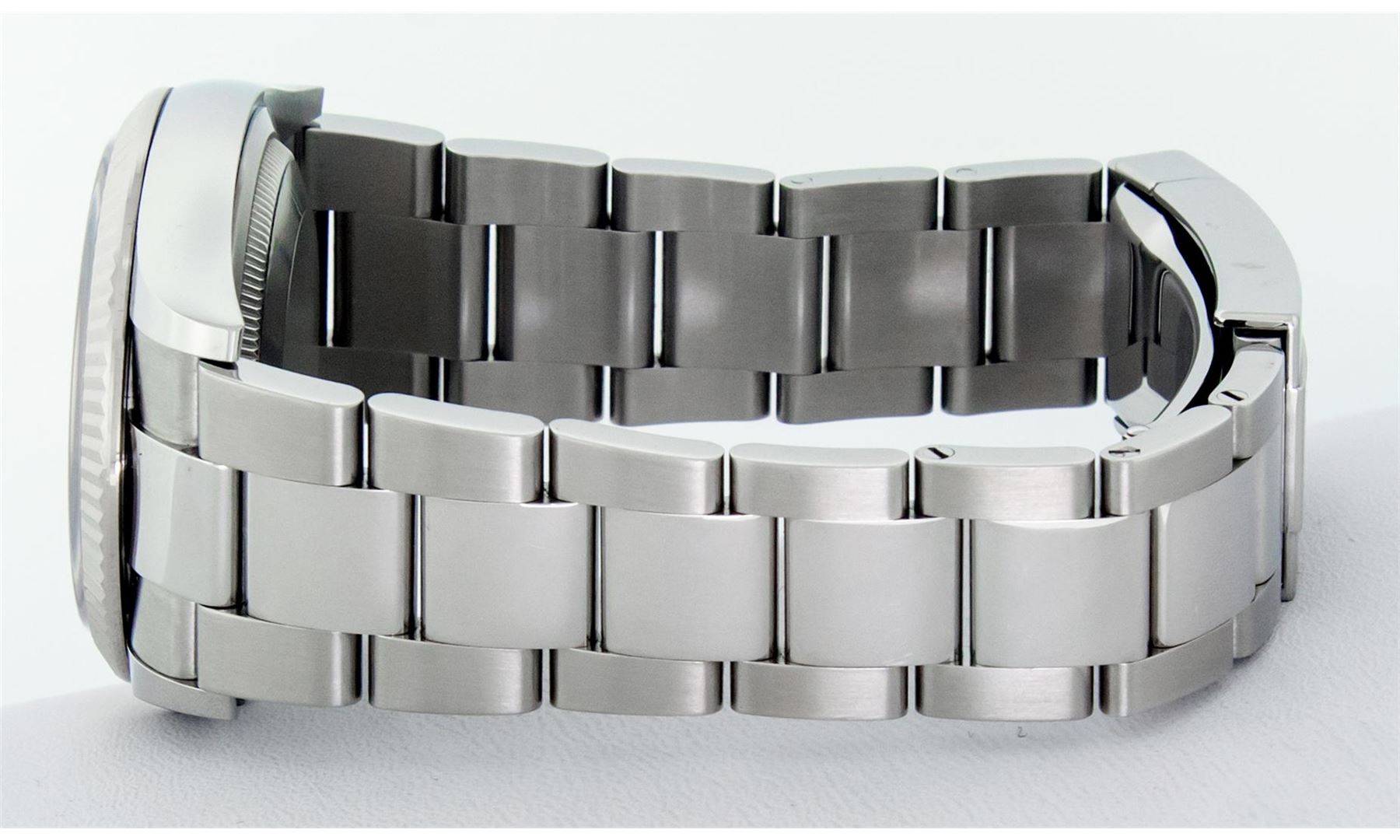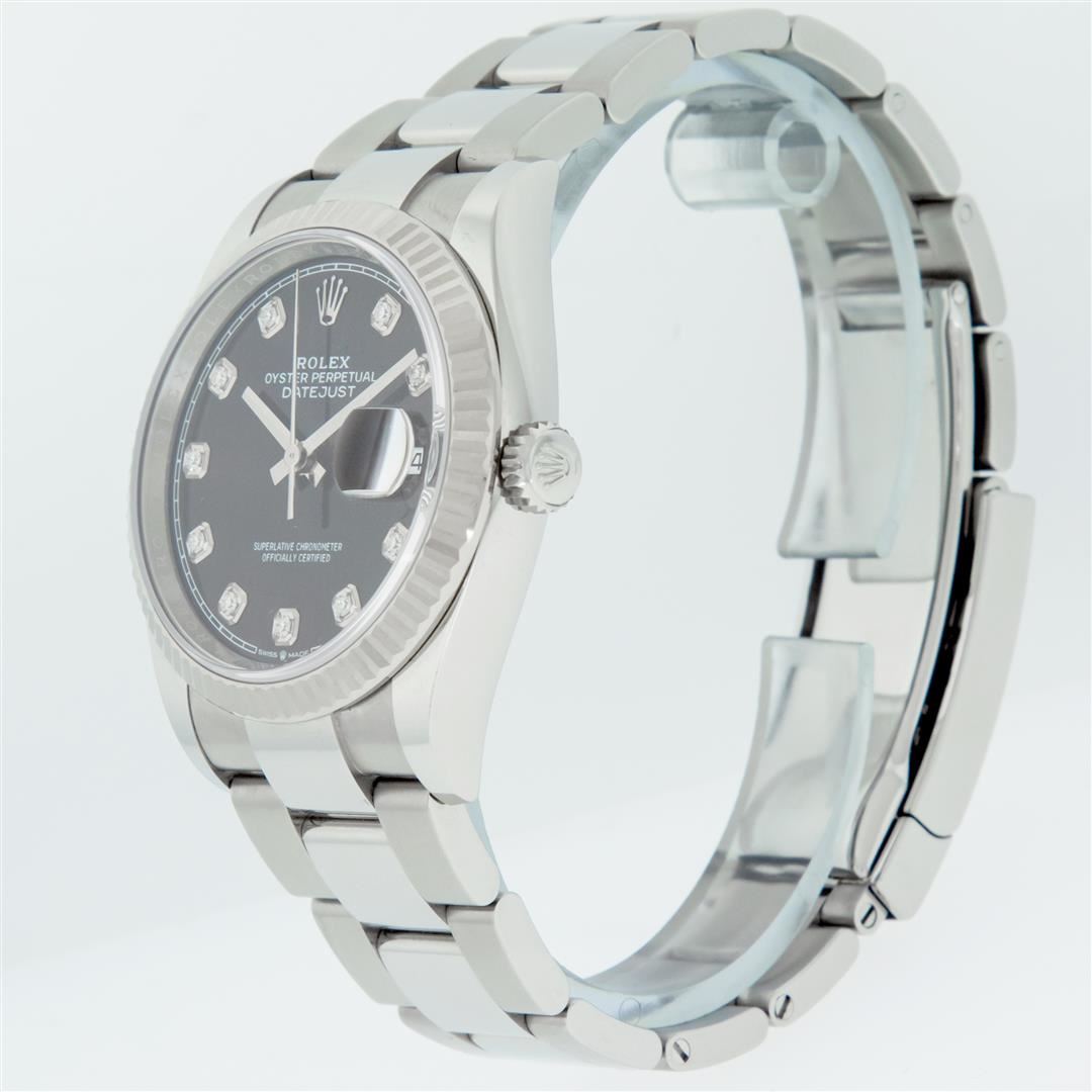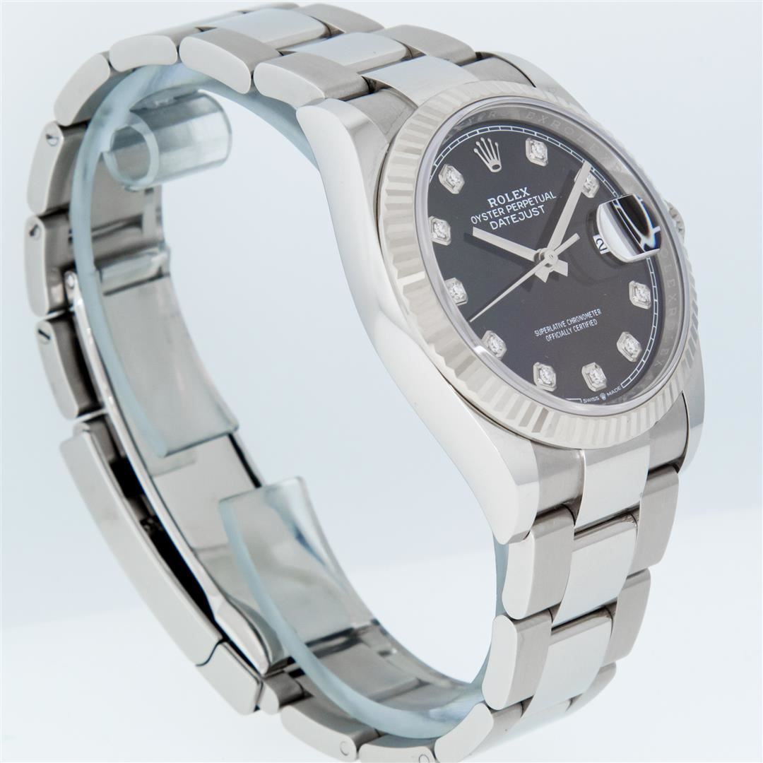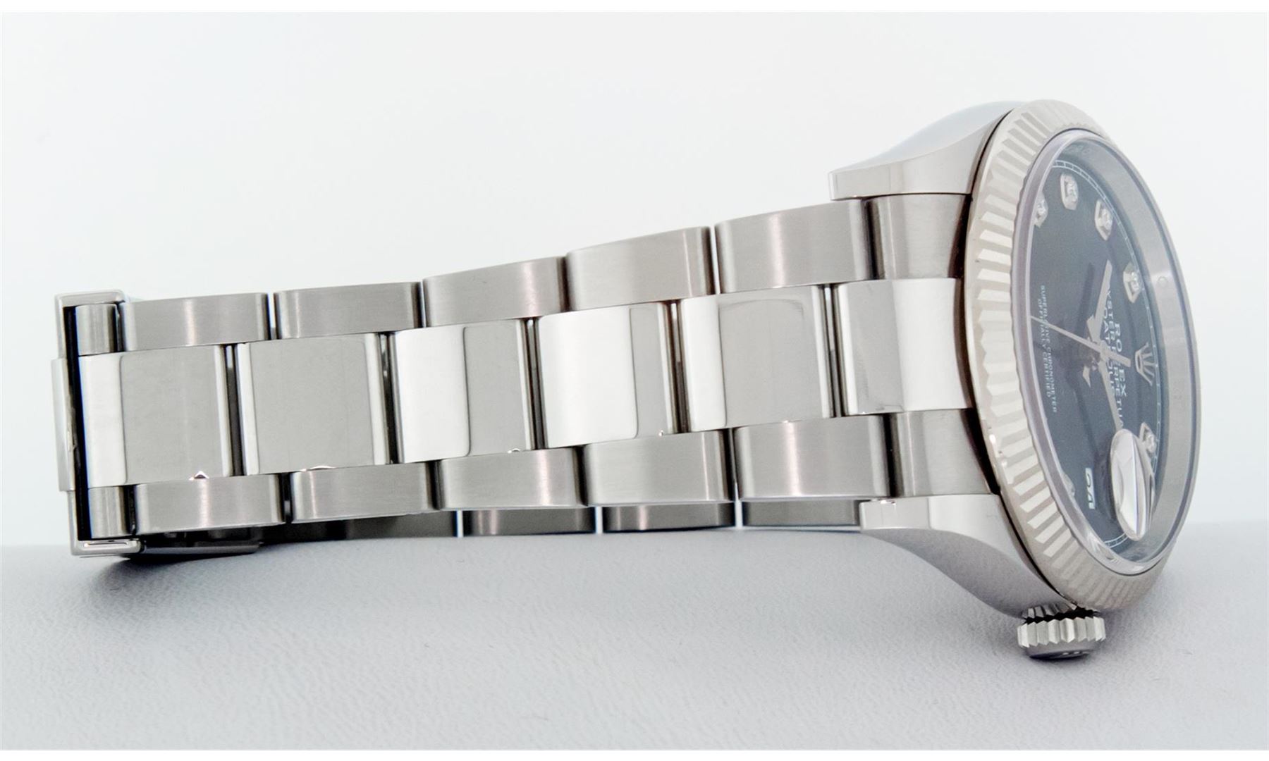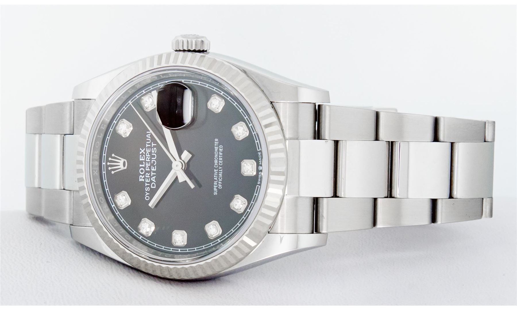 One Mens Pre Owned Rolex Datejust 36MM Polished, Serviced & Electronically Tested, Rolex Stainless Steel Case: 36mm, Stainless Steel Crown, Rolex Bezel: 18K White Gold Fluted Bezel, Crystal: Sapphire With Magnified Date Window. Hands: Solid Hands. Rolex Movement: Automatic Winding Movement 3235. Rolex Dial: Black Diamond Dial With Square Track, Diamond Count: 10 Diamonds On Dial, Clarity: VS. Date Window: 3 O'Clock Position Date Display, Quickset, Model: Datejust. Condition: G-6 Extra Fine. Rolex Bracelet: Stainless Steel Oyster Band. Bright Polish & Satin Finish. 7.0 Inch Length, Adjustable. Standard Clasp, With Rolex Logo. This Watch Has Been Serviced Time Tested And Is In Excellent Condition It Is Free Of All Scratches And Dents.