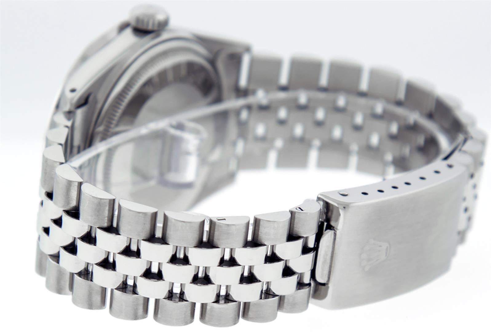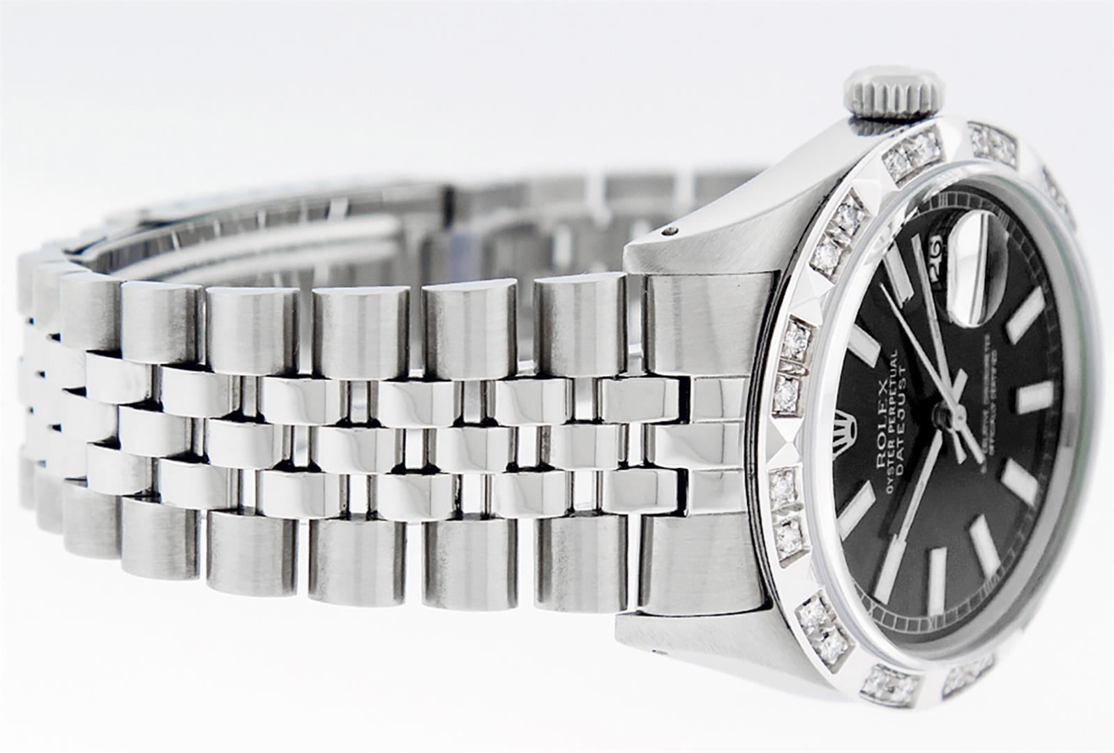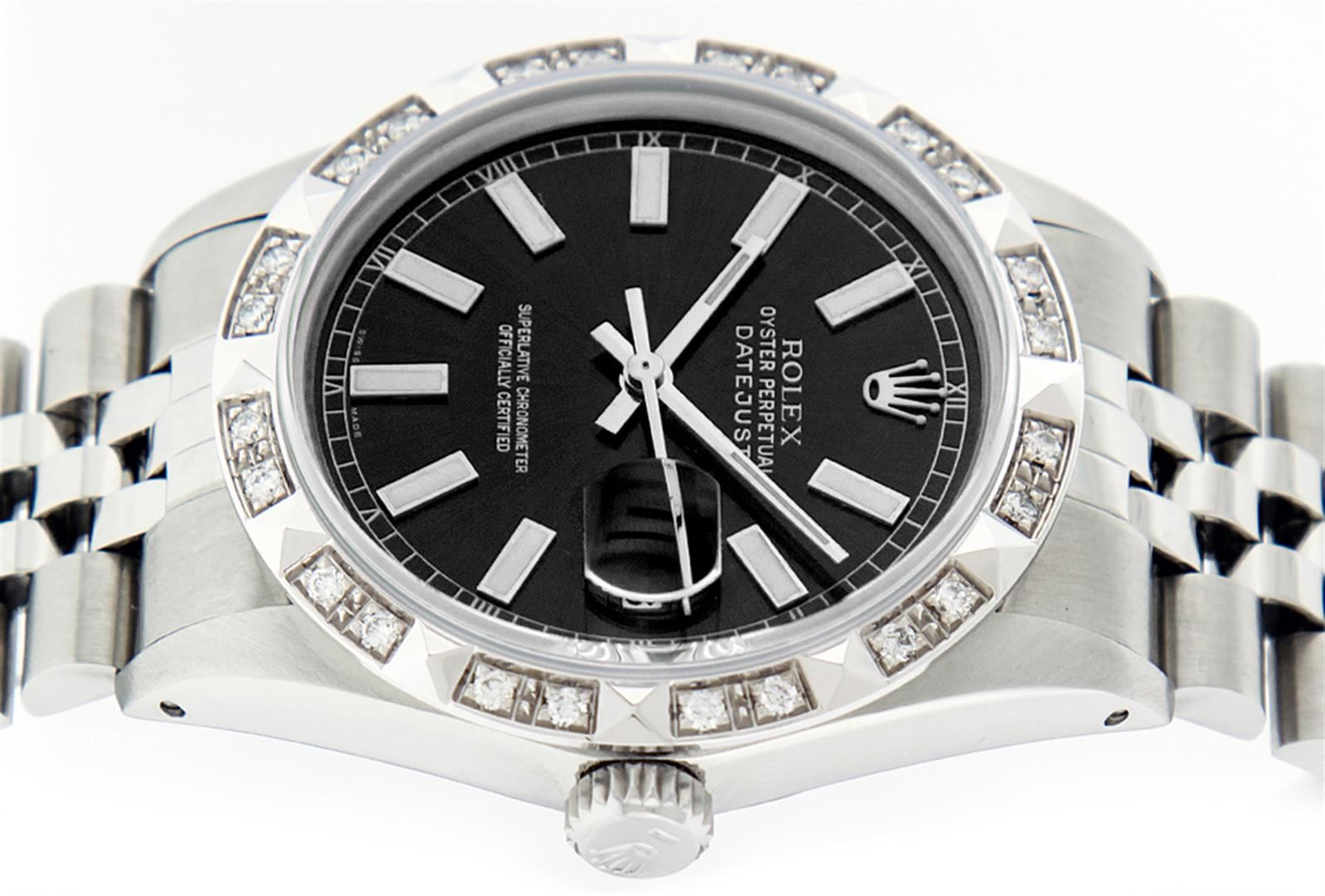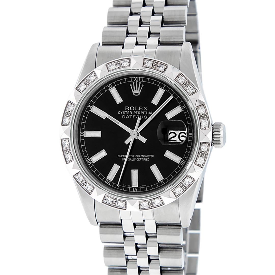 One Mens Stainless Steel Rolex Datejust Polished Bright with Satin Finish, Serviced & Electronically Tested, Stainless Steel Case: 36mm, Stainless Steel Crown, Custom Bezel: New 18K White Gold Pyramid Diamond Bezel, Diamond Count: 24 Diamonds On Bezel, Total Bezel Weight .70 Carat, Clarity: SI-VS, Color: G to H. Custom Crystal: New Synthetic Sapphire Cyclops Lens. Custom Hands: New Luminescent Hands. Movement: Automatic Winding Movement Caliber 3035. Custom Dial: Black Index Dial With Roman Square Track. Date Window: 3 O'Clock Position Date Display, Quickset, Model: Datejust. Condition: G-6 Extra Fine. Bracelet: Stainless Steel Jubilee. Bright Polish & Satin Finish. 7.0 Inch Length, Adjustable. Standard Clasp, With Rolex Logo. This Watch Has Been Serviced Time Tested And Is In Excellent Condition It Is Free Of All Scratches And Dents