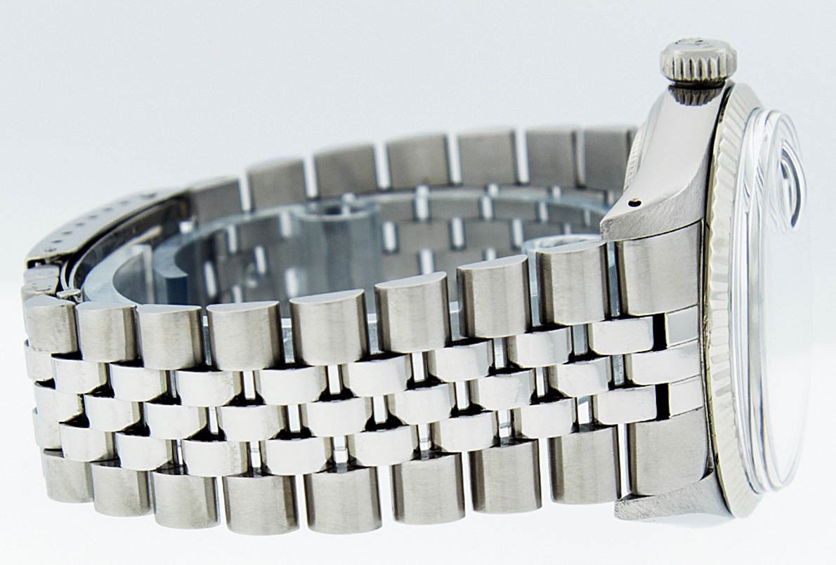 One Mens Stainless Steel Rolex Datejust Polished Bright with Satin Finish, Serviced & Electronically Tested, Stainless Steel Case: 36mm, Stainless Steel Crown, Bezel: New 14K White Gold Fluted Bezel. Custom Crystal: New Acrylic Cyclops Lens. Custom Hands: New Luminescent Hands. Movement: Automatic Winding Movement Caliber 3035. Custom Dial: Blue Diamond Dial With Line Track, Diamond Count: 10 Diamond in Dial G To H In Color, SI-VS Clarity. Date Window: 3 O'Clock Position Date Display, Quickset, Model: Datejust, Condition: G-6 Extra Fine. Bracelet: Stainless Steel Jubilee. Bright Polish & Satin Finish. 7.0 Inch Length, Adjustable. Standard Clasp, With Rolex Logo. This Watch Has Been Serviced Time Tested And Is In Excellent Condition It Is Free Of All Scratches And Dents