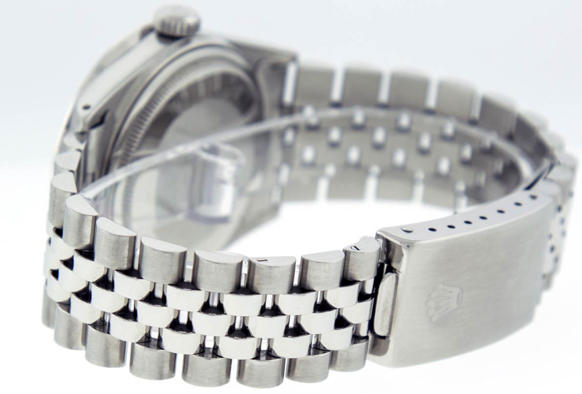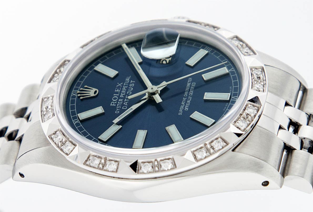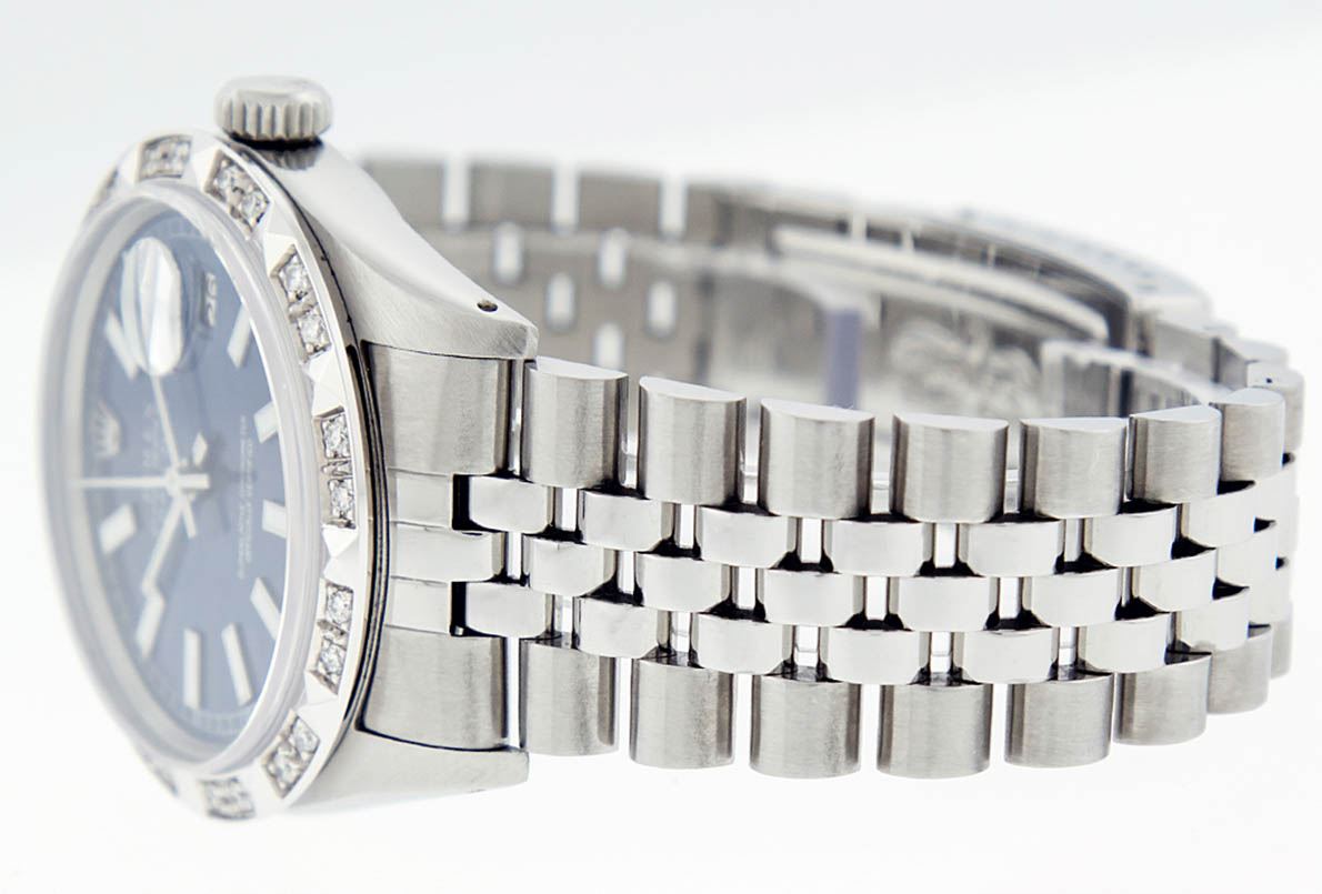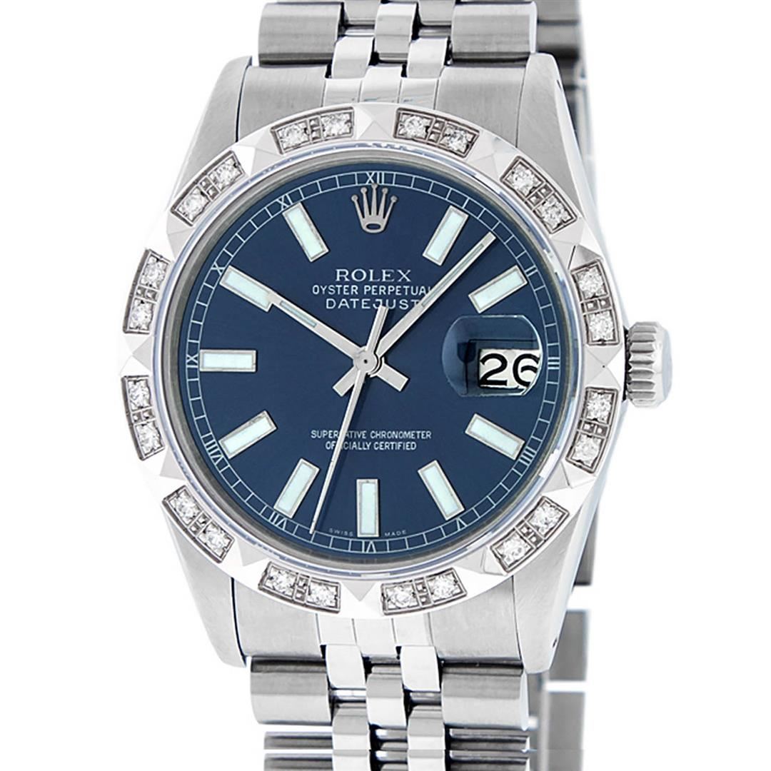 One Mens Stainless Steel Rolex Datejust Polished Bright with Satin Finish, Serviced & Electronically Tested, Stainless Steel Case: 36mm, Stainless Steel Crown, Custom Bezel: New 18K White Gold Pyramid Diamond Bezel, Diamond Count: 24 Diamonds, Total Weight .70 Carat, Clarity: SI-VS, Color: G to H. Custom Crystal: New Synthetic Sapphire Cyclops Lens. Custom Hands: New Luminescent Hands. Movement: Automatic Winding Movement Caliber 3035. Custom Dial: Blue Index Dial. Date Window: 3 O'Clock Position Date Display, Quickset, Model: Datejust. Condition: G-6 Extra Fine. Bracelet: Stainless Steel Jubilee. Bright Polish & Satin Finish. 7.0 Inch Length, Adjustable. Standard Clasp, With Rolex Logo. This Watch Has Been Serviced Time Tested And Is In Excellent Condition It Is Free Of All Scratches And Dents