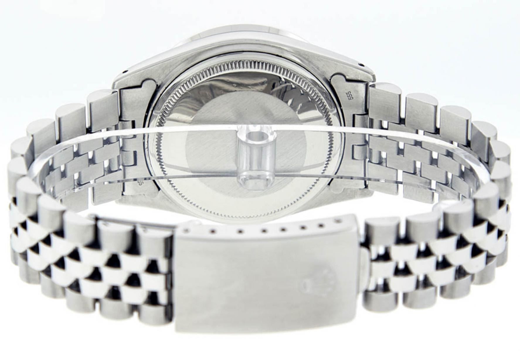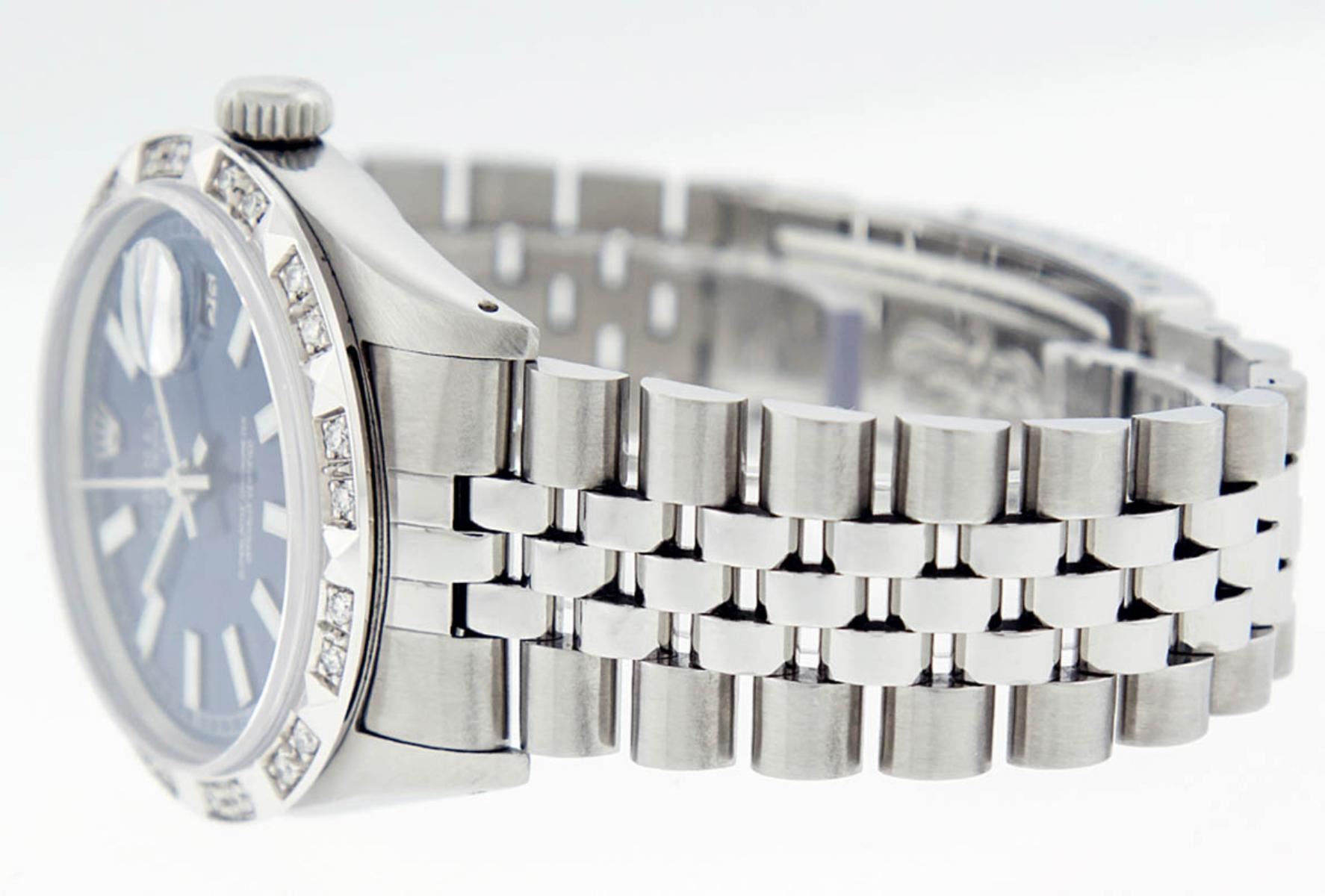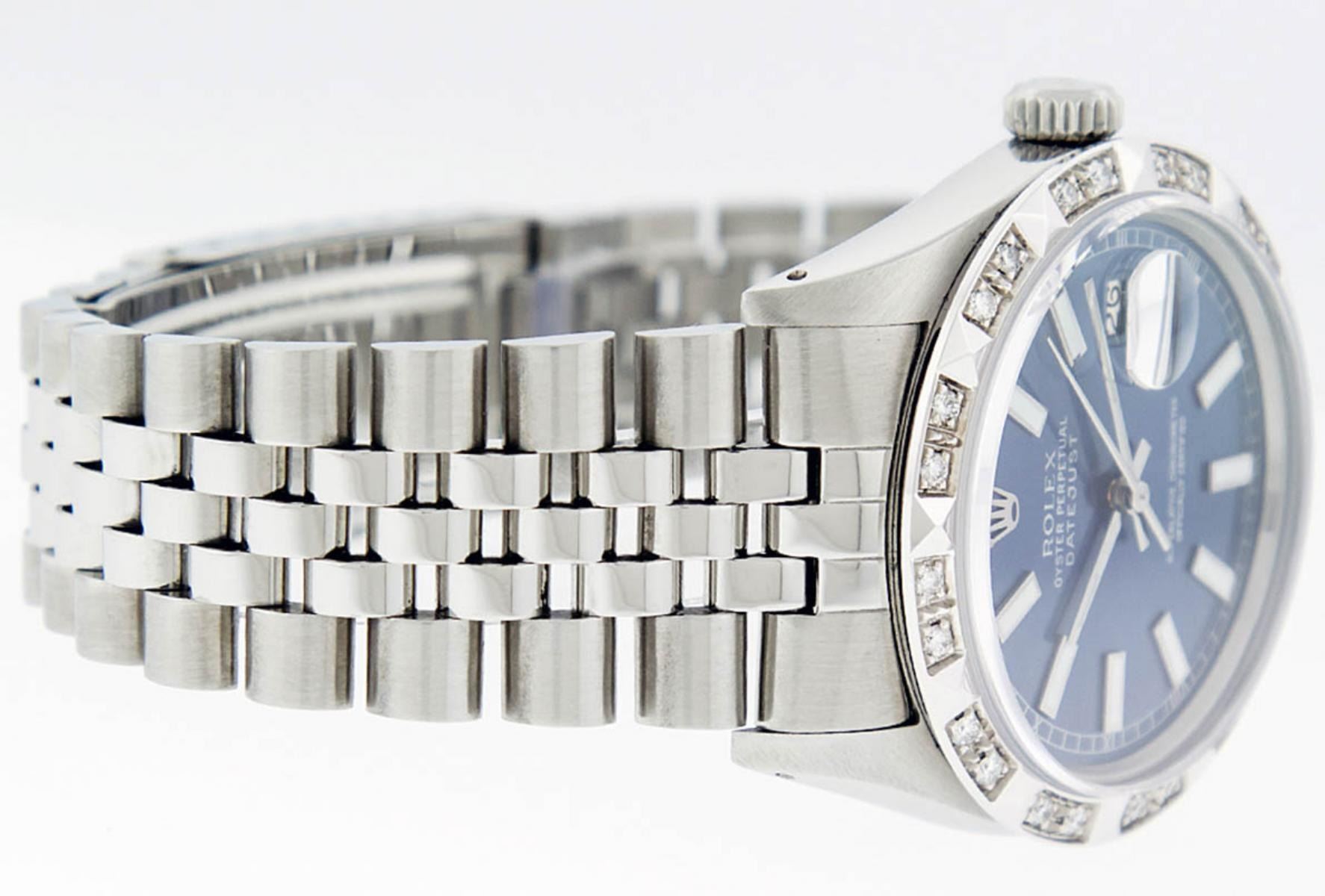 One Mens Stainless Steel Rolex Datejust Polished Bright with Satin Finish, Serviced & Electronically Tested, Stainless Steel Case: 36mm, Stainless Steel Crown, Custom Bezel: New 18K White Gold Pyramid Diamond Bezel, Diamond Count: 24 Diamonds, Total Weight .70 Carat, Clarity: SI-VS, Color: G to H. Custom Crystal: New Synthetic Sapphire Cyclops Lens. Custom Hands: New Luminescent Hands. Movement: Automatic Winding Movement Caliber 3035. Custom Dial: Blue Index Dial. Date Window: 3 O'Clock Position Date Display, Quickset, Model: Datejust. Condition: G-6 Extra Fine. Bracelet: Stainless Steel Jubilee. Bright Polish & Satin Finish. 7.0 Inch Length, Adjustable. Standard Clasp, With Rolex Logo. This Watch Has Been Serviced Time Tested And Is In Excellent Condition It Is Free Of All Scratches And Dents