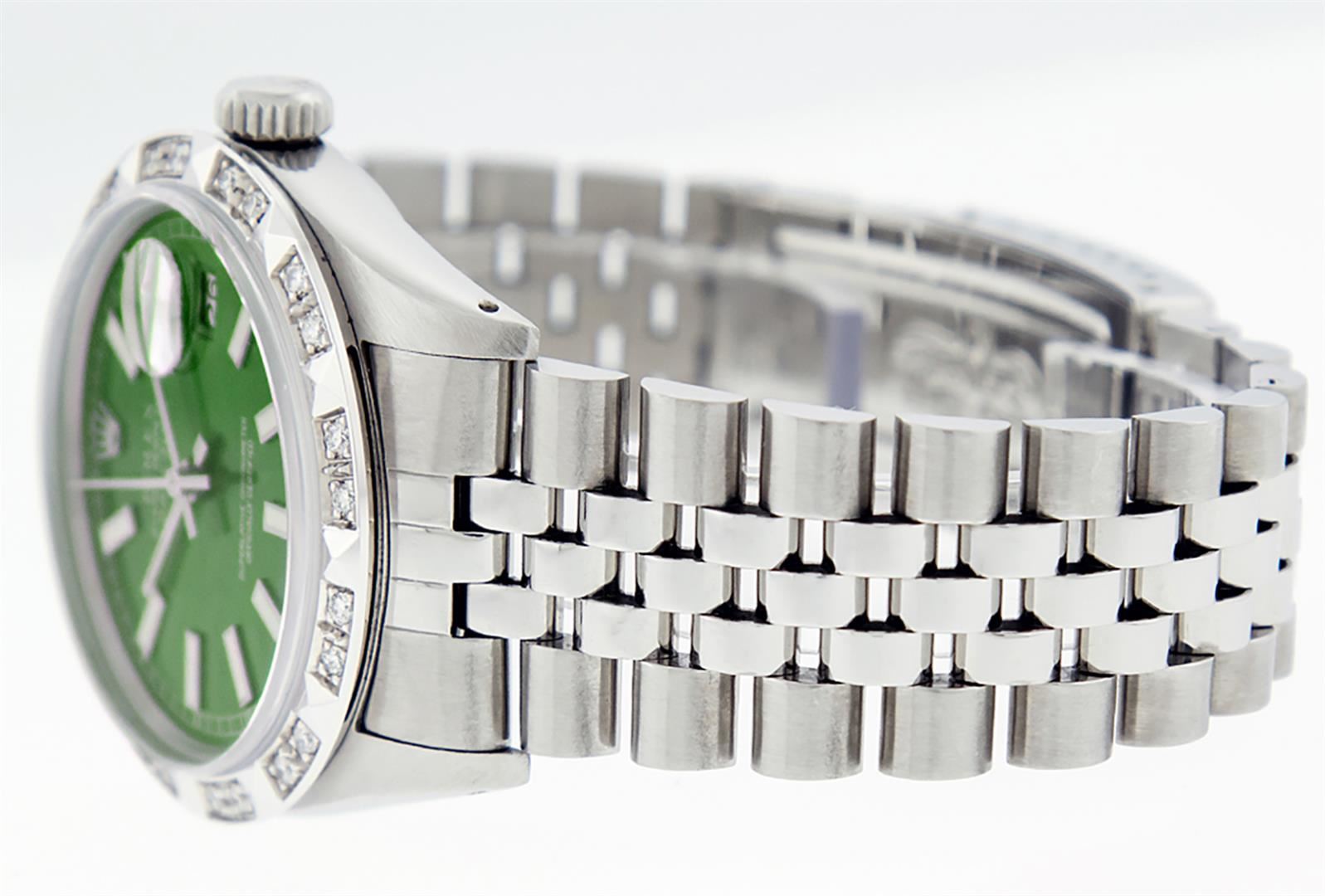 One Mens Stainless Steel Rolex Datejust Polished Bright with Satin Finish, Serviced & Electronically Tested, Stainless Steel Case: 36mm, Stainless Steel Crown, Custom Bezel: New 18K White Gold Pyramid Diamond Bezel, Diamond Count: 24 Diamonds On Bezel, Total Weight .70 Carat, Clarity: SI-VS, Color: G to H. Custom Crystal: New Synthetic Sapphire Cyclops Lens. Custom Hands: New Luminescent Hands. Movement: Automatic Winding Movement Caliber 3035. Custom Dial: Green Index Dial With Square Roman Track. Date Window: 3 O'Clock Position Date Display, Quickset, Model: Datejust. Condition: G-6 Extra Fine. Bracelet: Stainless Steel Jubilee. Bright Polish & Satin Finish. 7.0 Inch Length, Adjustable. Standard Clasp, With Rolex Logo. This Watch Has Been Serviced Time Tested And Is In Excellent Condition It Is Free Of All Scratches And Dents.