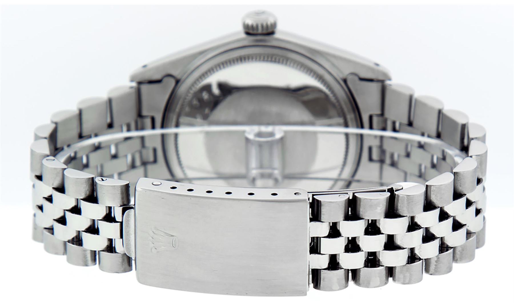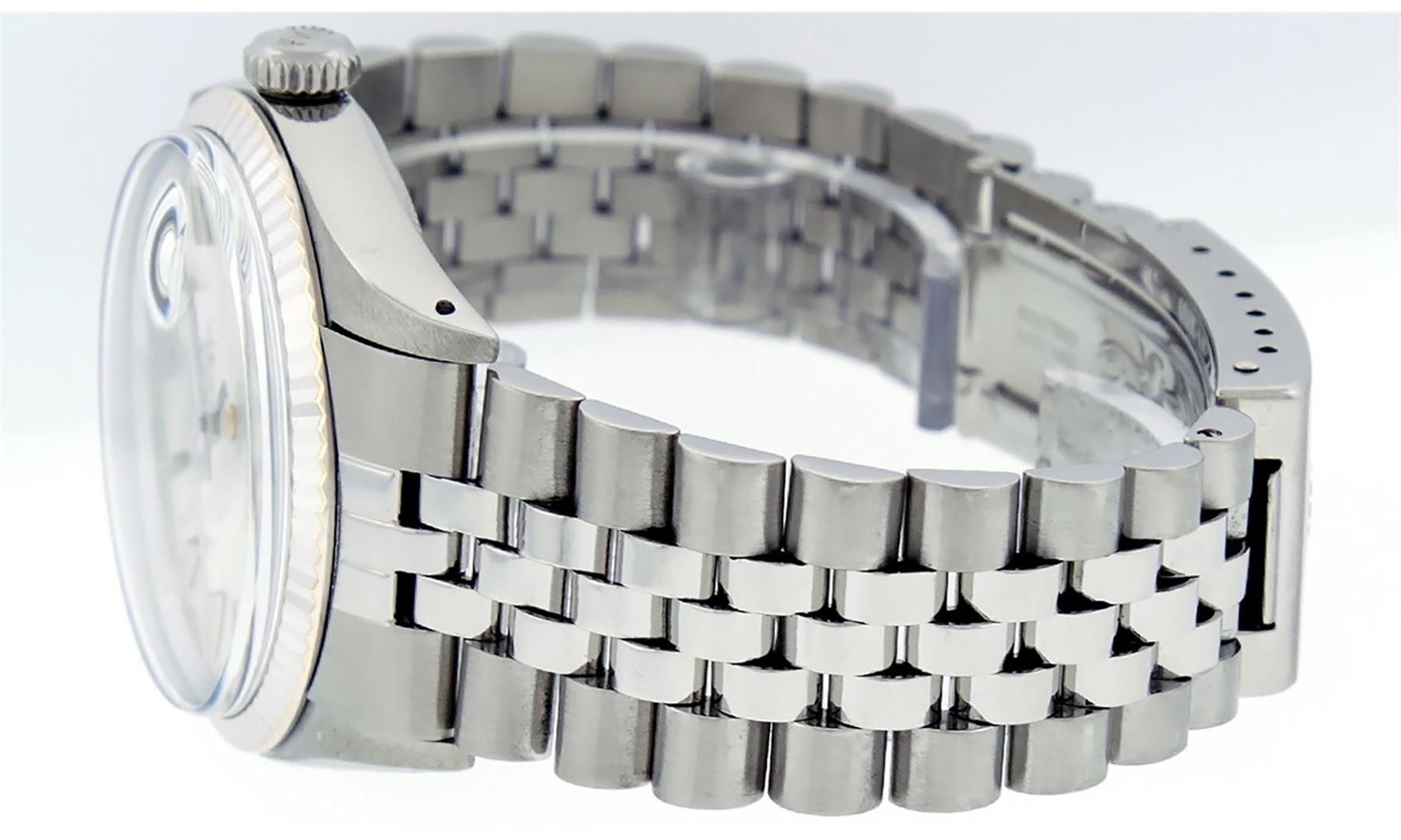 One Mens Stainless Steel Rolex Datejust Polished, Serviced & Electronically Tested, Stainless Steel Case: 36mm, Stainless Steel Crown, Bezel: 14K White Gold Fluted Bezel. Custom Crystal: New Acrylic Cyclops Lens. Hands: Luminescent Hands. Movement: Automatic Winding Movement. Dial: Slate Grey Index With Dash Track. Date Window: 3 O'Clock Position Date Display, Quickset, Model: Datejust, Condition: G-6 Extra Fine. Bracelet: Stainless Steel Jubilee Band. Bright Polish & Satin Finish. 7.0 Inch Length, Adjustable. Standard Clasp, With Rolex Logo. This Watch Has Been Serviced Time Tested And Is In Excellent Condition It Is Free Of All Scratches And Dents.