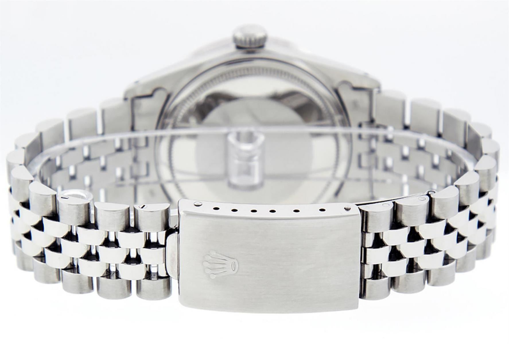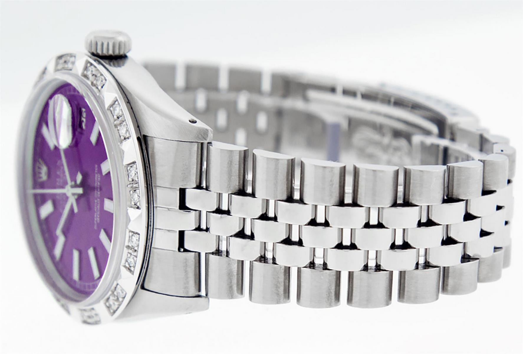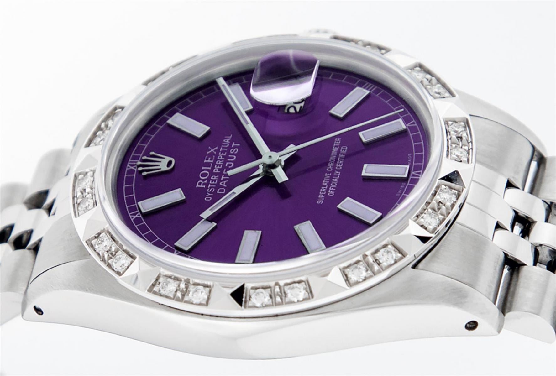 One Mens Stainless Steel Rolex Datejust Polished Bright with Satin Finish, Serviced & Electronically Tested, Stainless Steel Case: 36mm, Stainless Steel Crown, Custom Bezel: New 18K White Gold Pyramid Diamond Bezel, Diamond Count: 24 Diamonds On Bezel, Total Bezel Weight .70 Carat, Clarity: SI-VS, Color: G to H. Custom Crystal: New Synthetic Sapphire Cyclops Lens. Custom Hands: New Luminescent Hands. Movement: Automatic Winding Movement Caliber 3035. Custom Dial: Purple Index Dial With Square Roman Track. Date Window: 3 O'Clock Position Date Display, Quickset, Model: Datejust. Condition: G-6 Extra Fine. Bracelet: Stainless Steel Jubilee Band. Bright Polish & Satin Finish. 7.0 Inch Length, Adjustable. Standard Clasp, With Rolex Logo. This Watch Has Been Serviced Time Tested And Is In Excellent Condition It Is Free Of All Scratches And Dents.