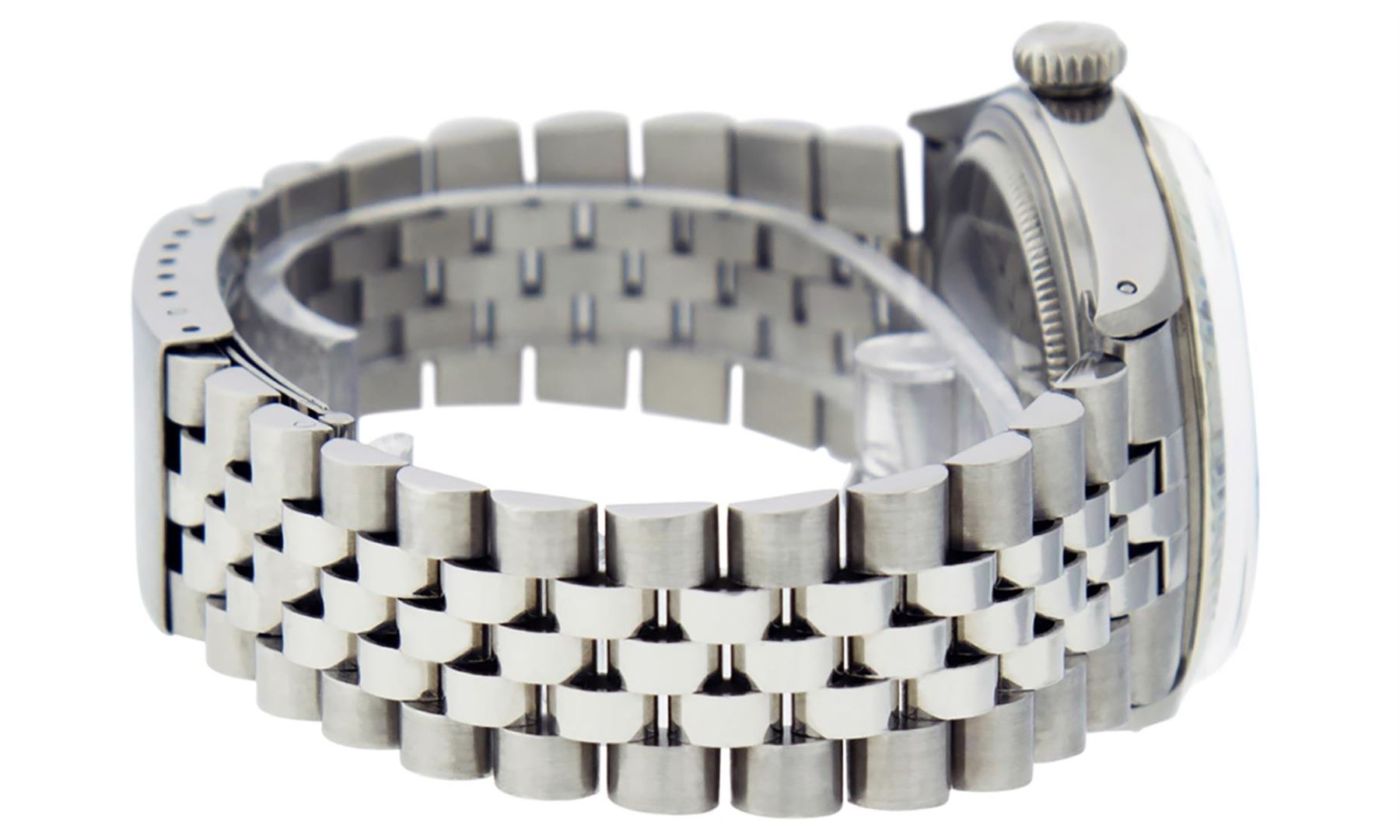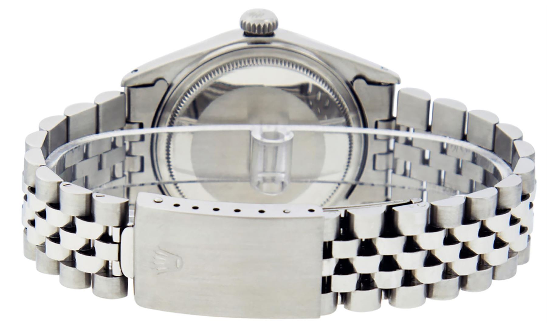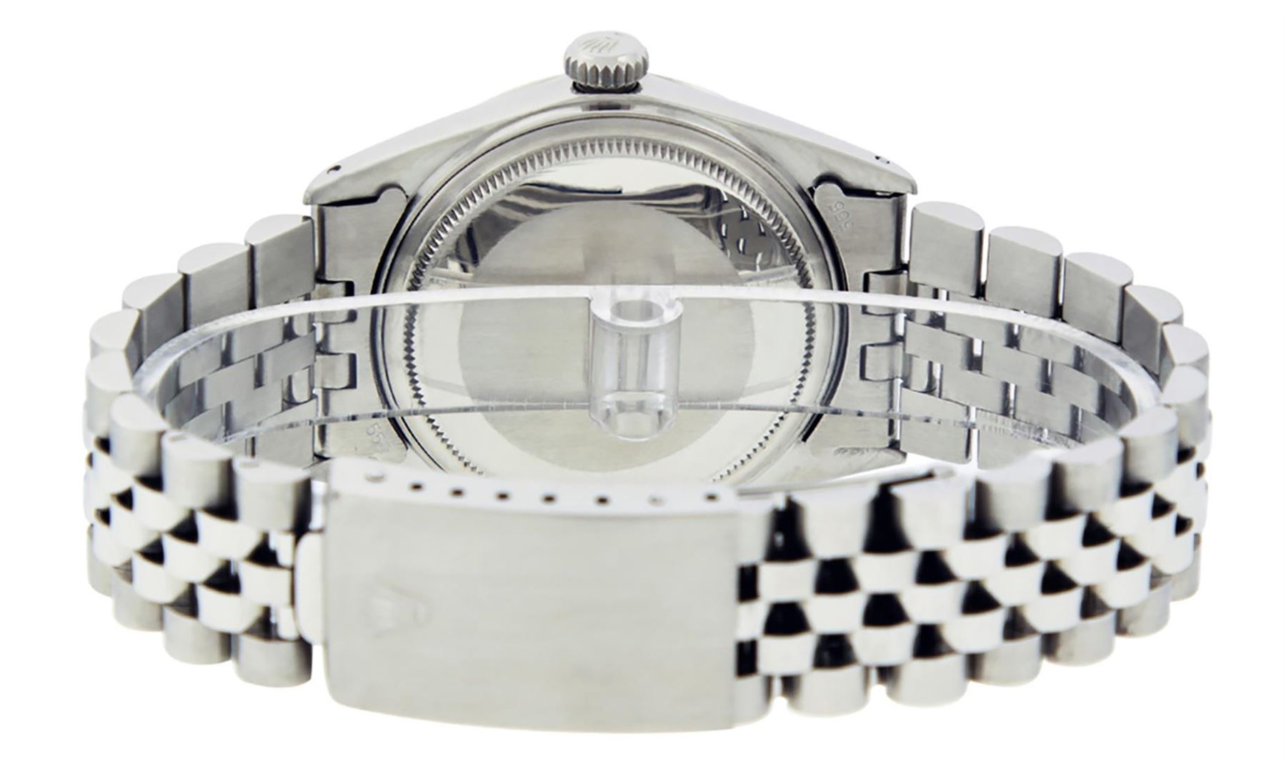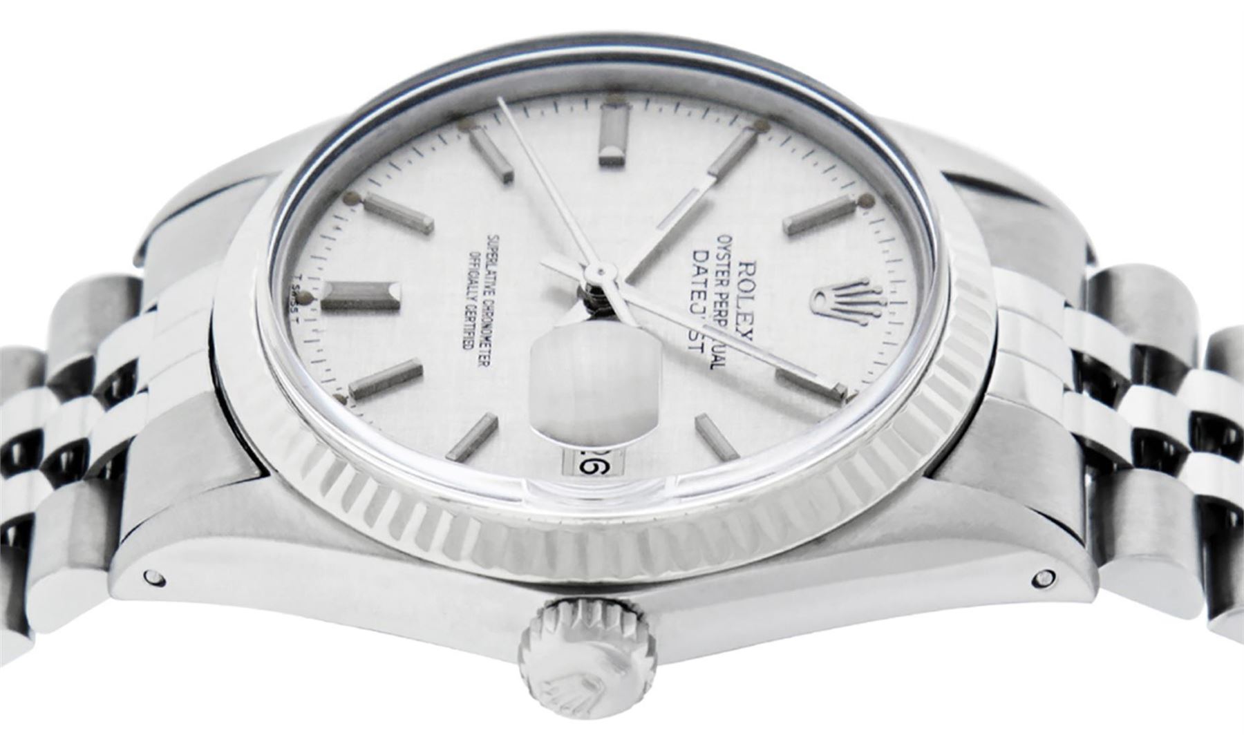 One Mens Pre Owned Stainless Steel Rolex Datejust Polished, Serviced & Electronically Tested, Rolex Stainless Steel Case: 36mm, Rolex Stainless Steel Crown, Bezel: 14K White Gold Fluted Bezel. Custom Crystal: Acrylic Crystal With Date Window, Custom Hands: New Luminescent Hands. Rolex Movement: Automatic Winding Movement 3035. Rolex Dial: Silver Index With Dash Track & Lumi Dot. Date Window: 3 O'Clock Position Date Display, Quickset, Model: Datejust, Condition: G-6 Extra Fine. Rolex Bracelet: Stainless Steel Jubilee Band. Bright Polish & Satin Finish. 7.0 Inch Length, Adjustable. Standard Clasp, With Rolex Logo. This Watch Has Been Serviced Time Tested And Is In Excellent Condition It Is Free Of All Scratches And Dents.