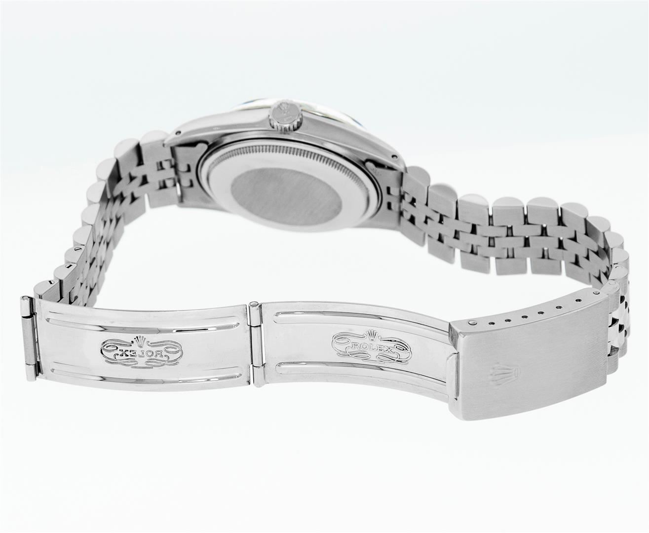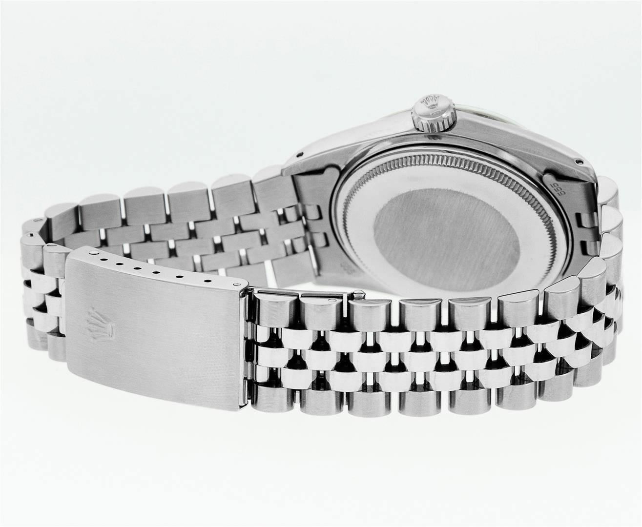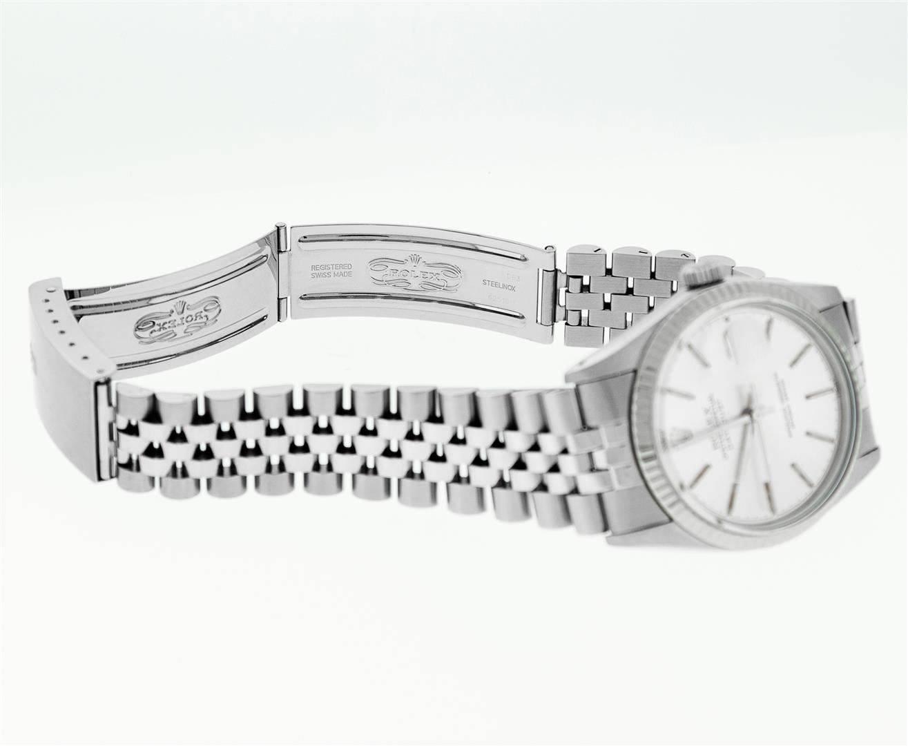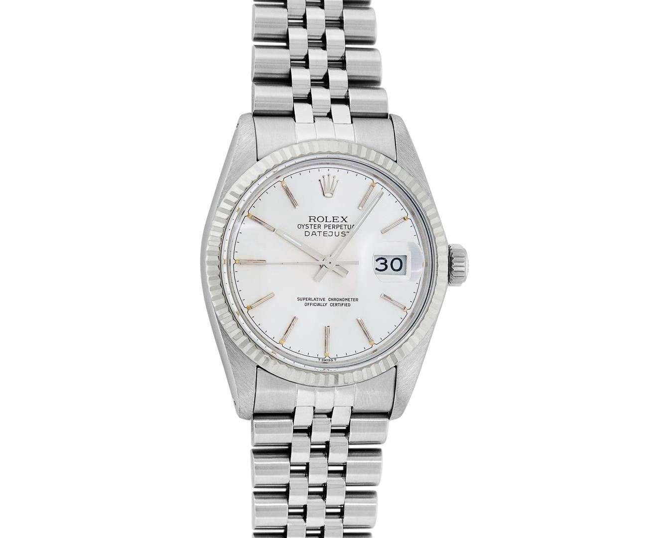 One Mens Pre Owned Stainless Steel Rolex Datejust Polished, Serviced & Electronically Tested, Rolex Stainless Steel Case: 36mm, Rolex Stainless Steel Crown, Bezel: 14K White Gold Fluted Bezel. Custom Crystal: Acrylic Crystal With Magnified Date Window, Custom Hands: New Luminescent Hands. Rolex Movement: Automatic Winding Movement 3035. Rolex Dial: Silver Index With Dash Track & Lumi Dot. Date Window: 3 O'Clock Position Date Display, Quickset, Model: Datejust, Condition: G-6 Extra Fine. Rolex Bracelet: Stainless Steel Jubilee Band. Bright Polish & Satin Finish. 7.0 Inch Length, Adjustable. Standard Clasp, With Rolex Logo. This Watch Has Been Serviced Time Tested And Is In Excellent Condition It Is Free Of All Scratches And Dents.