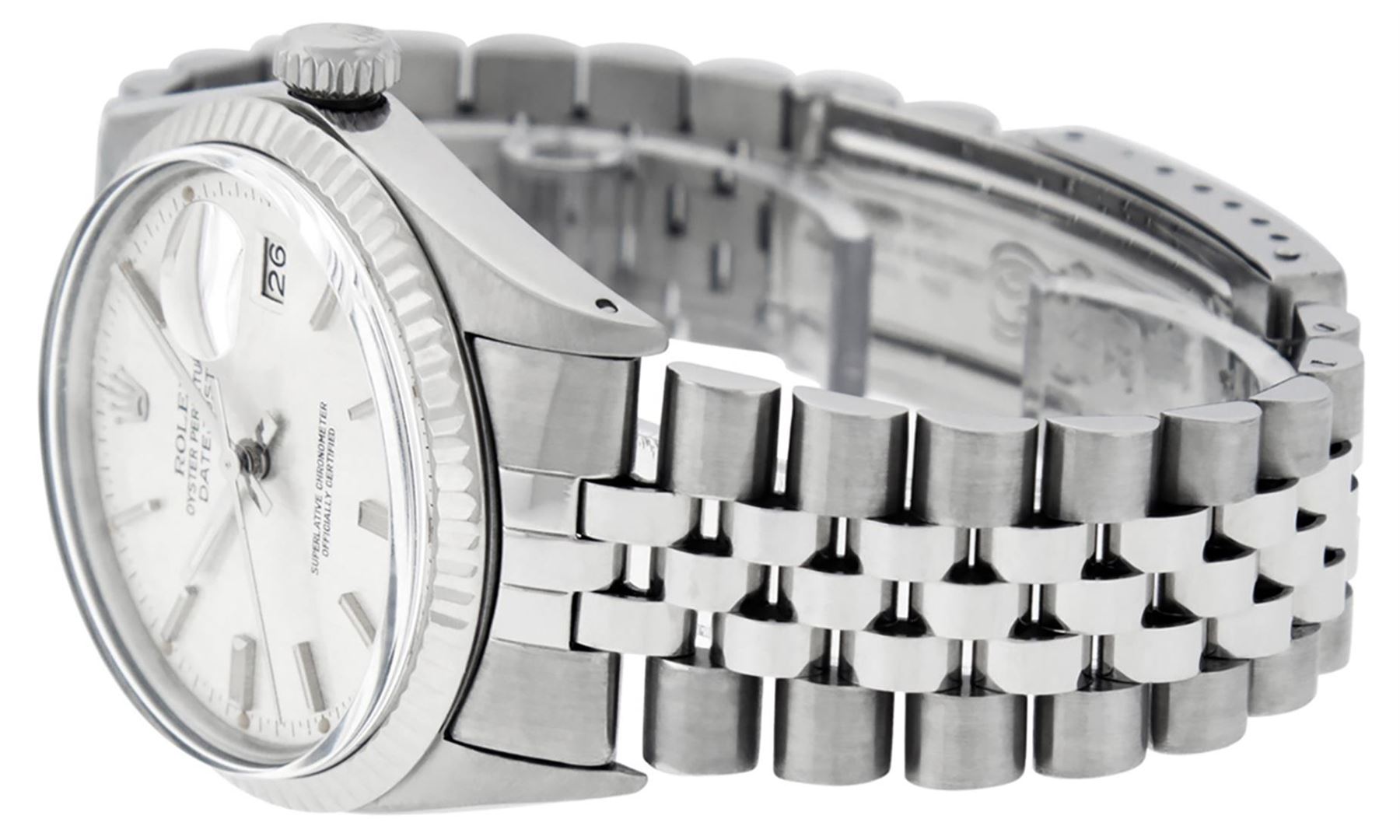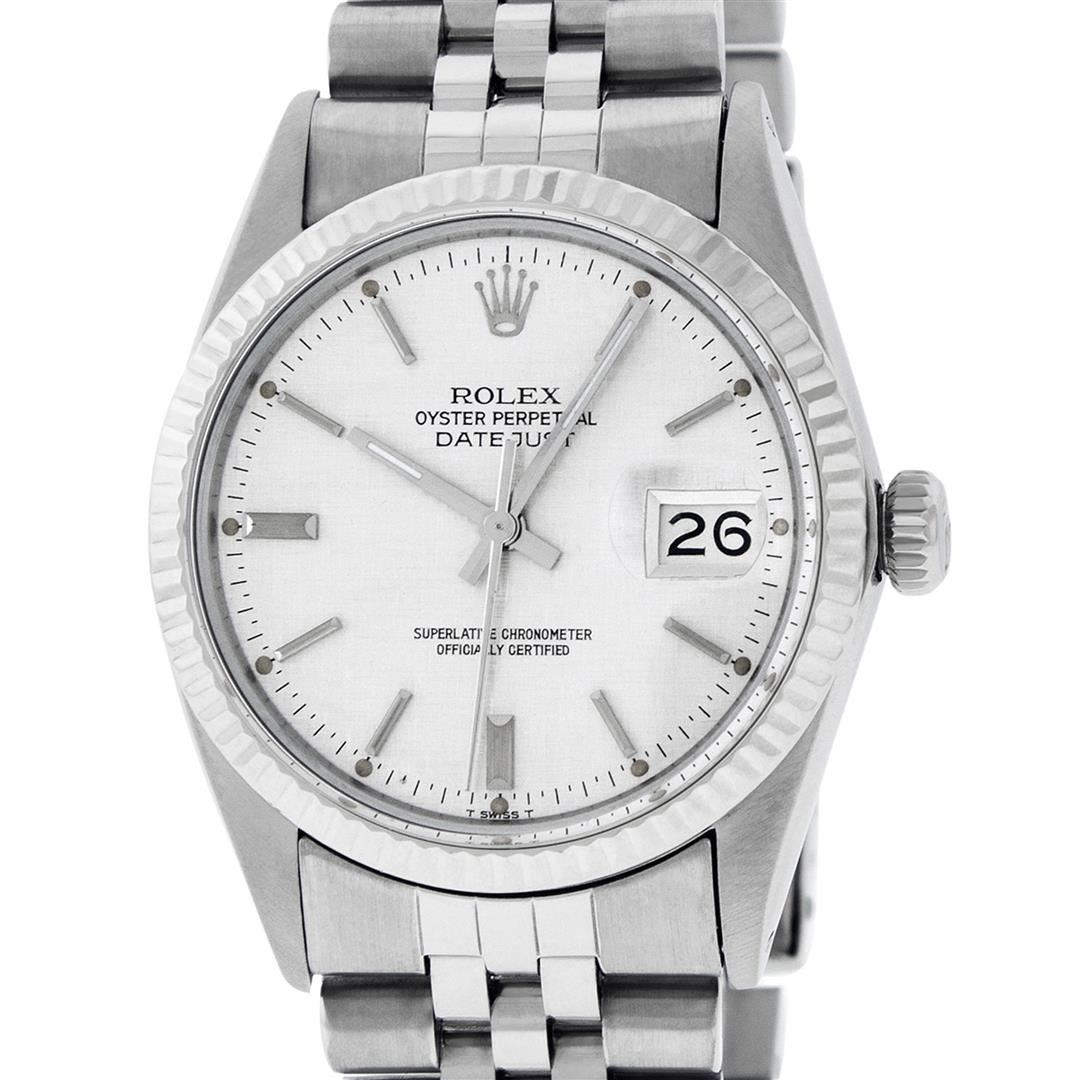 One Mens Pre Owned Stainless Steel Rolex Datejust Polished, Serviced & Electronically Tested, Rolex Stainless Steel Case: 36mm, Rolex Stainless Steel Crown, Bezel: 14K White Gold Fluted Bezel. Custom Crystal: Acrylic Crystal With Date Window, Custom Hands: New Luminescent Hands. Rolex Movement: Automatic Winding Movement 3035. Rolex Dial: Silver Index With Dash Track & Lumi Dot. Date Window: 3 O'Clock Position Date Display, Quickset, Model: Datejust, Condition: G-6 Extra Fine. Rolex Bracelet: Stainless Steel Jubilee Band. Bright Polish & Satin Finish. 7.0 Inch Length, Adjustable. Standard Clasp, With Rolex Logo. This Watch Has Been Serviced Time Tested And Is In Excellent Condition It Is Free Of All Scratches And Dents.