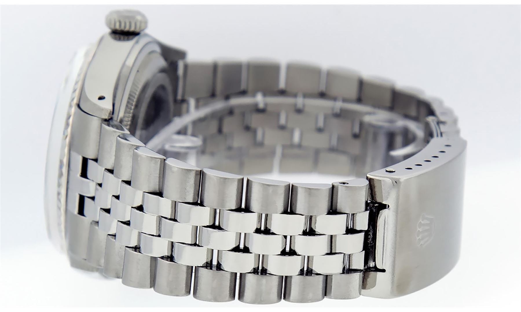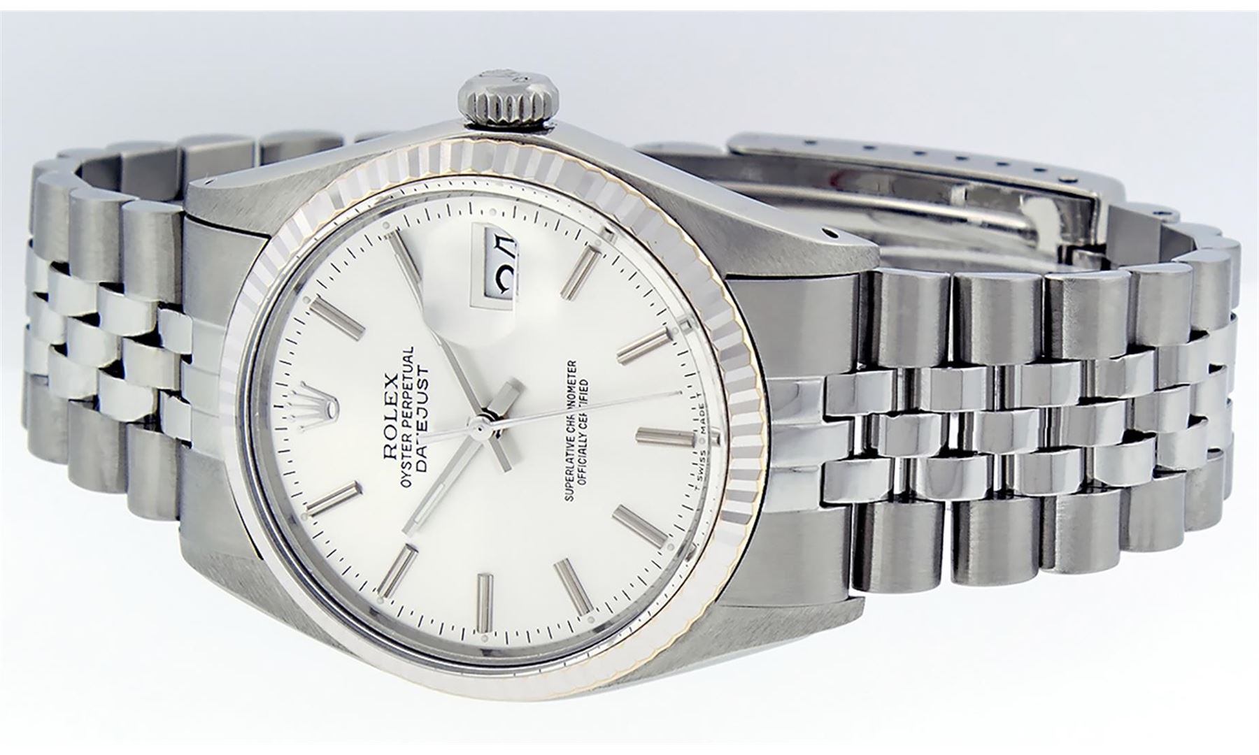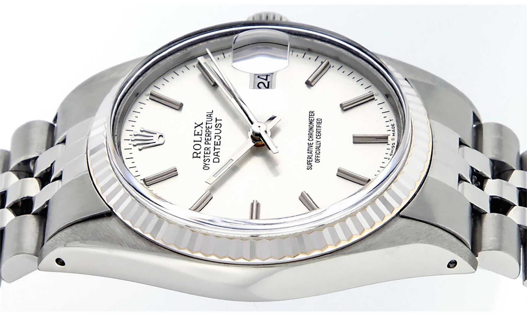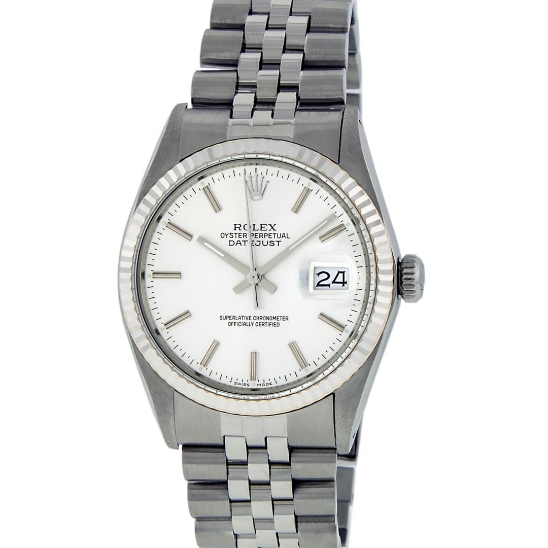 One Mens Stainless Steel Rolex Datejust Polished, Serviced & Electronically Tested, Stainless Steel Case: 36mm, Stainless Steel Crown, Bezel: 14K White Gold Fluted Bezel. Custom Crystal: New Acrylic Cyclops Lens. Custom Hands: New Luminescent Hands. Movement: Automatic Winding Movement Caliber 3035. Custom Dial: Silver Index With Dash Track. Date Window: 3 O'Clock Position Date Display, Quickset, Model: Datejust, Condition: G-6 Extra Fine. Bracelet: Stainless Steel Jubilee Band. Bright Polish & Satin Finish. 7.0 Inch Length, Adjustable. Standard Clasp, With Rolex Logo. This Watch Has Been Serviced Time Tested And Is In Excellent Condition It Is Free Of All Scratches And Dents.