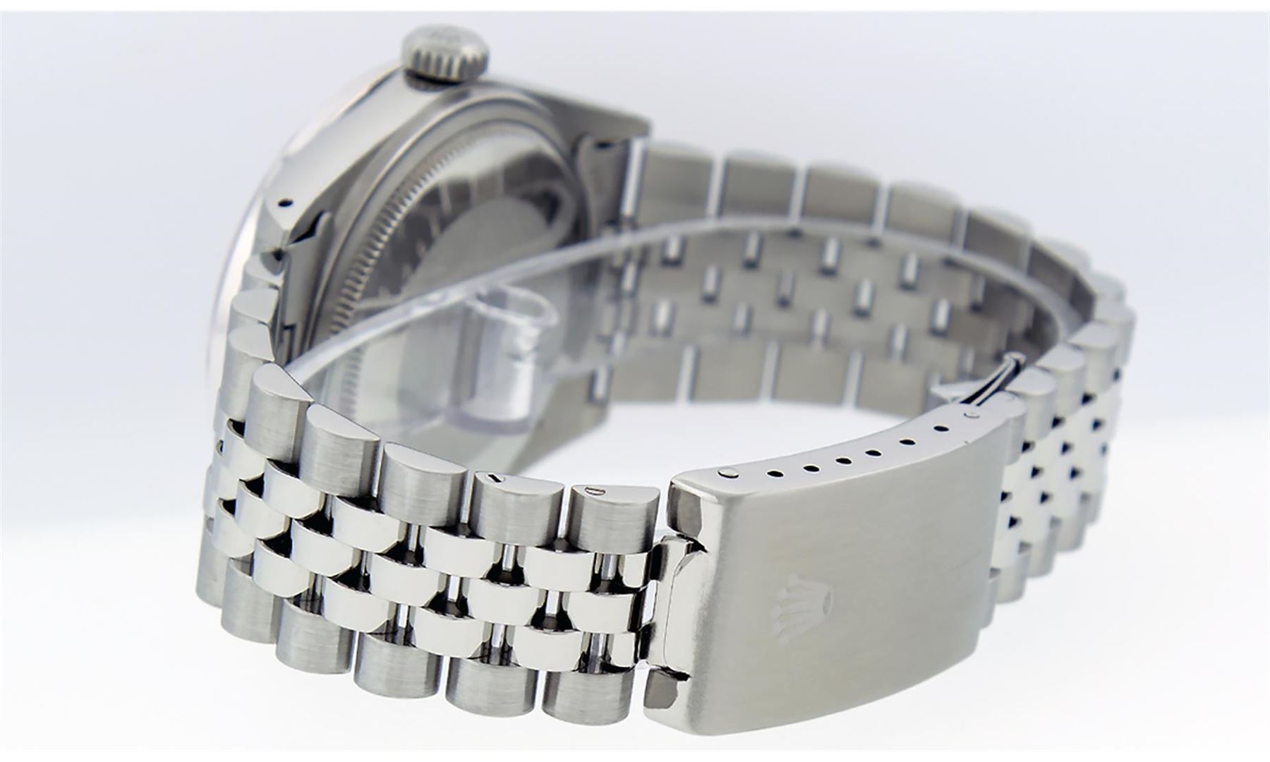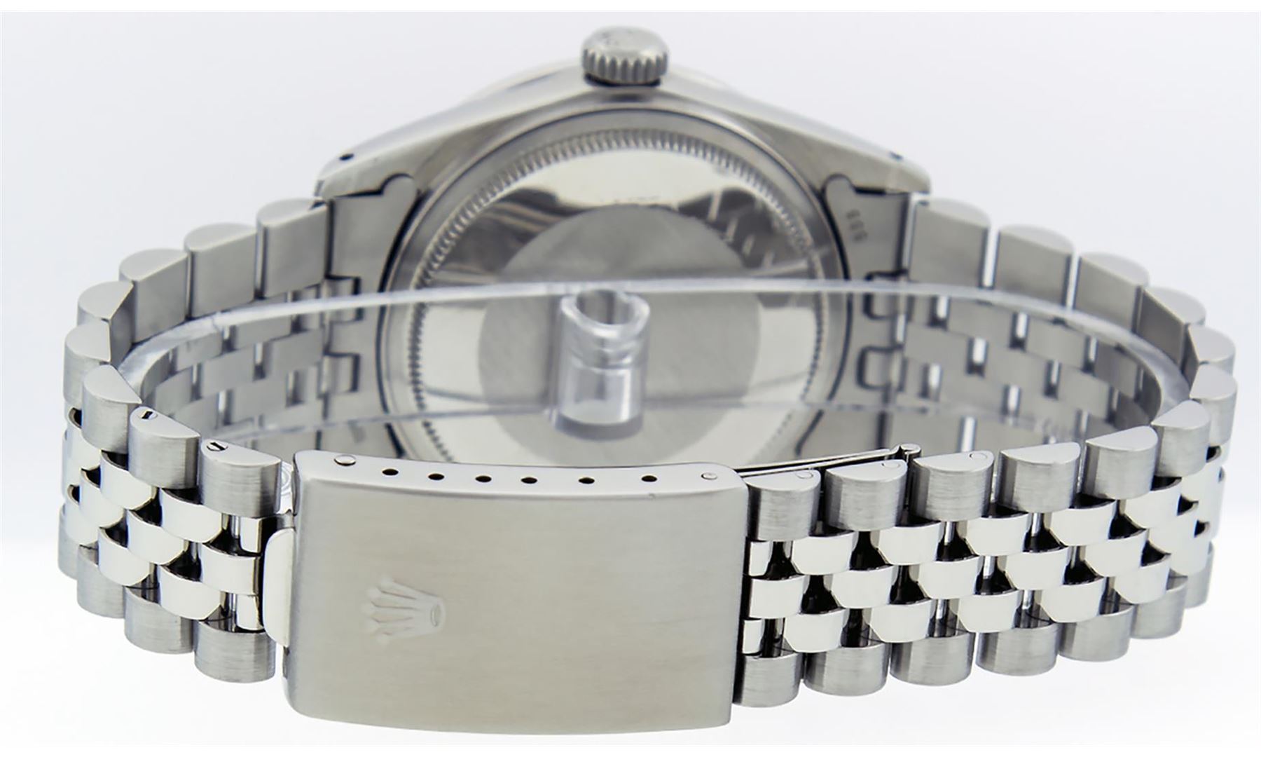 One Mens Stainless Steel Rolex Datejust Polished, Serviced & Electronically Tested, Stainless Steel Case: 36mm, Stainless Steel Crown, Bezel: 14K White Gold Fluted Bezel. Custom Crystal: New Acrylic Cyclops Lens. Custom Hands: New Luminescent Hands. Movement: Automatic Winding Movement Caliber 3035. Custom Dial: Silver Index With Dash Track. Date Window: 3 O'Clock Position Date Display, Quickset, Model: Datejust, Condition: G-6 Extra Fine. Bracelet: Stainless Steel Jubilee Band. Bright Polish & Satin Finish. 7.0 Inch Length, Adjustable. Standard Clasp, With Rolex Logo. This Watch Has Been Serviced Time Tested And Is In Excellent Condition It Is Free Of All Scratches And Dents