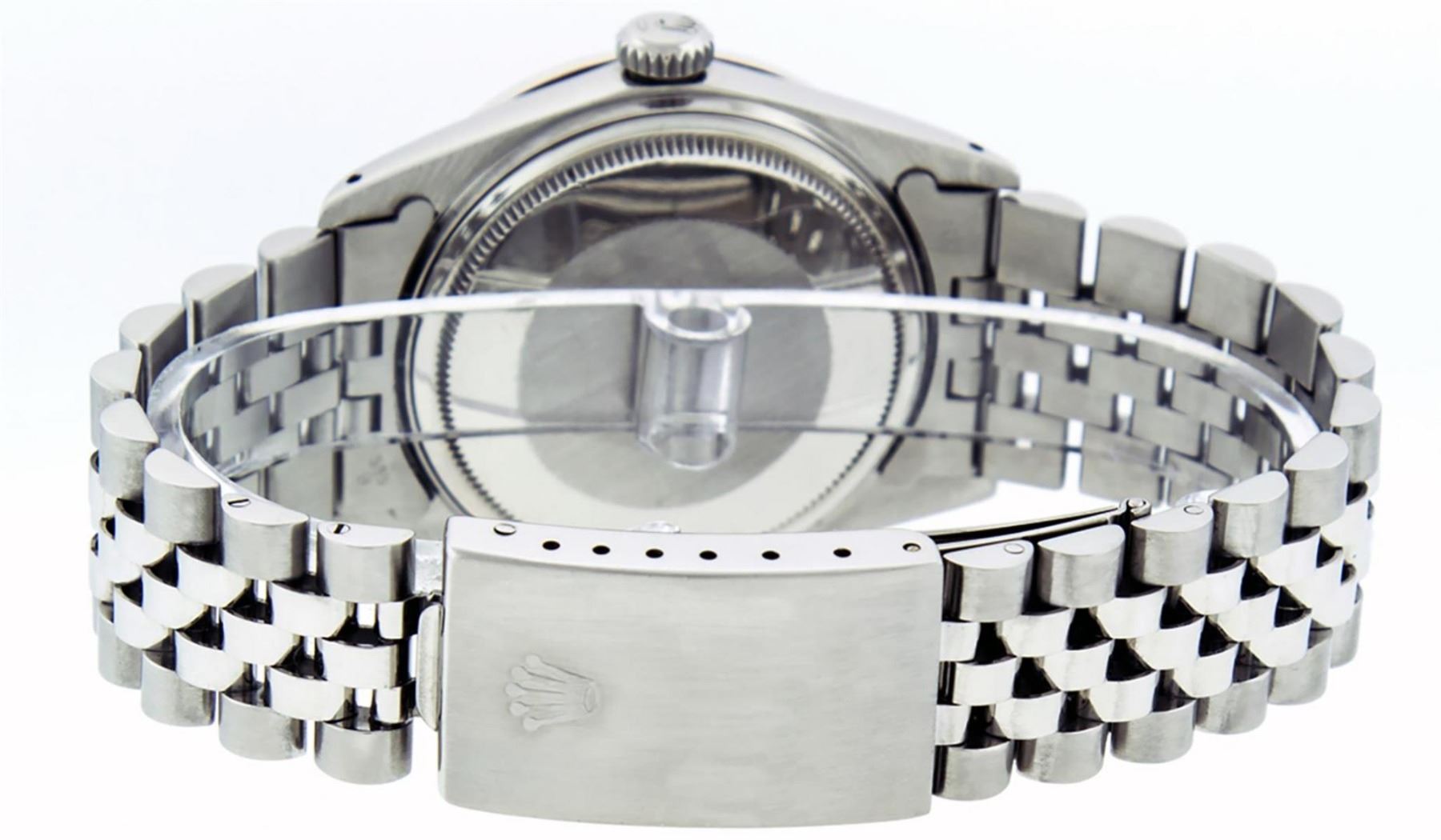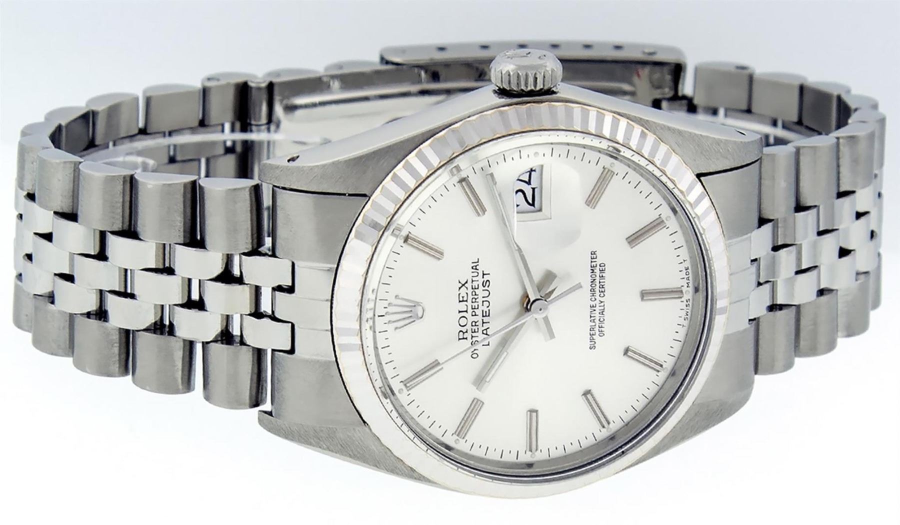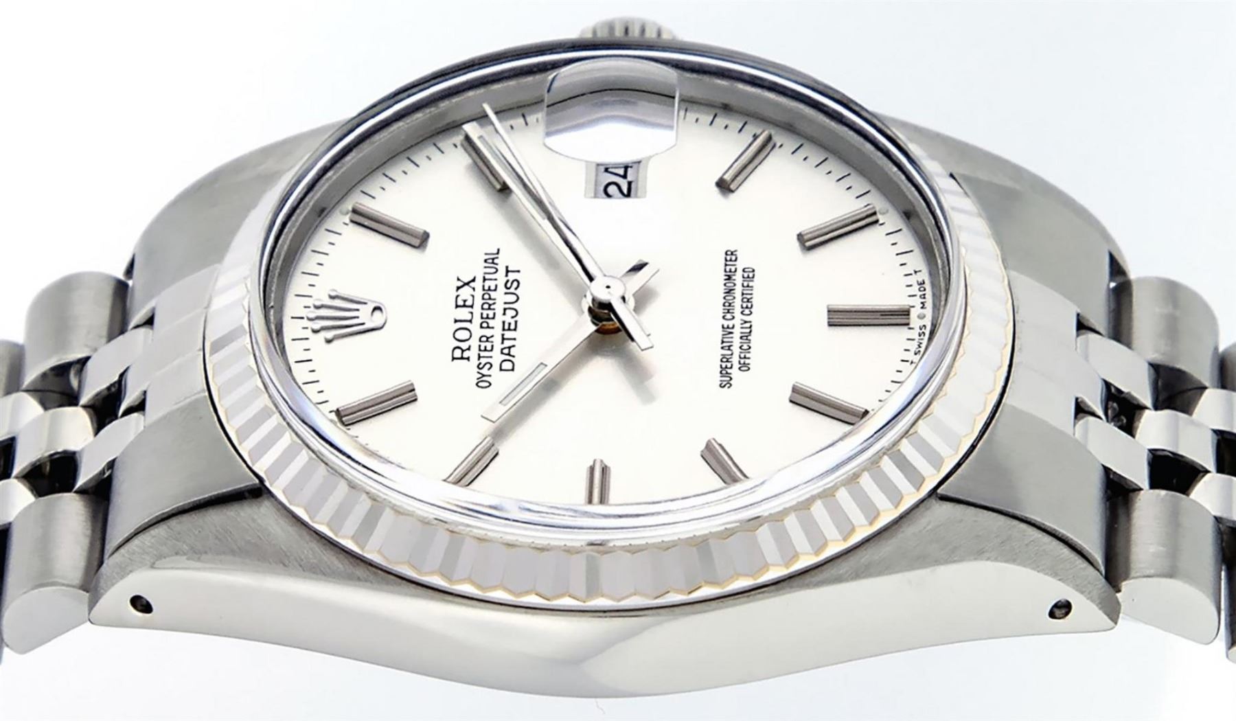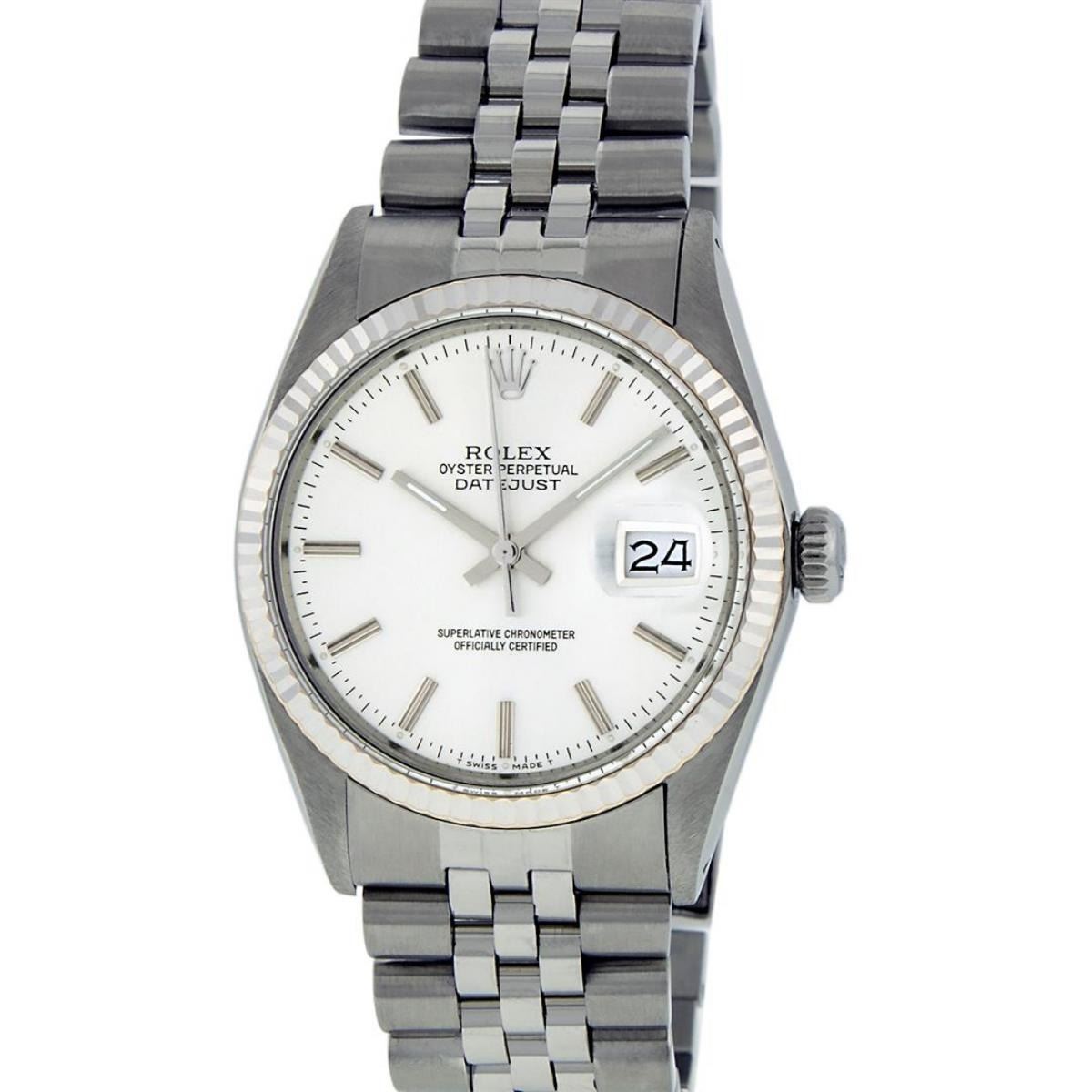 One Mens Stainless Steel Rolex Datejust Polished, Serviced & Electronically Tested, Stainless Steel Case: 36mm, Stainless Steel Crown, Bezel: 14K White Gold Fluted Bezel. Custom Crystal: New Acrylic Cyclops Lens. Custom Hands: New Luminescent Hands. Movement: Automatic Winding Movement Caliber 3035. Custom Dial: Silver Index With Dash Track. Date Window: 3 O'Clock Position Date Display, Quickset, Model: Datejust, Condition: G-6 Extra Fine. Bracelet: Stainless Steel Jubilee Band. Bright Polish & Satin Finish. 7.0 Inch Length, Adjustable. Standard Clasp, With Rolex Logo. This Watch Has Been Serviced Time Tested And Is In Excellent Condition It Is Free Of All Scratches And Dents.