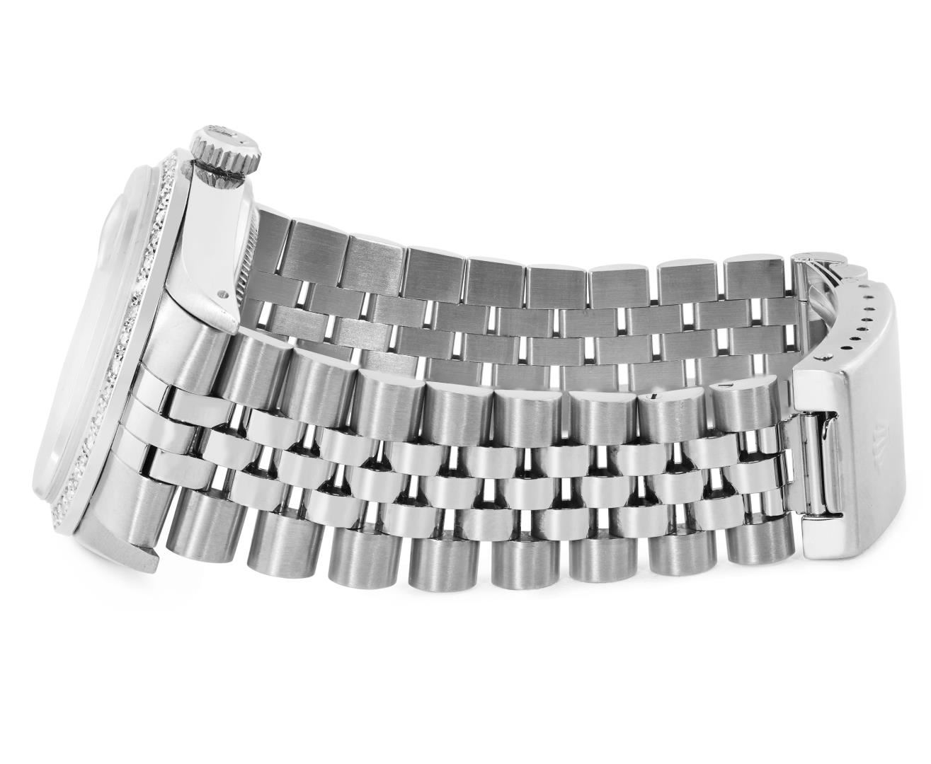 One Mens Pre Owned Stainless Steel Rolex Datejust Polished Bright with Satin Finish, This Watch Has Been Serviced And Electronically Tested, Rolex Stainless Steel Case: 36mm, Rolex Stainless Steel Crown, Custom Bezel: New 18K Beadset Diamond Bezel, Diamond Count: 44 Diamonds. Custom Crystal: New Sapphire With Date Window. Custom Hands: New Luminescent Hands. Rolex Movement: Automatic Winding Movement 3035. Rolex Dial: Silver Index Dial With Dash Track. Date Window: 3 O'Clock Position Date Display, Quickset, Model: Quickset Datejust, Condition: G-6 Extra Fine. Rolex Bracelet: Stainless Steel Jubilee Band. Bracelet: 7.0 Inch Length, Adjustable. Standard Clasp, With Rolex Logo. This Watch Has Been Serviced Time Tested And Is In Excellent Condition It Is Free Of All Scratches And Dents.