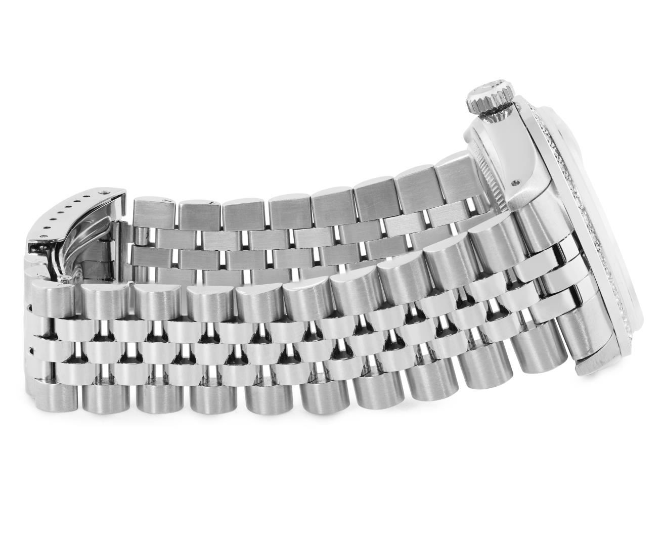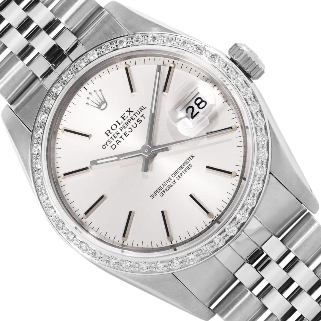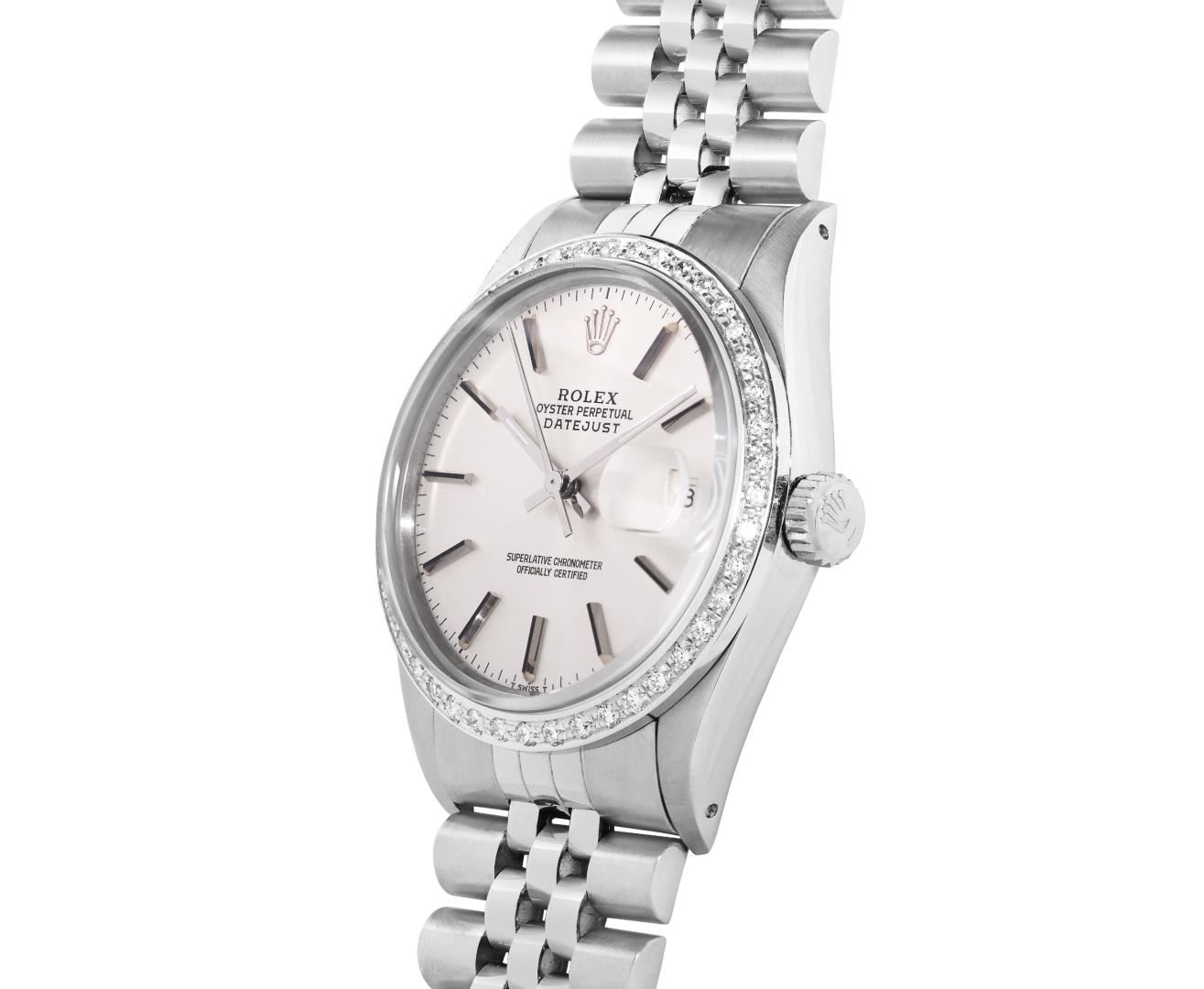 One Mens Pre Owned Stainless Steel Rolex Datejust Polished Bright with Satin Finish, This Watch Has Been Serviced And Electronically Tested, Rolex Stainless Steel Case: 36mm, Rolex Stainless Steel Crown, Custom Bezel: New 18K Beadset Diamond Bezel, Diamond Count: 44 Diamonds. Custom Crystal: New Sapphire With Date Window. Custom Hands: New Luminescent Hands. Rolex Movement: Automatic Winding Movement 3035. Rolex Dial: Silver Index Dial With Dash Track. Date Window: 3 O'Clock Position Date Display, Quickset, Model: Quickset Datejust, Condition: G-6 Extra Fine. Rolex Bracelet: Stainless Steel Jubilee Band. Bracelet: 7.0 Inch Length, Adjustable. Standard Clasp, With Rolex Logo. This Watch Has Been Serviced Time Tested And Is In Excellent Condition It Is Free Of All Scratches And Dents.