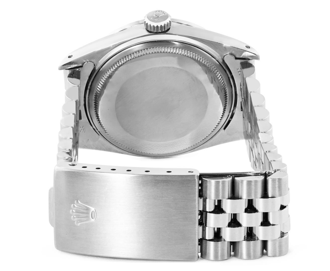One Mens Pre Owned Stainless Steel Rolex Datejust Polished Bright with Satin Finish, This Watch Has Been Serviced And Electronically Tested, Rolex Stainless Steel Case: 36mm, Rolex Stainless Steel Crown, Custom Bezel: New 18K Beadset Diamond Bezel, Diamond Count: 44 Diamonds. Custom Crystal: New Sapphire With Date Window. Custom Hands: New Luminescent Hands. Rolex Movement: Automatic Winding Movement 3035. Rolex Dial: Silver Index Dial With Dash Track. Date Window: 3 O'Clock Position Date Display, Quickset, Model: Quickset Datejust, Condition: G-6 Extra Fine. Rolex Bracelet: Stainless Steel Jubilee Band. Bracelet: 7.0 Inch Length, Adjustable. Standard Clasp, With Rolex Logo. This Watch Has Been Serviced Time Tested And Is In Excellent Condition It Is Free Of All Scratches And Dents.