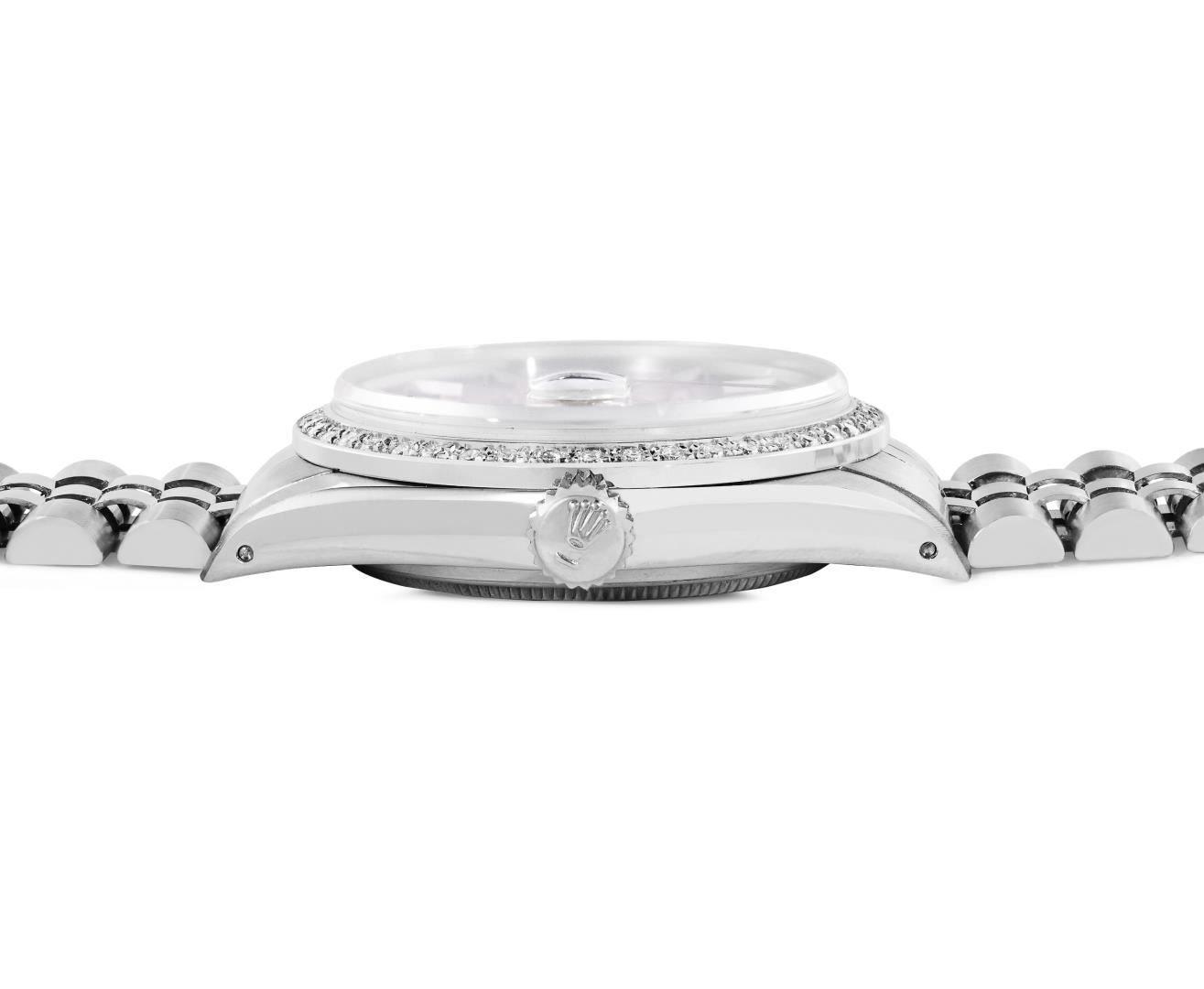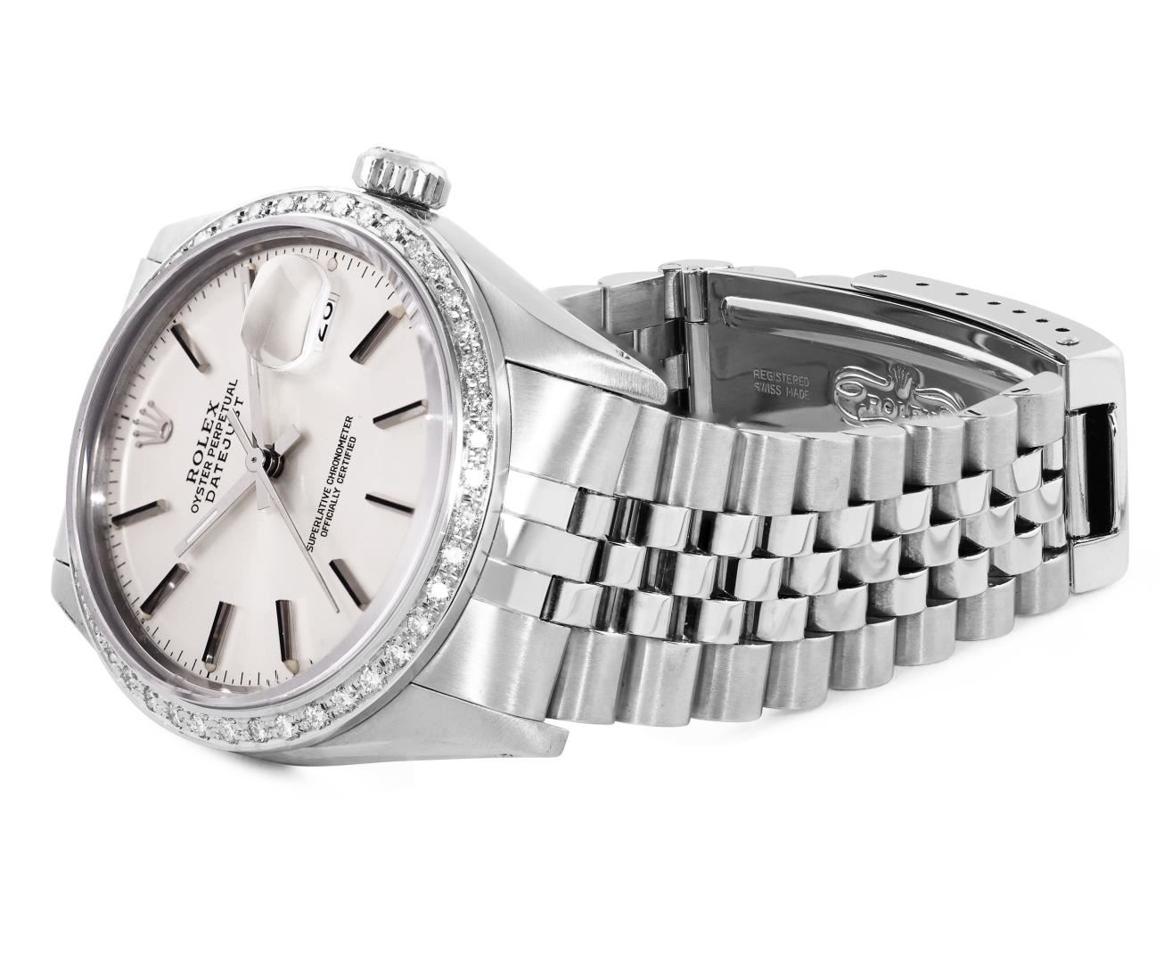 One Mens Pre Owned Stainless Steel Rolex Datejust Polished Bright with Satin Finish, This Watch Has Been Serviced And Electronically Tested, Rolex Stainless Steel Case: 36mm, Rolex Stainless Steel Crown, Custom Bezel: New 18K Beadset Diamond Bezel, Diamond Count: 44 Diamonds. Custom Crystal: New Sapphire With Date Window. Custom Hands: New Luminescent Hands. Rolex Movement: Automatic Winding Movement 3035. Rolex Dial: Silver Index Dial With Dash Track. Date Window: 3 O'Clock Position Date Display, Quickset, Model: Quickset Datejust, Condition: G-6 Extra Fine. Rolex Bracelet: Stainless Steel Jubilee Band. Bracelet: 7.0 Inch Length, Adjustable. Standard Clasp, With Rolex Logo. This Watch Has Been Serviced Time Tested And Is In Excellent Condition It Is Free Of All Scratches And Dents.