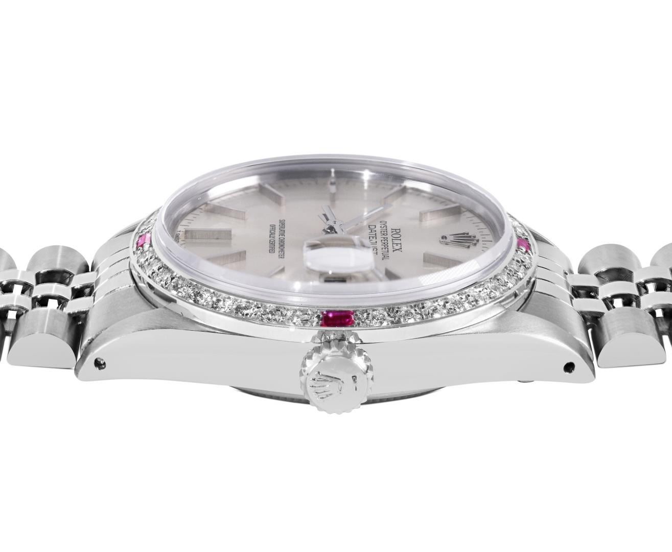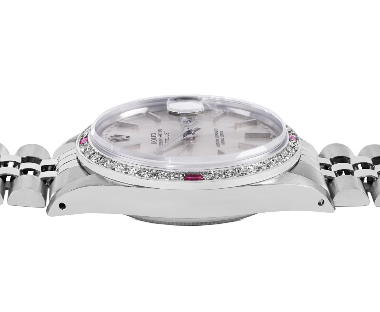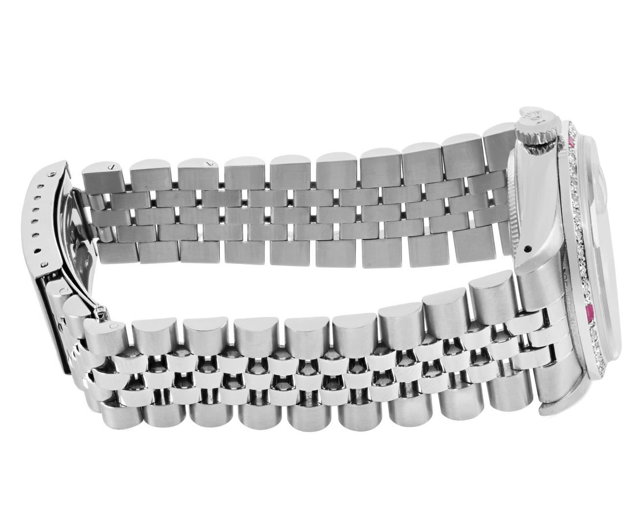 One Mens Pre Owned Rolex Datejust Polished Bright with Satin Finish, This Watch Has Been Serviced & Electronically Tested, Rolex Stainless Steel Case: 36mm, Rolex Stainless Steel Crown, Custom Bezel: New 18K White Gold Ruby Beadset Diamond Bezel, Diamond + Gem Count: 36 Diamonds + 4 Rubies. Custom Crystal: New Sapphire With Date Window. Custom Hands: New Luminescent Hands. Rolex Movement: Automatic Winding Movement 3035. Rolex Dial: Silver Index Dial. Date Window: 3 O'Clock Position Date Display, Quickset, Model: Quickset Datejust, Condition: G-6 Extra Fine. Rolex Bracelet: Stainless Steel Jubilee Band. Bracelet: 7.0 Inch Length, Adjustable. Standard Clasp, With Rolex Logo. This Watch Has Been Serviced Time Tested And Is In Excellent Condition It Is Free Of All Scratches And Dents. This Watch Comes With A Rolex Box.
