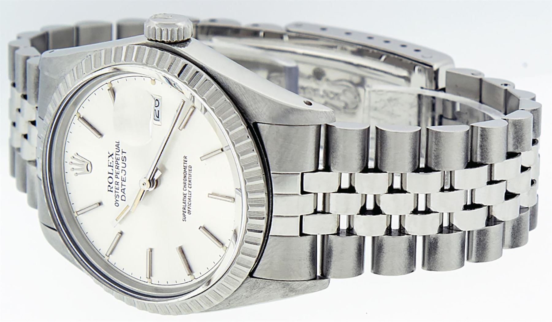 One Mens Pre Owned Stainless Steel Rolex Datejust Polished, Serviced & Electronically Tested, Rolex Stainless Steel Case: 36mm, Stainless Steel Crown, Rolex Bezel: Stainless Steel Engine Turn Bezel. Custom Crystal: Acrylic With Date Window. Hands: Luminescent Hands. Rolex Movement: Automatic Winding Movement 3035. Rolex Dial: Silver Index With Dash Track And Lumi Dots. Date Window: 3 O'Clock Position Date Display, Quickset, Model: Datejust, Condition: G-6 Extra Fine. Rolex Bracelet: Stainless Steel Jubilee Band. Bright Polish & Satin Finish. 7.0 Inch Length, Adjustable. Standard Clasp, With Rolex Logo. This Watch Has Been Serviced Time Tested And Is In Excellent Condition It Is Free Of All Scratches And Dents.