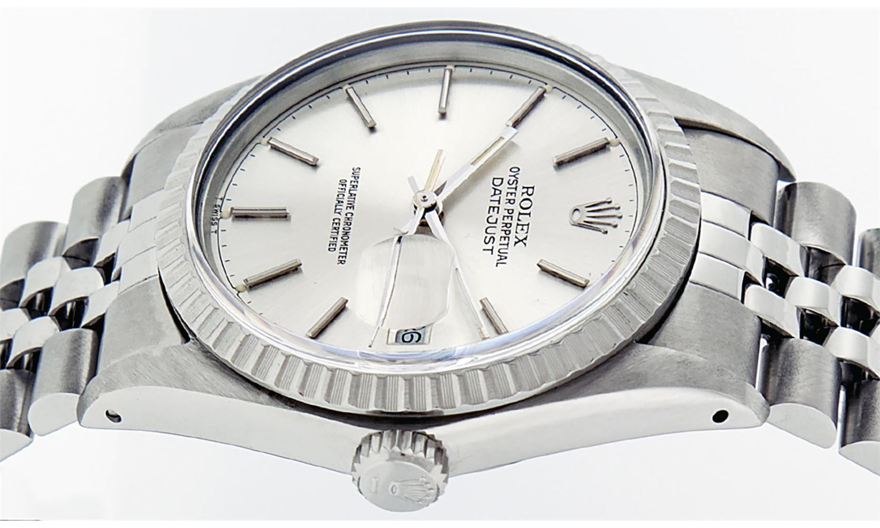 One Mens Pre Owned Stainless Steel Rolex Datejust Polished, Serviced & Electronically Tested, Rolex Stainless Steel Case: 36mm, Stainless Steel Crown, Rolex Bezel: Stainless Steel Engine Turn Bezel. Custom Crystal: Acrylic With Date Window. Hands: Luminescent Hands. Rolex Movement: Automatic Winding Movement 3035. Rolex Dial: Silver Index With Dash Track And Lumi Dots. Date Window: 3 O'Clock Position Date Display, Quickset, Model: Datejust, Condition: G-6 Extra Fine. Rolex Bracelet: Stainless Steel Jubilee Band. Bright Polish & Satin Finish. 7.0 Inch Length, Adjustable. Standard Clasp, With Rolex Logo. This Watch Has Been Serviced Time Tested And Is In Excellent Condition It Is Free Of All Scratches And Dents.