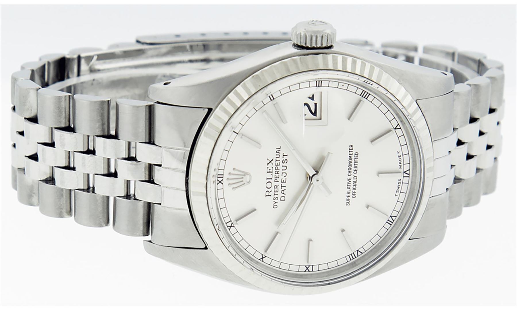 One Mens Rolex Stainless Steel Rolex Datejust Polished, Serviced & Electronically Tested, Stainless Steel Case: 36mm, Stainless Steel Crown, Bezel: 14K White Gold Fluted Bezel. Custom Crystal: New Acrylic Cyclops Lens. Custom Hands: New Luminescent Hands. Movement: Automatic Winding Movement Caliber 3035. Custom Dial: Silver Index With Roman Square Track. Date Window: 3 O'Clock Position Date Display, Quickset, Model: Datejust, Condition: G-6 Extra Fine. Bracelet: Stainless Steel Jubilee Band. Bright Polish & Satin Finish. 7.0 Inch Length, Adjustable. Standard Clasp, With Rolex Logo. This Watch Has Been Serviced Time Tested And Is In Excellent Condition It Is Free Of All Scratches And Dents.