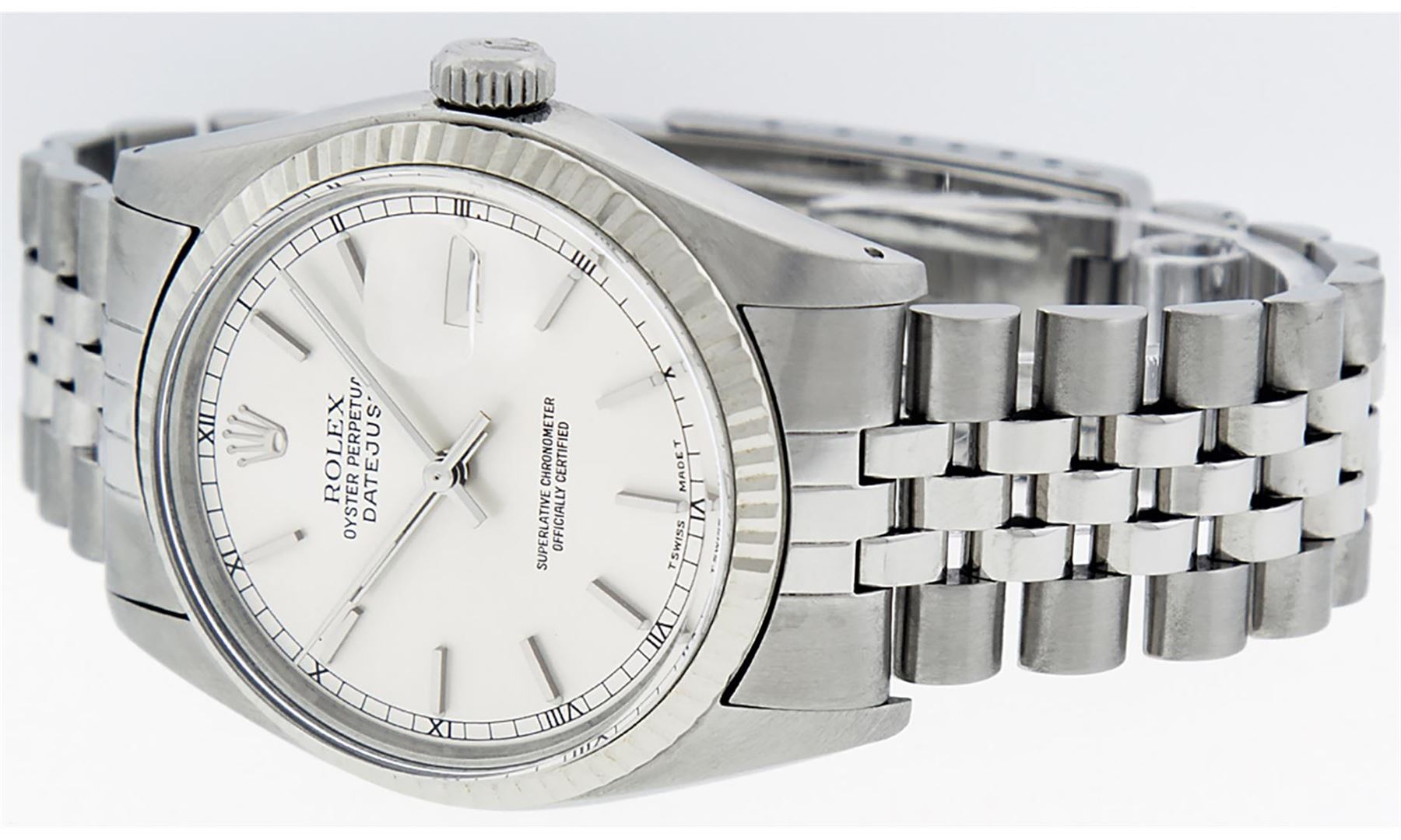 One Mens Rolex Stainless Steel Rolex Datejust Polished, Serviced & Electronically Tested, Stainless Steel Case: 36mm, Stainless Steel Crown, Bezel: 14K White Gold Fluted Bezel. Custom Crystal: New Acrylic Cyclops Lens. Custom Hands: New Luminescent Hands. Movement: Automatic Winding Movement Caliber 3035. Custom Dial: Silver Index With Roman Square Track. Date Window: 3 O'Clock Position Date Display, Quickset, Model: Datejust, Condition: G-6 Extra Fine. Bracelet: Stainless Steel Jubilee Band. Bright Polish & Satin Finish. 7.0 Inch Length, Adjustable. Standard Clasp, With Rolex Logo. This Watch Has Been Serviced Time Tested And Is In Excellent Condition It Is Free Of All Scratches And Dents.