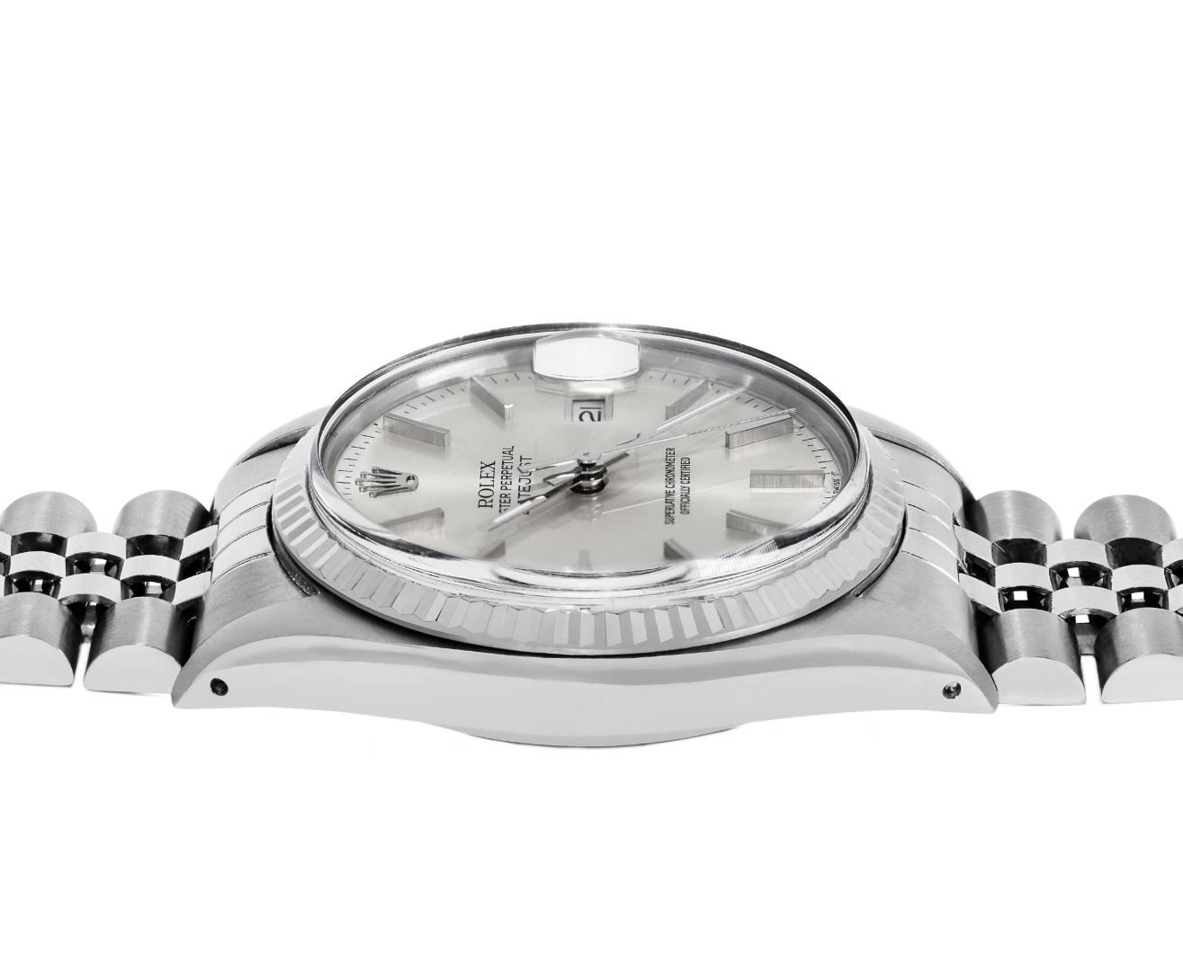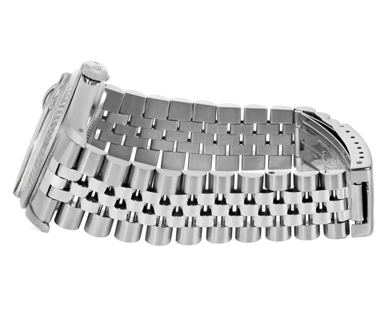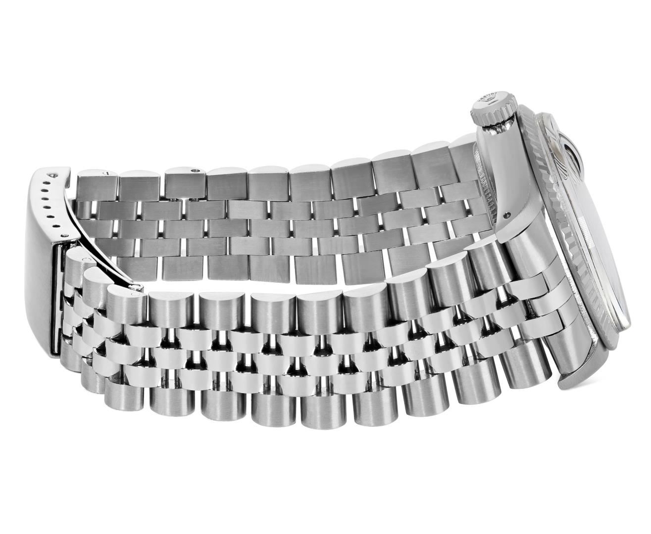 One Mens Pre Owned Rolex Stainless Steel Datejust Polished Bright with Satin Finish, Serviced & Electronically Tested, Rolex Stainless Steel Case: 36mm, Rolex Stainless Steel Crown, Rolex Bezel: White Gold Fluted Bezel. Custom Crystal: New Acrylic Crystal With Magnifying Date Window. Rolex Movement: Automatic Winding Movement Caliber 3035. Rolex Dial: Silver Index With Open Track and Lumi Dots. Hands: White Lumi Hands. Date Window: 3 O'Clock Position Date Display, Quickset, Model: Quickset Datejust. Condition: G-6 Extra Fine. Rolex Bracelet: Stainless Steel Jubilee Band. Bright Polish & Satin Finish. 7.0 Inch Length, Adjustable. Standard Clasp, With Rolex Logo. This Watch Has Been Serviced Time Tested And Is In Excellent Condition It Is Free Of All Scratches And Dents.