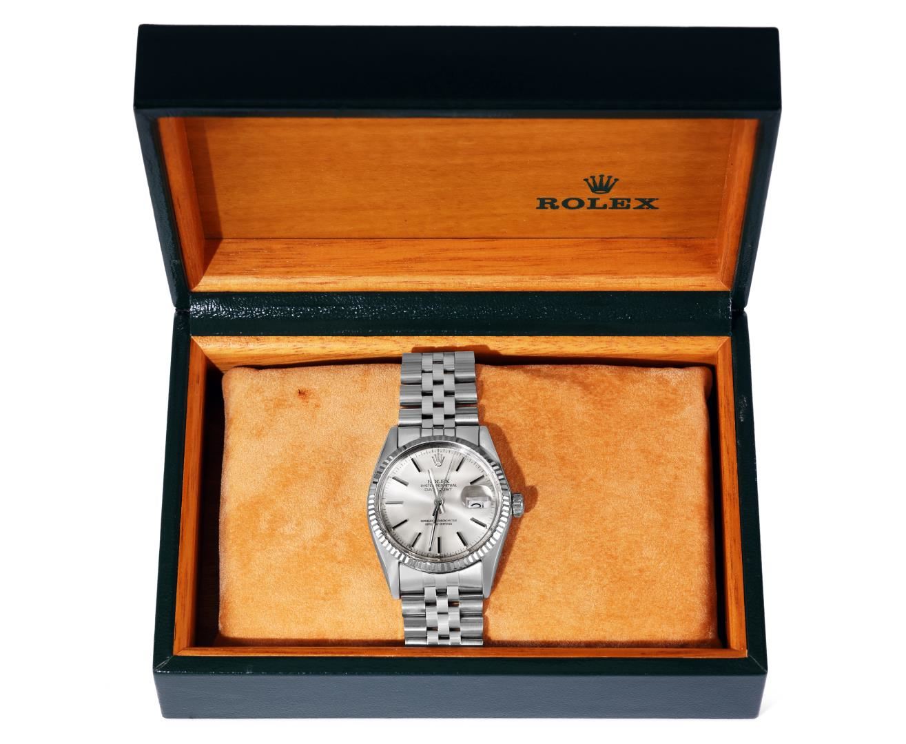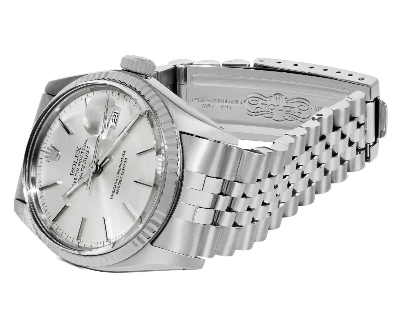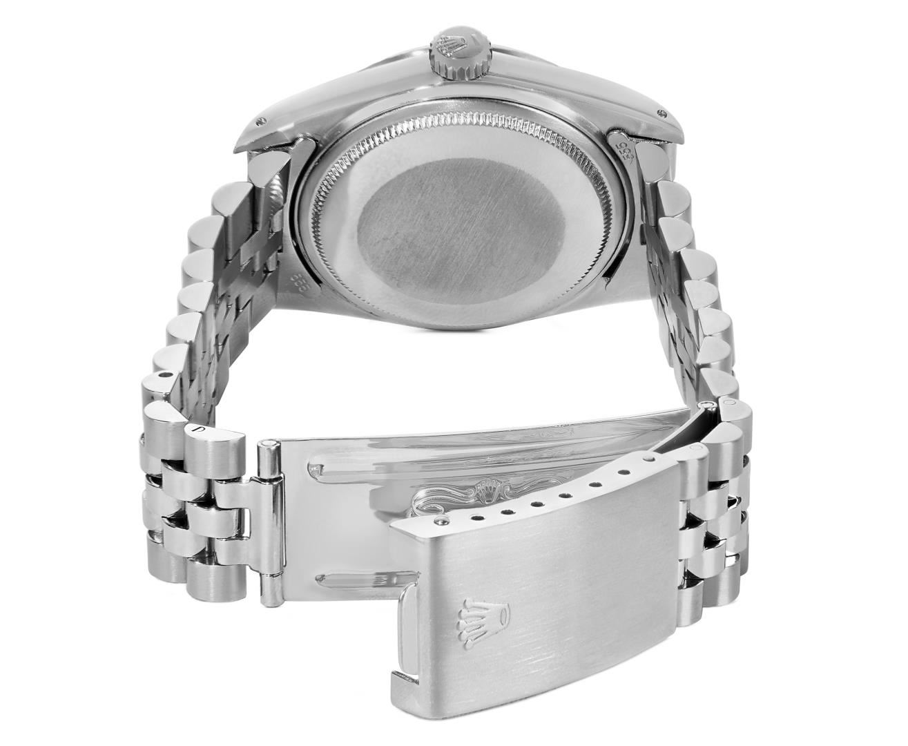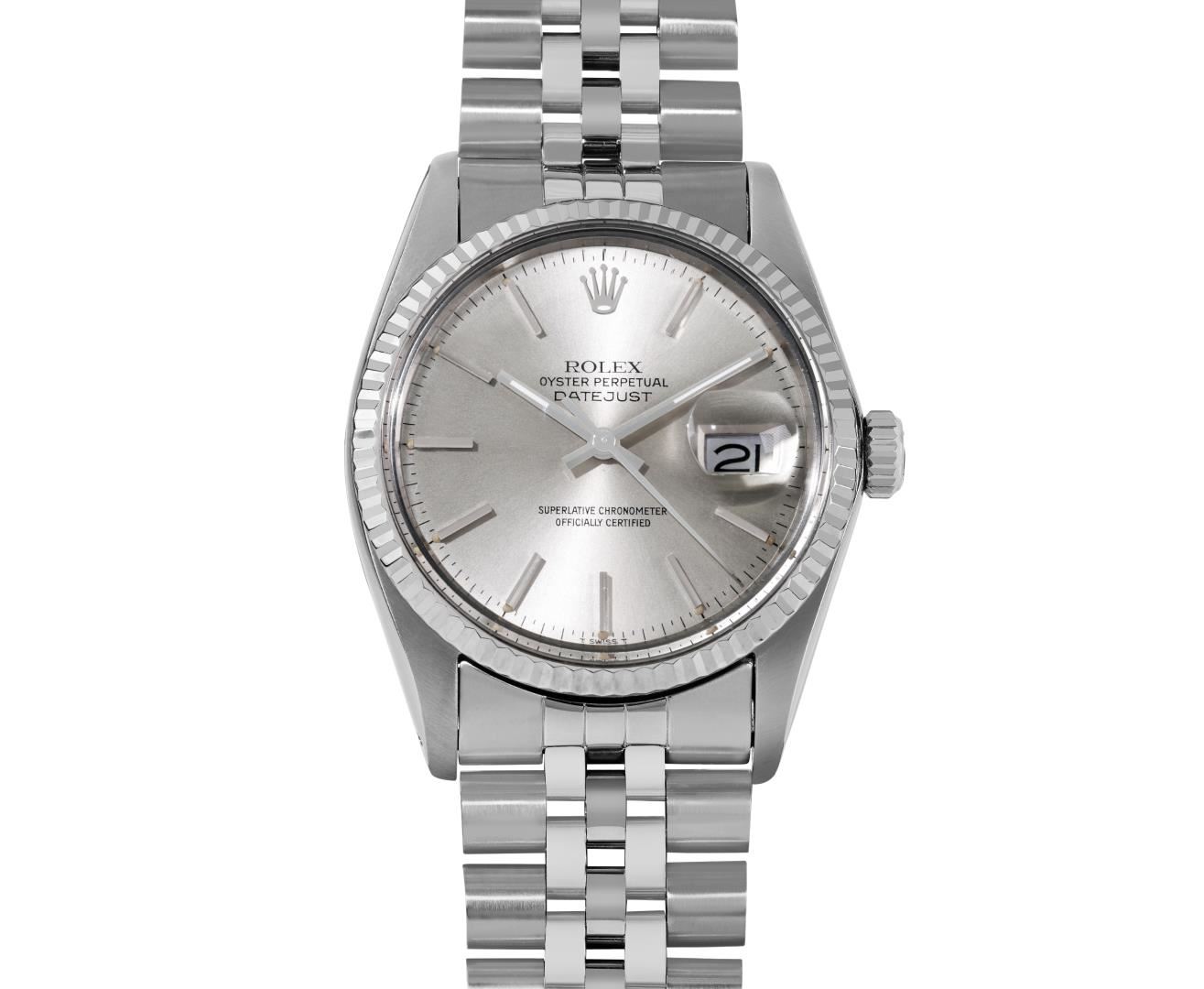 One Mens Pre Owned Rolex Stainless Steel Datejust Polished Bright with Satin Finish, Serviced & Electronically Tested, Rolex Stainless Steel Case: 36mm, Rolex Stainless Steel Crown, Rolex Bezel: White Gold Fluted Bezel. Custom Crystal: New Acrylic Crystal With Magnifying Date Window. Rolex Movement: Automatic Winding Movement Caliber 3035. Rolex Dial: Silver Index With Open Track and Lumi Dots. Hands: White Lumi Hands. Date Window: 3 O'Clock Position Date Display, Quickset, Model: Quickset Datejust. Condition: G-6 Extra Fine. Rolex Bracelet: Stainless Steel Jubilee Band. Bright Polish & Satin Finish. 7.0 Inch Length, Adjustable. Standard Clasp, With Rolex Logo. This Watch Has Been Serviced Time Tested And Is In Excellent Condition It Is Free Of All Scratches And Dents.