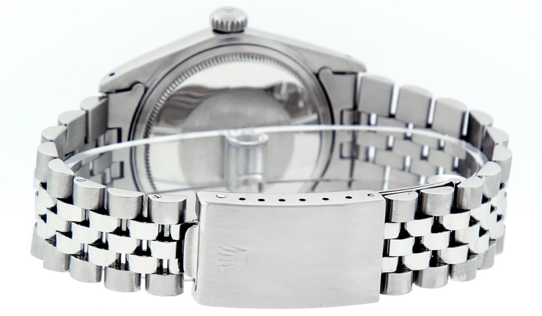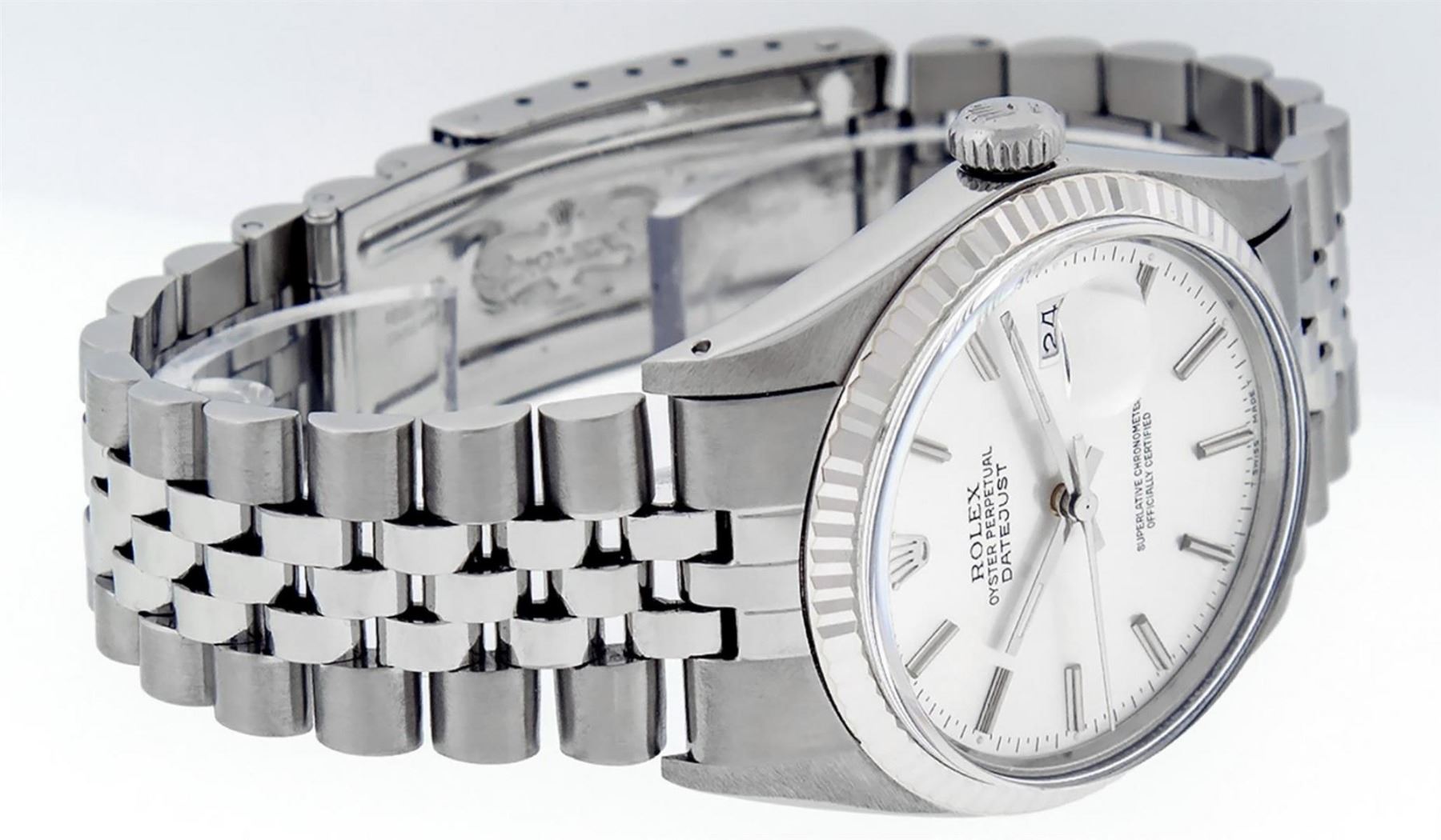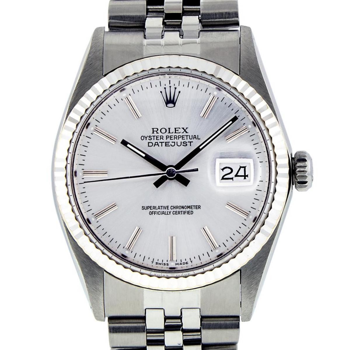 One Mens Stainless Steel Rolex Datejust Polished, Serviced & Electronically Tested, Stainless Steel Case: 36mm, Stainless Steel Crown, Bezel: 14K White Gold Fluted Bezel. Custom Crystal: New Acrylic Cyclops Lens. Custom Hands: New Luminescent Hands. Movement: Automatic Winding Movement Caliber 3035. Custom Dial: Slate Grey Index With Dash Track. Date Window: 3 O'Clock Position Date Display, Quickset, Model: Datejust, Condition: G-6 Extra Fine. Bracelet: Stainless Steel Jubilee Band. Bright Polish & Satin Finish. 7.0 Inch Length, Adjustable. Standard Clasp, With Rolex Logo. This Watch Has Been Serviced Time Tested And Is In Excellent Condition It Is Free Of All Scratches And Dents.
