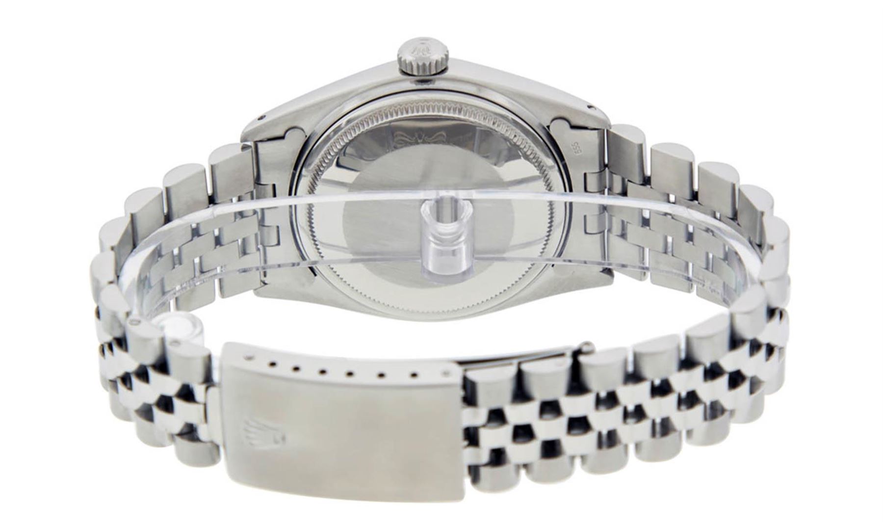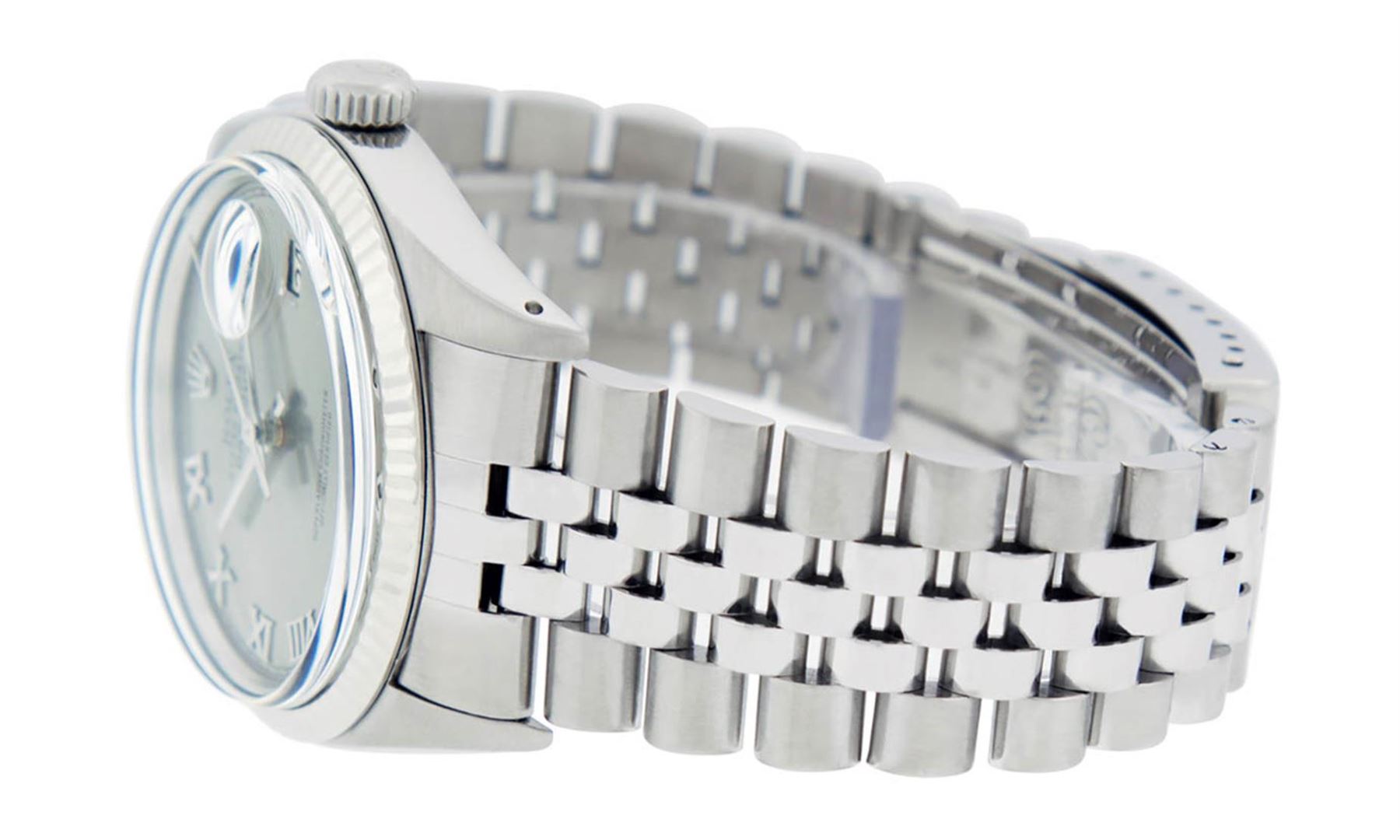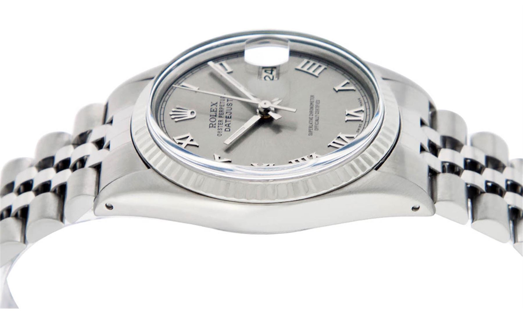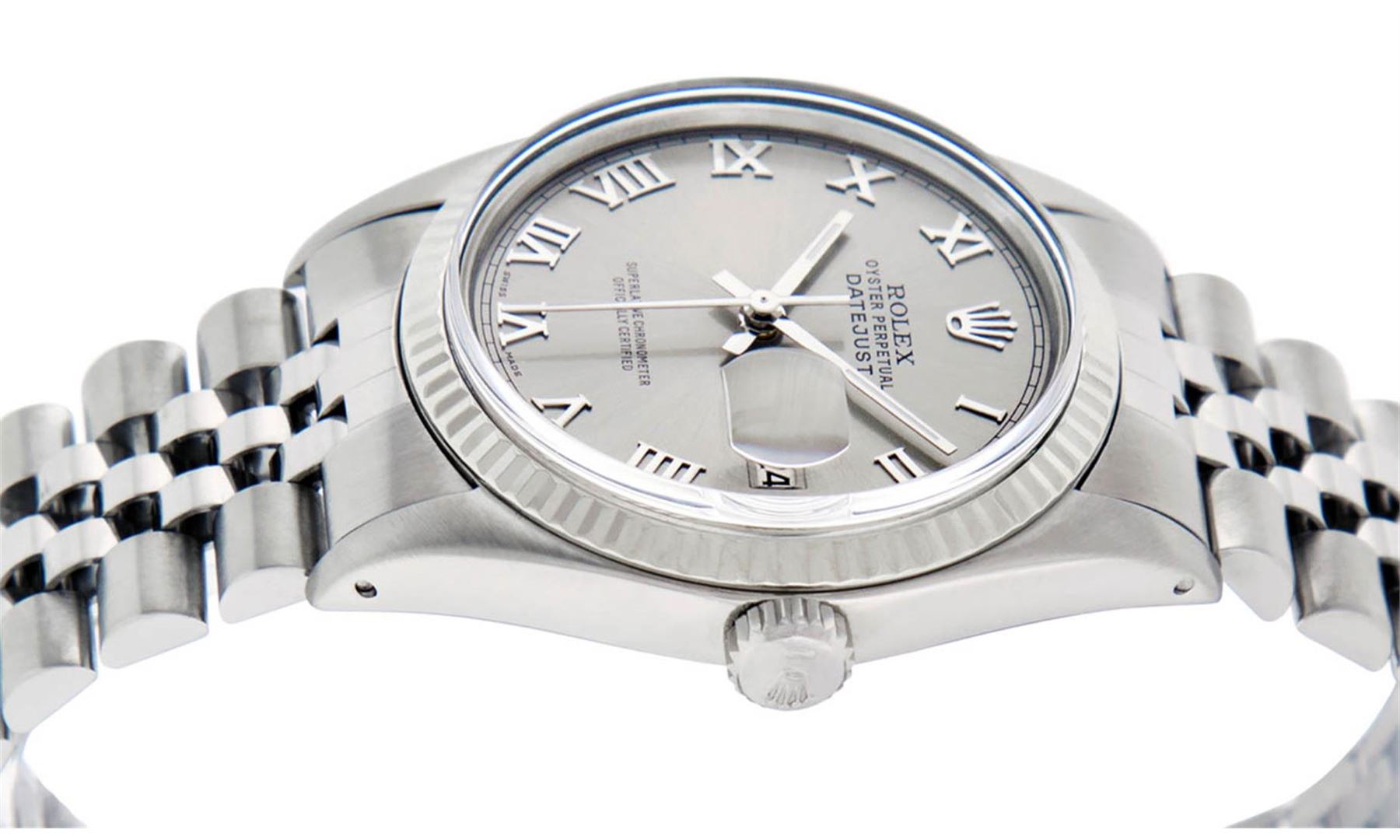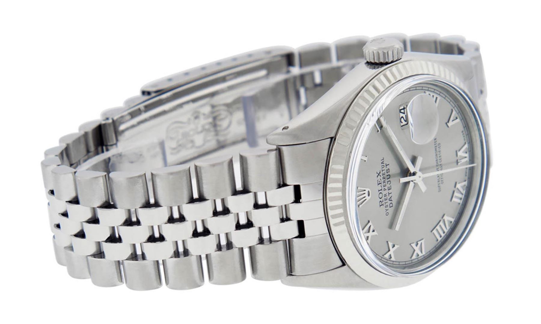 One Mens Stainless Steel Rolex Datejust Polished, Serviced & Electronically Tested, Stainless Steel Case: 36mm, Stainless Steel Crown, Bezel: 14K White Gold Fluted Bezel. Custom Crystal: New Acrylic Cyclops Lens. Custom Hands: New Luminescent Hands. Movement: Automatic Winding Movement Caliber 3035. Custom Dial: Slate Grey Roman With Square Track. Date Window: 3 O'Clock Position Date Display, Quickset, Model: Datejust, Condition: G-6 Extra Fine. Bracelet: Stainless Steel Jubilee. Bright Polish & Satin Finish. 7.0 Inch Length, Adjustable. Standard Clasp, With Rolex Logo. This Watch Has Been Serviced Time Tested And Is In Excellent Condition It Is Free Of All Scratches And Dents
