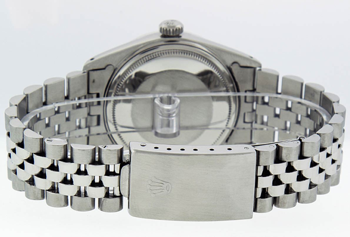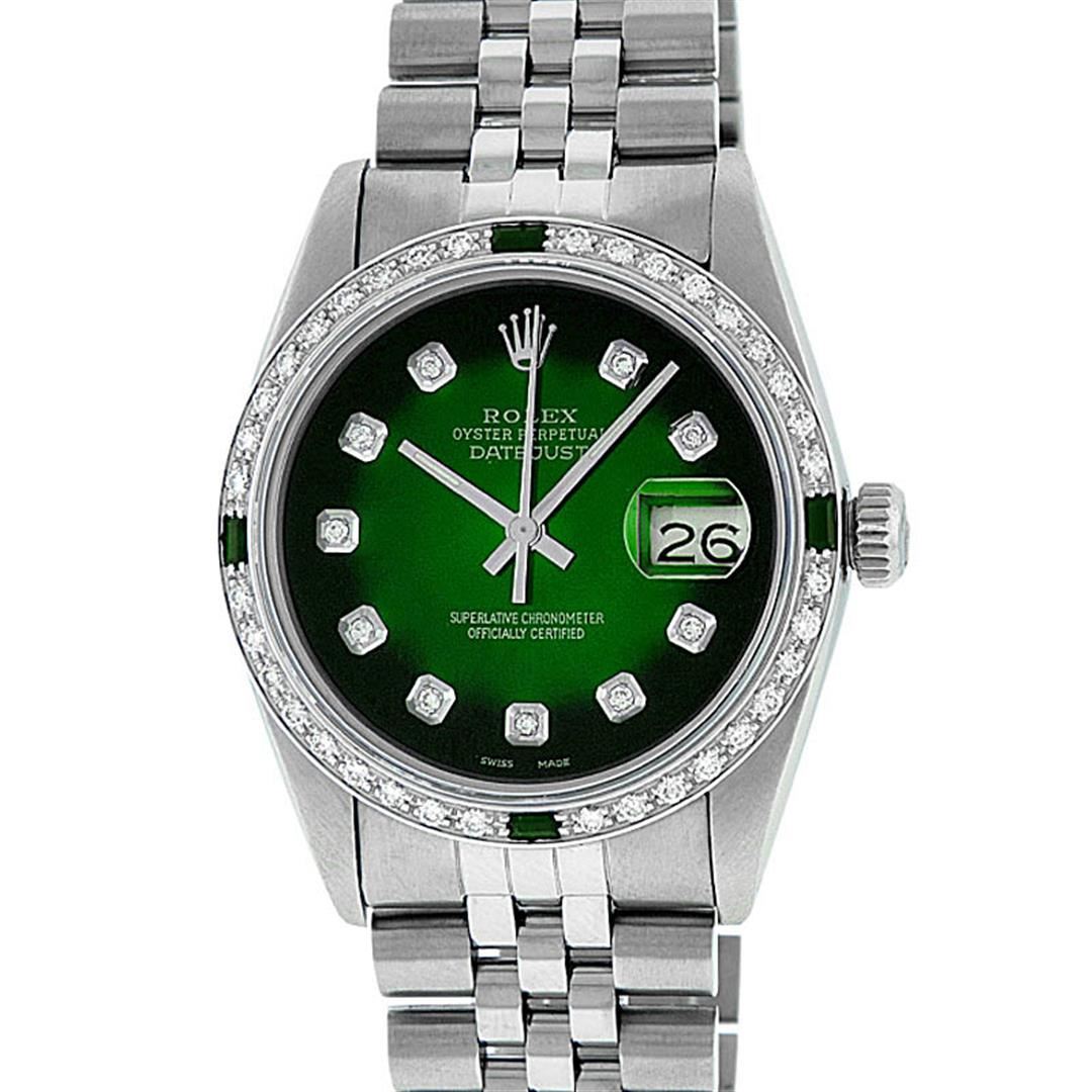 One Mens Rolex Datejust Polished, Serviced & Electronically Tested, Stainless Steel Case: 36mm, Stainless Steel Crown, Custom Bezel: 18K White Gold Synthetic Emerald Beadset Diamond Bezel, Diamond + Gem Count: 36 Diamonds + 4 Synthetic Emeralds, Total Weight 1.00 Carat, Clarity: SI-VS, Color: G to H. Custom Crystal: New Synthetic Sapphire Cyclops Lens. Custom Hands: New Luminescent Hands. Movement: Automatic Winding Movement Caliber 3035. Custom Dial: Green Vignette With Diamond Hour Markers, 10 Diamonds In Dial G To H In Color, Clarity: SI-VS. Date Window: 3 O'Clock Position Date Display, Quickset, Model: Datejust. Condition: G-6 Extra Fine. Bracelet: Stainless Steel Jubilee. Bright Polish & Satin Finish. 7.0 Inch Length, Adjustable. Standard Clasp, With Rolex Logo. This Watch Has Been Serviced Time Tested And Is In Excellent Condition It Is Free Of All Scratches And Dents.
