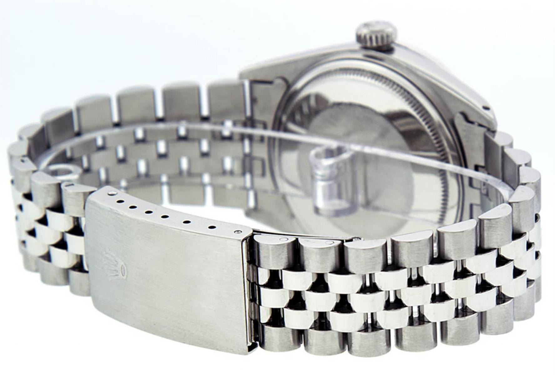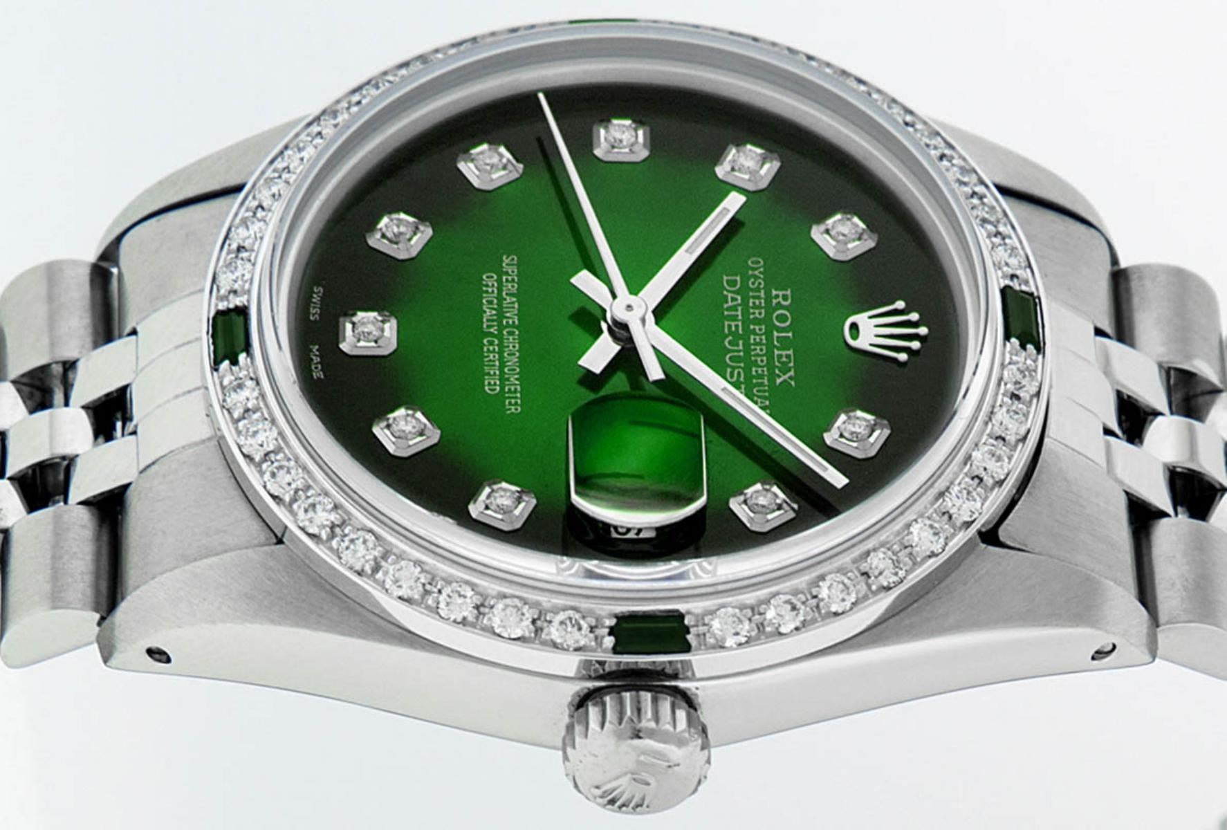One Mens Rolex Datejust Polished, Serviced & Electronically Tested, Stainless Steel Case: 36mm, Stainless Steel Crown, Custom Bezel: 18K White Gold Synthetic Emerald Beadset Diamond Bezel, Diamond + Gem Count: 36 Diamonds + 4 Synthetic Emeralds, Total Weight 1.00 Carat, Clarity: SI-VS, Color: G to H. Custom Crystal: New Synthetic Sapphire Cyclops Lens. Custom Hands: New Luminescent Hands. Movement: Automatic Winding Movement Caliber 3035. Custom Dial: Green Vignette With Diamond Hour Markers, 10 Diamonds In Dial G To H In Color, Clarity: SI-VS. Date Window: 3 O'Clock Position Date Display, Quickset, Model: Datejust. Condition: G-6 Extra Fine. Bracelet: Stainless Steel Jubilee. Bright Polish & Satin Finish. 7.0 Inch Length, Adjustable. Standard Clasp, With Rolex Logo. This Watch Has Been Serviced Time Tested And Is In Excellent Condition It Is Free Of All Scratches And Dents.