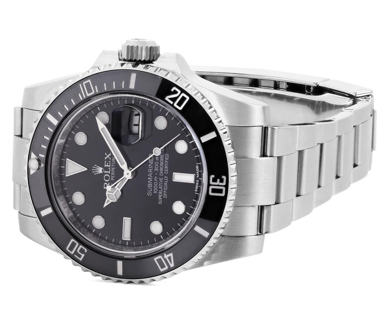 One Mens Pre Owned Ceramic Rolex Submariner With Date Polished, Serviced And Electronically Tested, Rolex Stainless Steel Case: 40mm, Rolex Stainless Steel Crown, Rolex Bezel: Stainless Steel Rotatable Bezel With Black Ceramic Insert. Rolex Crystal: Sapphire With Magnified Date Window. Rolex Movement: Automatic Winding Movement Caliber 3135. Rolex Dial: Rolex Black Submariner Dial with Luminous Index Hour Markers. Date Window: 3 O'Clock Position Date Display, Model: Ceramic Submariner, Quickset, Condition: G-6 Extra Fine. Rolex Bracelet: Stainless Steel Oyster Band. Bright Polish & Satin Finish. 7.0 Inch Length, Adjustable. Standard Clasp, With Rolex Logo. This Watch Has Been Serviced And Polished It Is Free Of All Scratches And Dents.