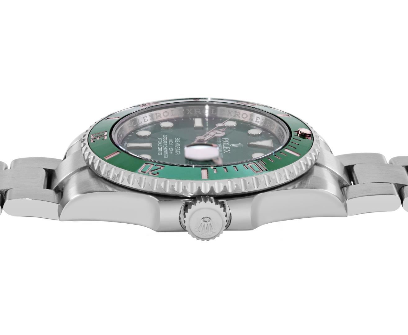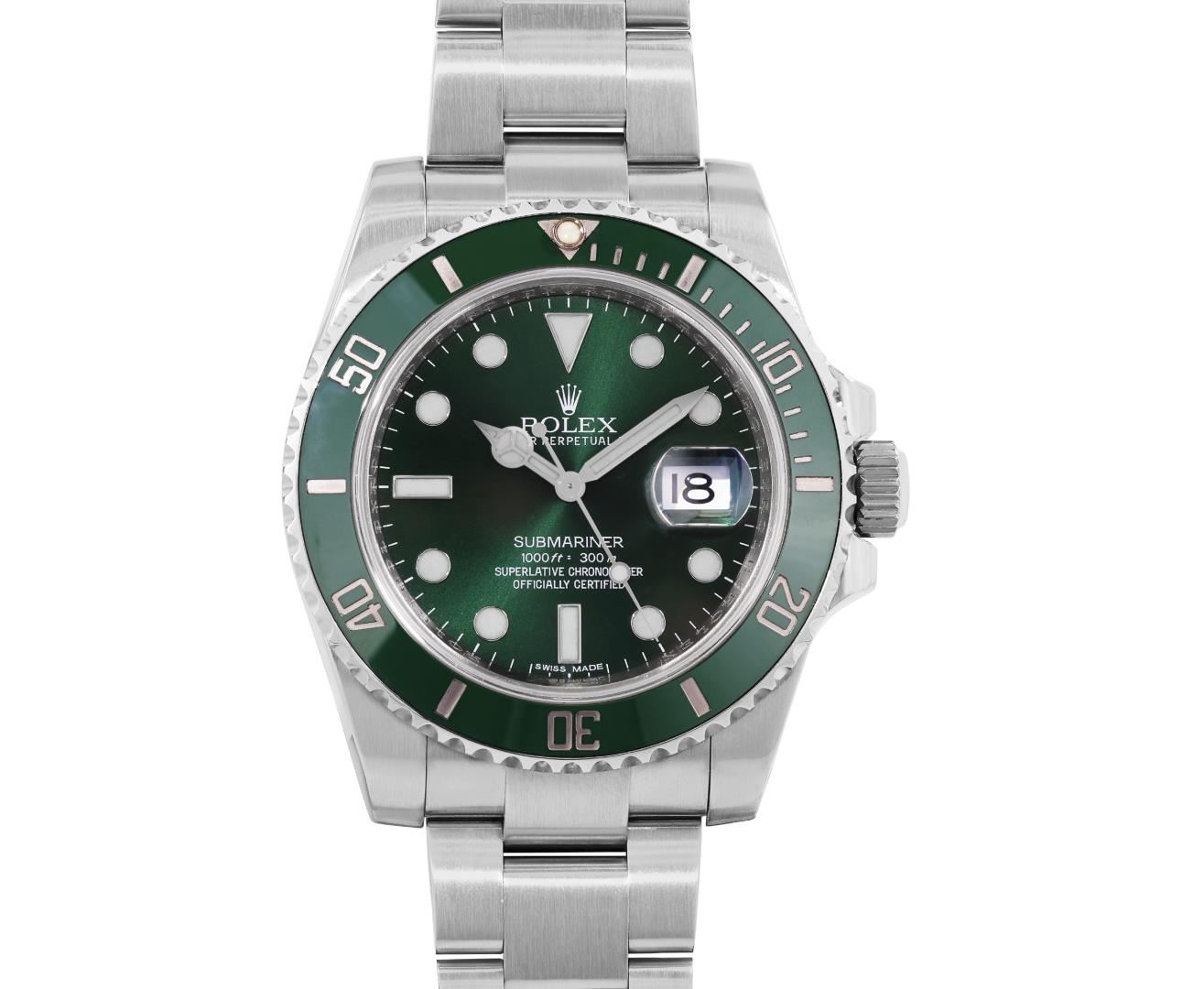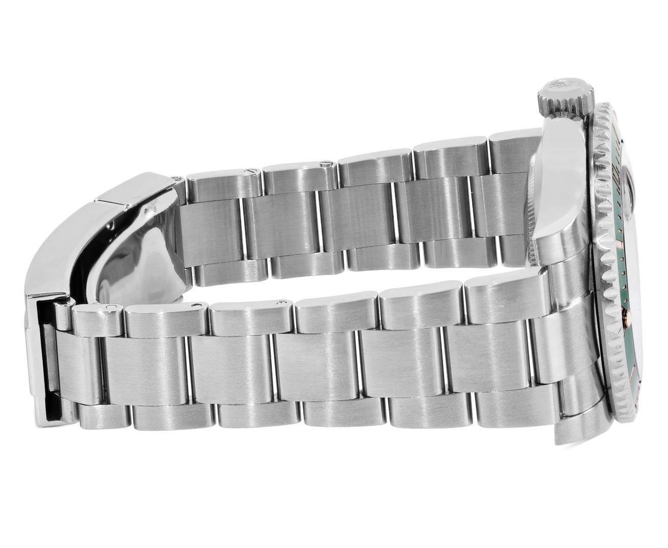 One Mens Pre Owned Rolex Stainless Steel Submariner With Date Polished, Serviced And Electronically Tested, Rolex Stainless Steel Case: 40mm, Rolex Stainless Steel Crown, Rolex Bezel: Stainless Steel Rotatable Bezel With Ceramic Green Insert. Crystal: Sapphire With Magnified Date Window. Rolex Movement: Automatic Winding Movement Caliber 3135. Rolex Dial: Green Submariner Dial with Luminous Index Hour Markers And Dash Track. Date Window: 3 O'Clock Position Date Display, Model: Date Submariner, Quickset, Condition: G-6 Extra Fine. Rolex Bracelet: Stainless Steel Oyster Band. Bright Polish And Satin Finish. 7.0 Inch Length, Adjustable. Standard Clasp, With Rolex Logo.