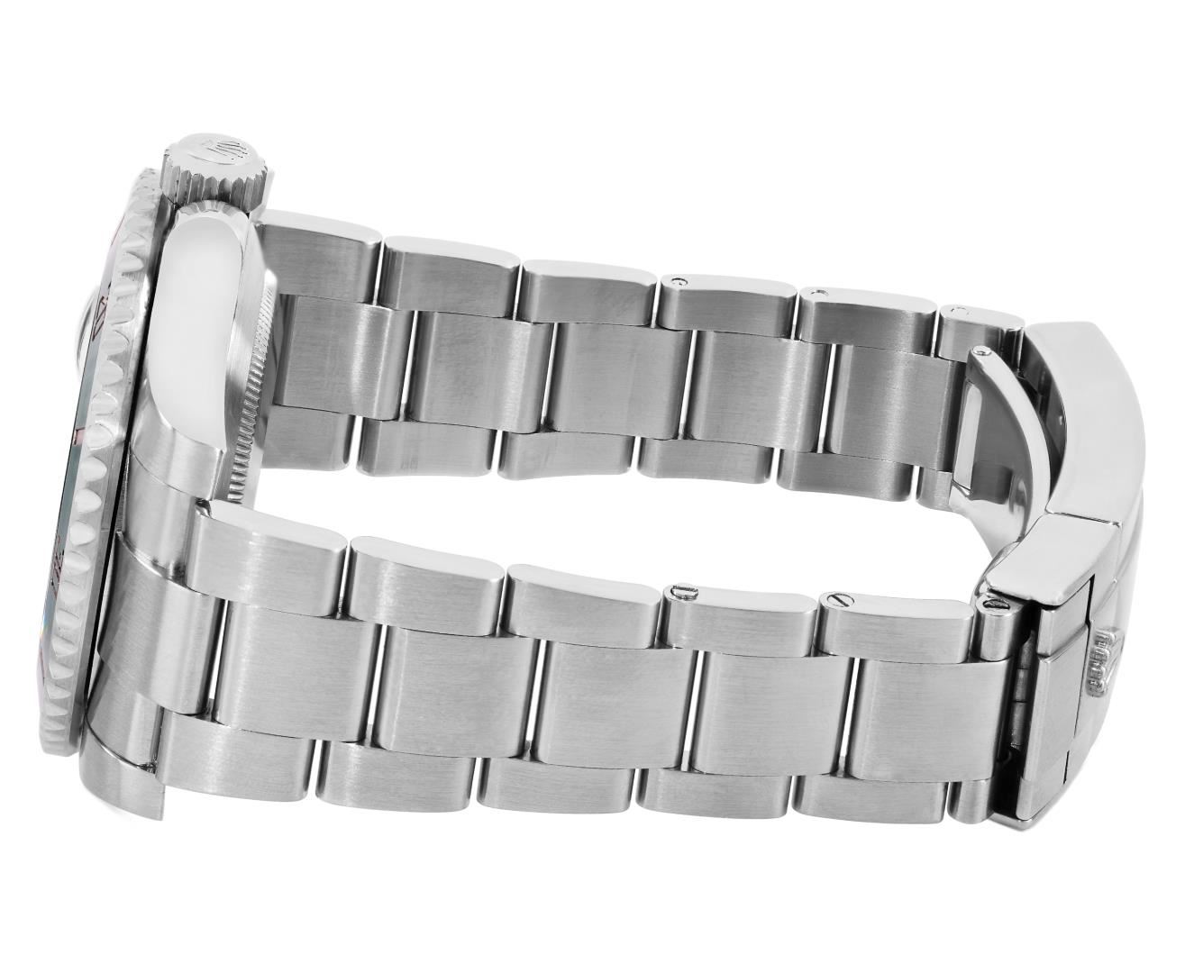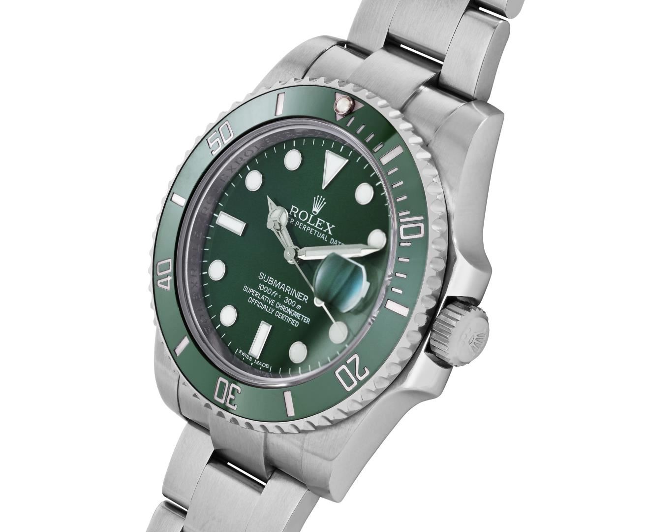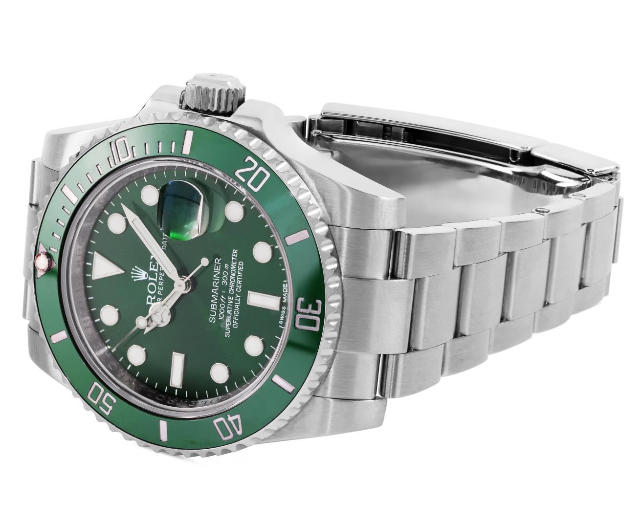 One Mens Pre Owned Rolex Stainless Steel Submariner With Date Polished, Serviced And Electronically Tested, Rolex Stainless Steel Case: 40mm, Rolex Stainless Steel Crown, Rolex Bezel: Stainless Steel Rotatable Bezel With Ceramic Green Insert. Crystal: Sapphire With Magnified Date Window. Rolex Movement: Automatic Winding Movement Caliber 3135. Rolex Dial: Green Submariner Dial with Luminous Index Hour Markers And Dash Track. Date Window: 3 O'Clock Position Date Display, Model: Date Submariner, Quickset, Condition: G-6 Extra Fine. Rolex Bracelet: Stainless Steel Oyster Band. Bright Polish And Satin Finish. 7.0 Inch Length, Adjustable. Standard Clasp, With Rolex Logo.