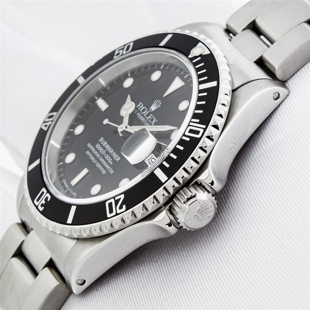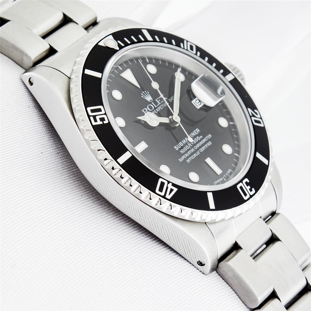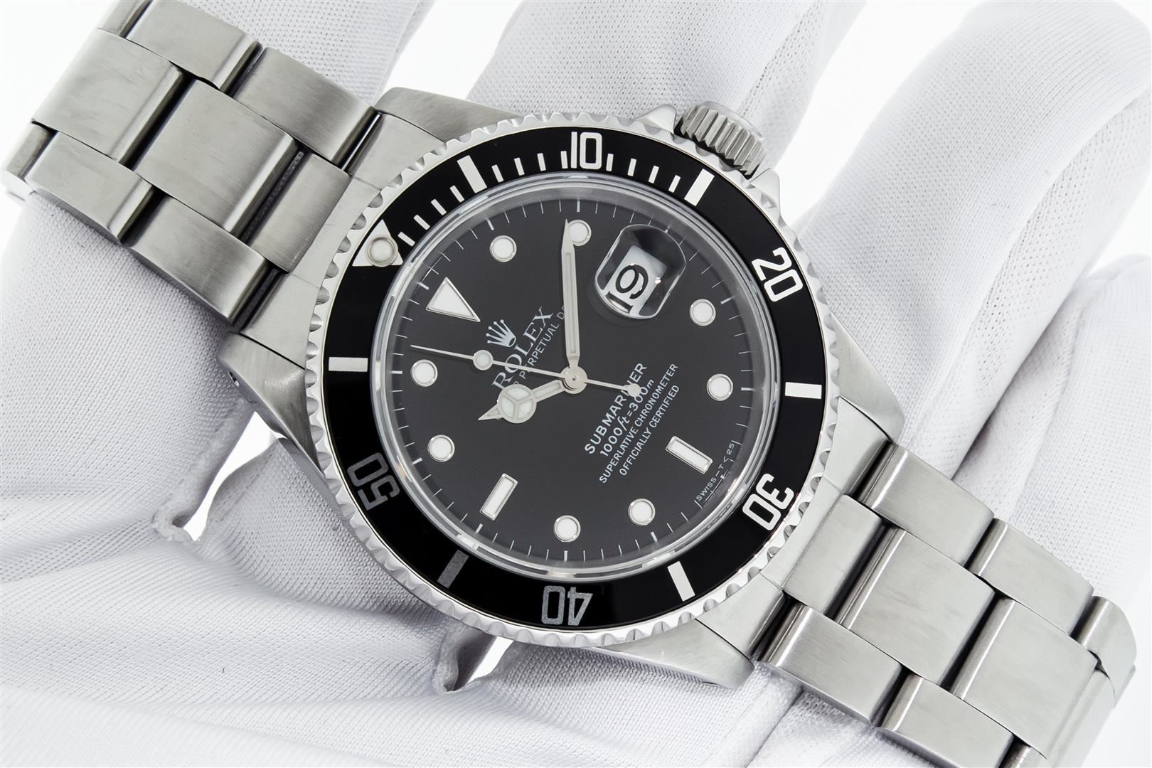 One Mens Pre Owned Rolex Submariner With Date Polished, Serviced & Electronically Tested, Rolex Stainless Steel Case: 40mm, Rolex Stainless Steel Crown, Rolex Bezel: Stainless Steel Rotatable Bezel With Black Insert. Crystal: Sapphire With Magnified Date Window. Rolex Movement: Automatic Winding Movement Caliber 3135. Rolex Dial: Black Submariner Dial with Luminous Index Hour Markers And Dash Track. Date Window: 3 O'Clock Position Date Display, Model: Date Submariner, Quickset, Condition: G-6 Extra Fine. Rolex Bracelet: Stainless Steel Oyster Band. Bright Polish & Satin Finish. 7.0 Inch Length, Adjustable. Standard Clasp, With Rolex Logo.