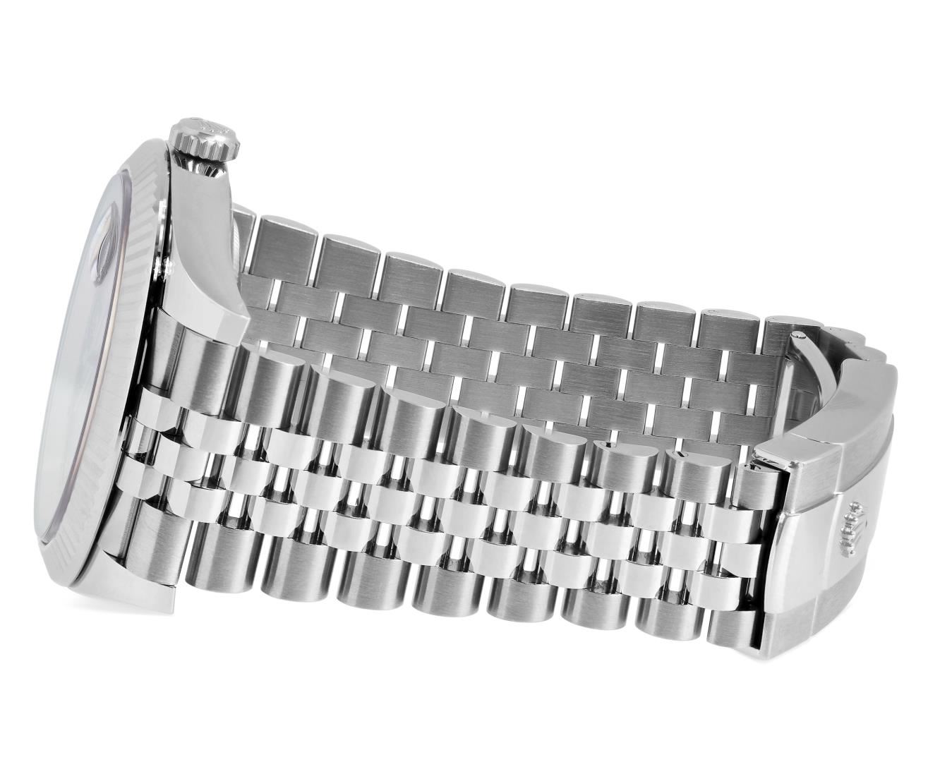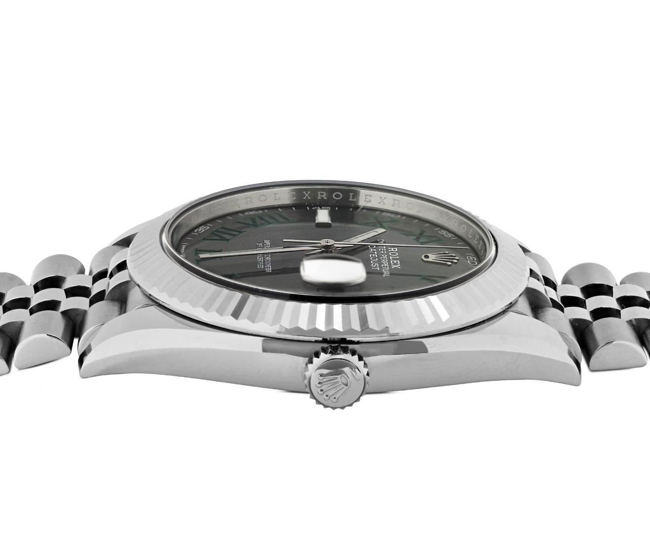 One Mens Pre Owned Stainless Steel Rolex Datejust 41MM Polished, Serviced And Electronically Tested, Rolex Stainless Steel Case: 41mm, Rolex Stainless Steel Crown, Rolex Bezel: 18K White Gold Fluted Bezel. Crystal: Sapphire With Magnified Date Window. Rolex Hands: Lumi Hands. Rolex Movement: Automatic Winding Movement 3235. Rolex Dial: Factory Rolex Wimbledon with Dark Green Roman Numeral Hour Markers. Date Window: 3 O'Clock Position Date Display, Quickset, Model: Datejust 41. Condition: G-6 Extra Fine. Rolex Bracelet: Stainless Steel Jubilee Band. Bright Polish. 7.0 Inch Length, Adjustable. Standard Clasp, With Rolex Logo. This Watch Has Been Serviced And Polished It Is Free Of All Scratches And Dents. This Watch Comes With A Rolex Box And Card.