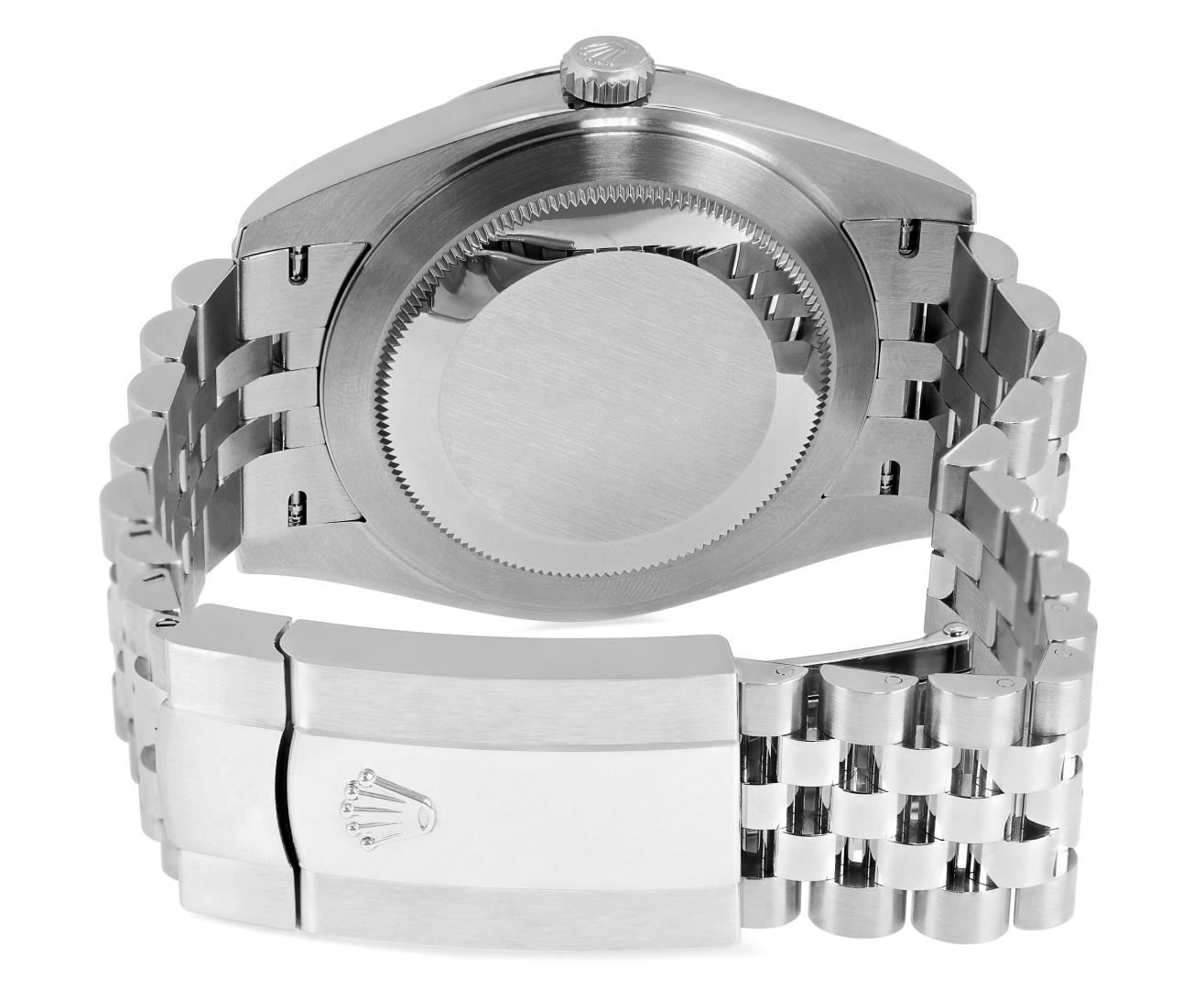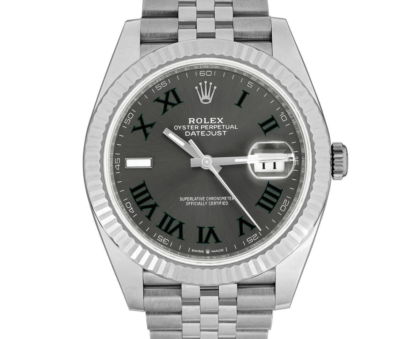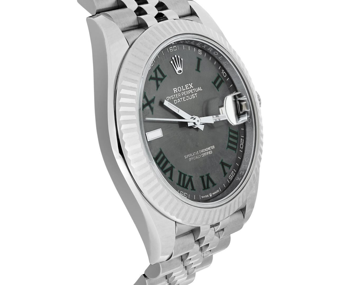 One Mens Pre Owned Stainless Steel Rolex Datejust 41MM Polished, Serviced And Electronically Tested, Rolex Stainless Steel Case: 41mm, Rolex Stainless Steel Crown, Rolex Bezel: 18K White Gold Fluted Bezel. Crystal: Sapphire With Magnified Date Window. Rolex Hands: Lumi Hands. Rolex Movement: Automatic Winding Movement 3235. Rolex Dial: Factory Rolex Wimbledon with Dark Green Roman Numeral Hour Markers. Date Window: 3 O'Clock Position Date Display, Quickset, Model: Datejust 41. Condition: G-6 Extra Fine. Rolex Bracelet: Stainless Steel Jubilee Band. Bright Polish. 7.0 Inch Length, Adjustable. Standard Clasp, With Rolex Logo. This Watch Has Been Serviced And Polished It Is Free Of All Scratches And Dents. This Watch Comes With A Rolex Box And Card.