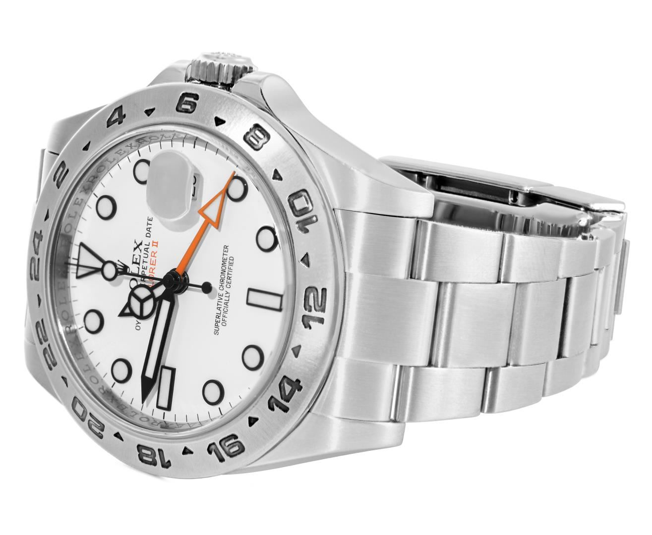 One Mens Pre Owned Stainless Steel Rolex Explorer II With Date is Polished, Serviced And Electronically Tested, Rolex Stainless Steel Case: 42mm, Rolex Stainless Steel Crown, Rolex Bezel: Stainless Steel Rotatable Bezel With Stainless Steel Insert. Crystal: Sapphire With Magnified Date Window. Rolex Movement: Automatic Winding Movement Caliber 3187. Rolex Dial: White Explorer II Dial with Luminous Index Hour Markers And Dash Track. Functions: GMT Hand. Date Window: 3 O'Clock Position Date Display, Model: Date Explorer, Quickset, Condition: G-6 Extra Fine. Rolex Bracelet: Stainless Steel Oyster Band. Bright Polish And Satin Finish. 7.0 Inch Length, Adjustable. Standard Clasp, With Rolex Logo. This Watch Comes With A Rolex Box.