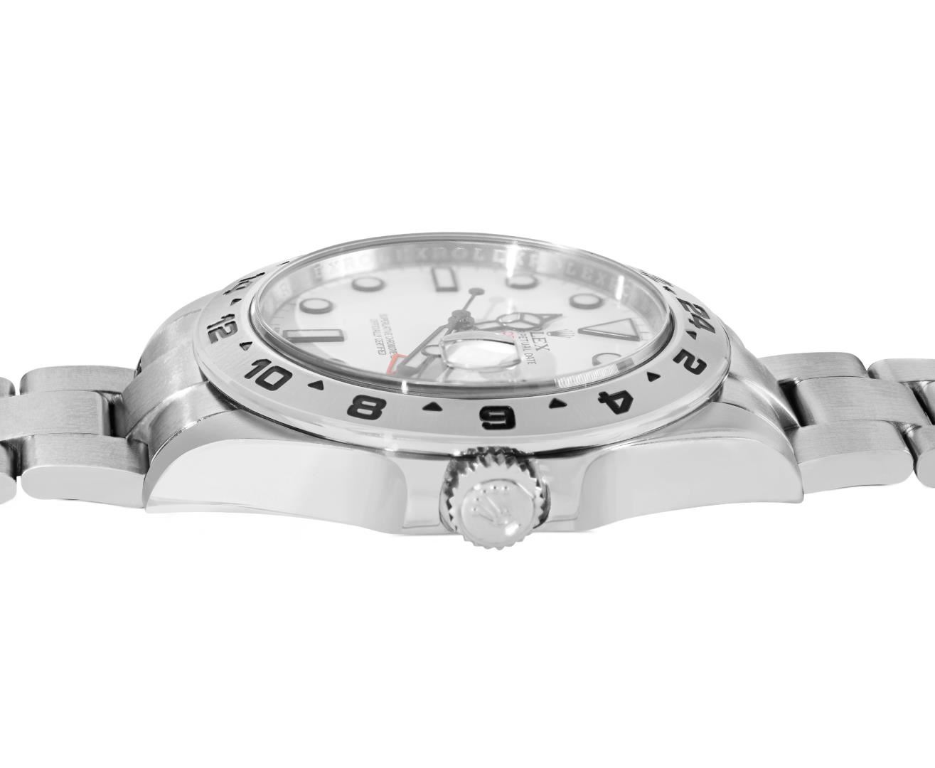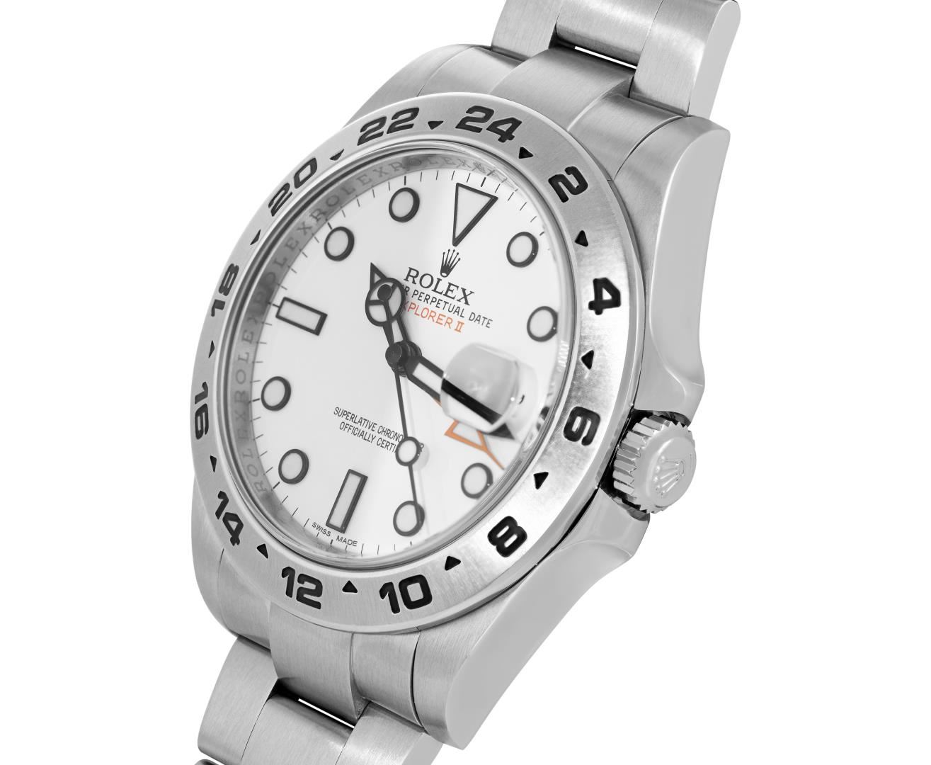 One Mens Pre Owned Stainless Steel Rolex Explorer II With Date is Polished, Serviced And Electronically Tested, Rolex Stainless Steel Case: 42mm, Rolex Stainless Steel Crown, Rolex Bezel: Stainless Steel Rotatable Bezel With Stainless Steel Insert. Crystal: Sapphire With Magnified Date Window. Rolex Movement: Automatic Winding Movement Caliber 3187. Rolex Dial: White Explorer II Dial with Luminous Index Hour Markers And Dash Track. Functions: GMT Hand. Date Window: 3 O'Clock Position Date Display, Model: Date Explorer, Quickset, Condition: G-6 Extra Fine. Rolex Bracelet: Stainless Steel Oyster Band. Bright Polish And Satin Finish. 7.0 Inch Length, Adjustable. Standard Clasp, With Rolex Logo. This Watch Comes With A Rolex Box.